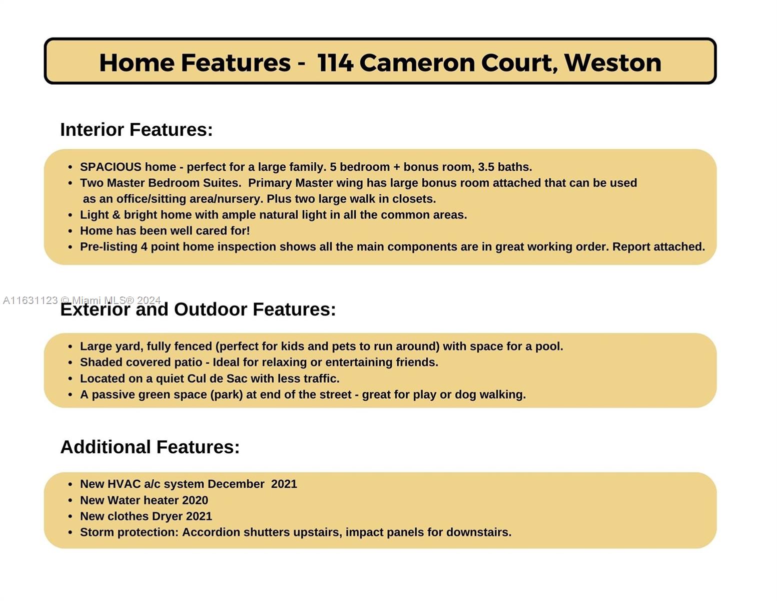 Spacious family home tucked away on a quiet CULDESAC in one of Weston's most sought after communities - The Lakes! LARGE 5 beds + bonus room, 3.5 baths, 2CG. Entertain in the wonderful backyard! Covered patio + fully fenced BIG yard perfect for kids and pets to run around - w plenty of room for a pool. Enjoy your beautiful kitchen w wood/granite/SS appliances, BAY WINDOWS & eat-in area. Generous living spaces &neutral tile flooring. A/C 2021, Water heater 2020, Dryer 2021. In a guard-gated WALKABLE neighborhood w passive parks, community pool, tot-lot, picnic area, soccer/play field, great for gatherings! Walk to A+ Weston schools incl #1 ranked elementary school in Broward! Adjacent to plaza for dining, Starbucks, groceries & more. Quick access to highways, shopping & FL beaches!