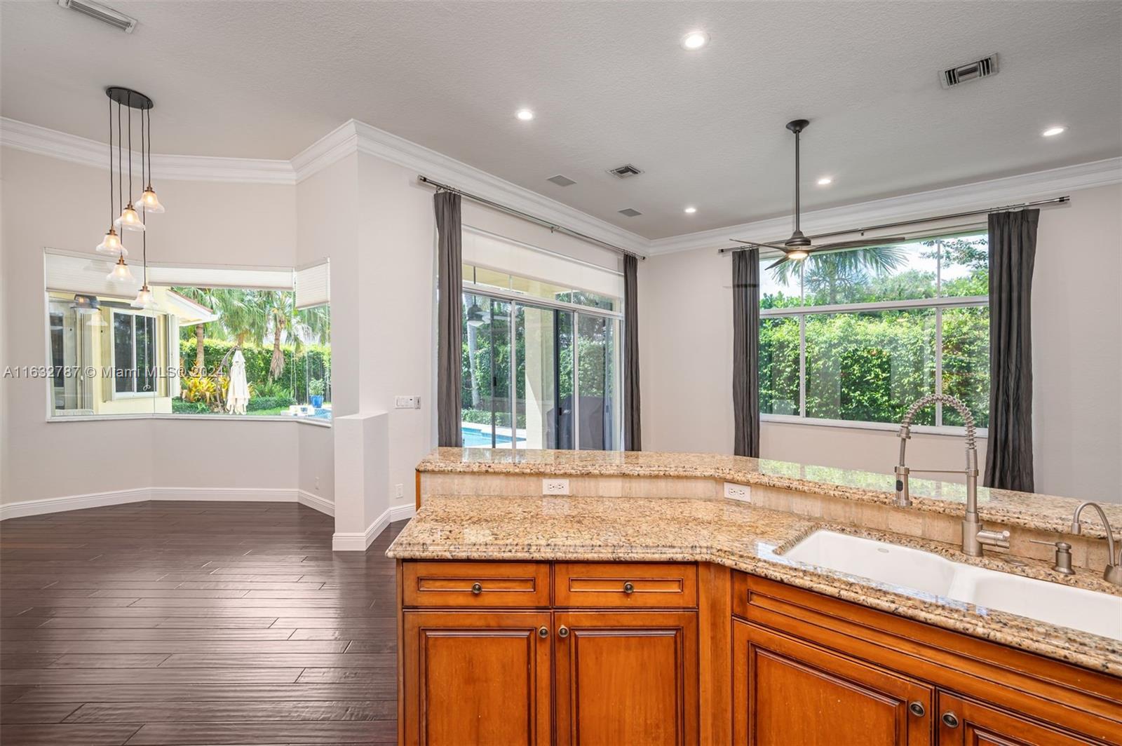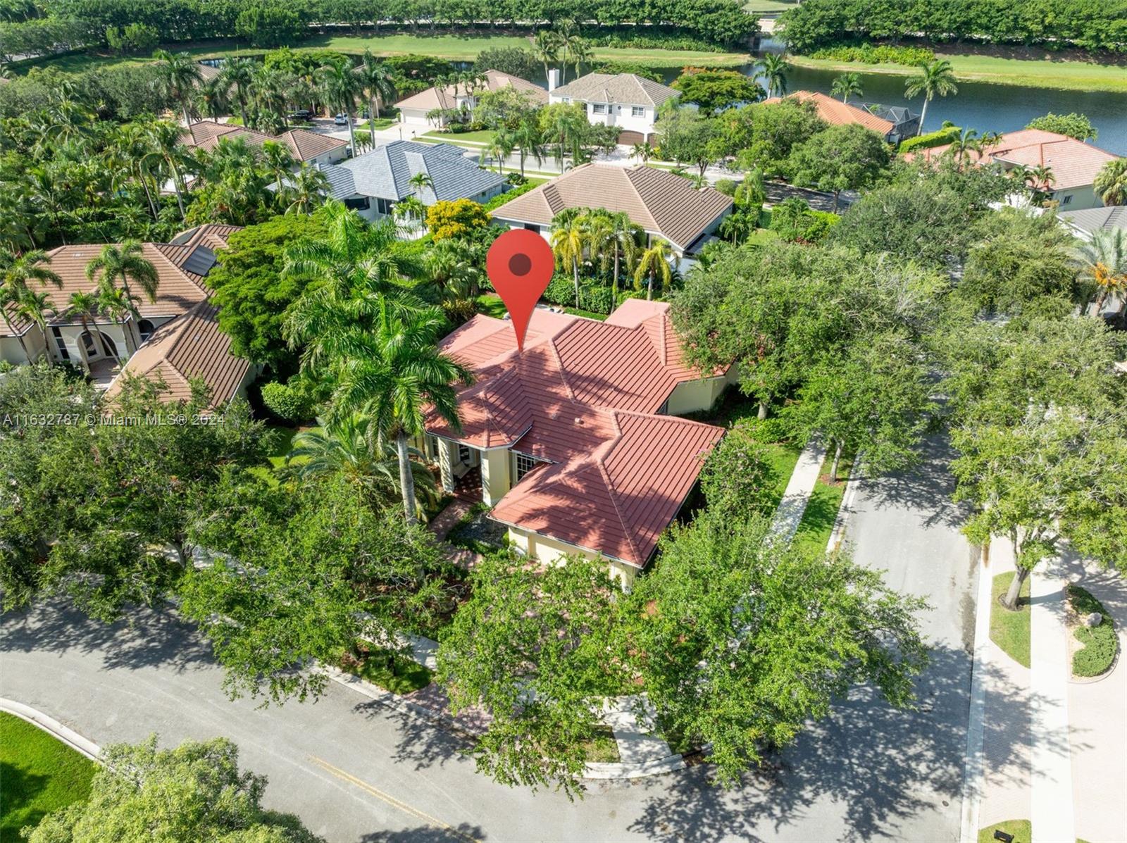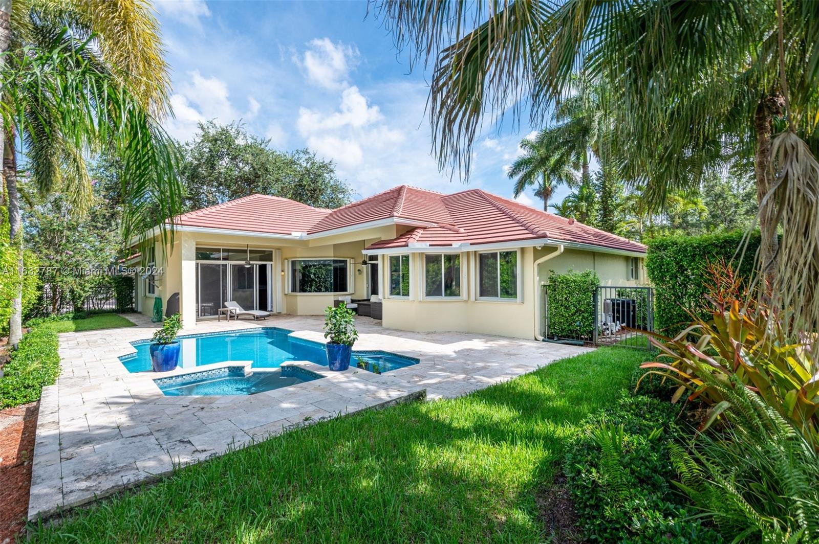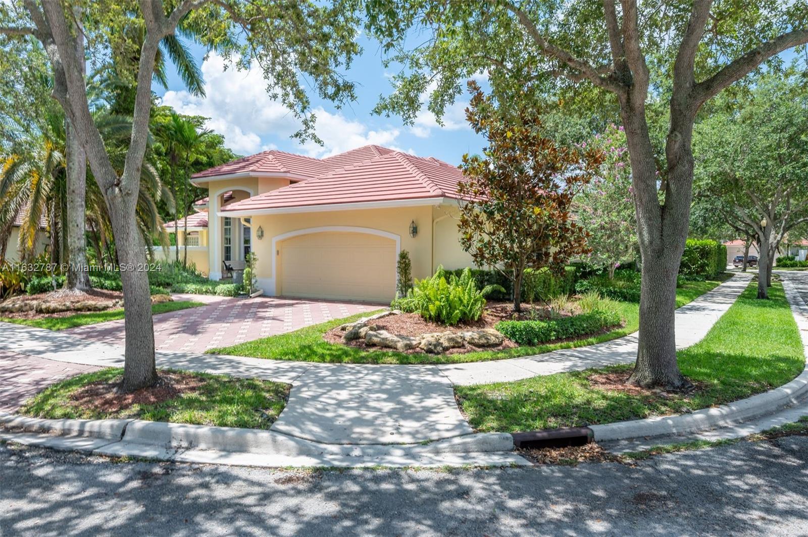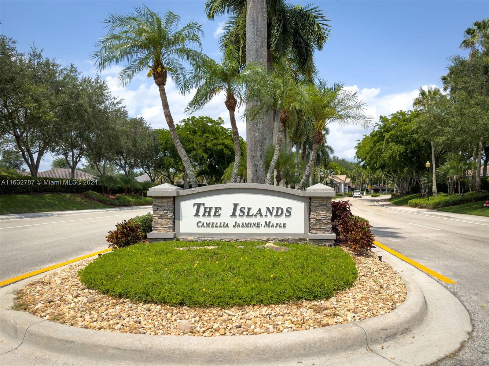 Large, one-story home located on a big corner lot in The Islands, 24-hour security guard-gated. Four bedrooms, office with built-ins, split design; three full baths & two half baths. Engineered hardwoods floors from foyer to formal living & dining areas, kitchen & family room. Main bedroom has two walk-in closets & a sitting area; main bathroom has a separate tub and two vanities & sinks. 2nd bedroom is an en-suite, 3rd & 4th bedrooms share a Jack-n-Jill bath. Half bath for guests near social areas & second half bath located by exit to pool. Modern pool & heated spa with travertine marble pavers in patio. Level 2 EV charger installed inside two-car Garage. Accordion shutters on all openings. Roof replaced in 2018 and maintained in 2023. Complete house painted inside and out in 2024.