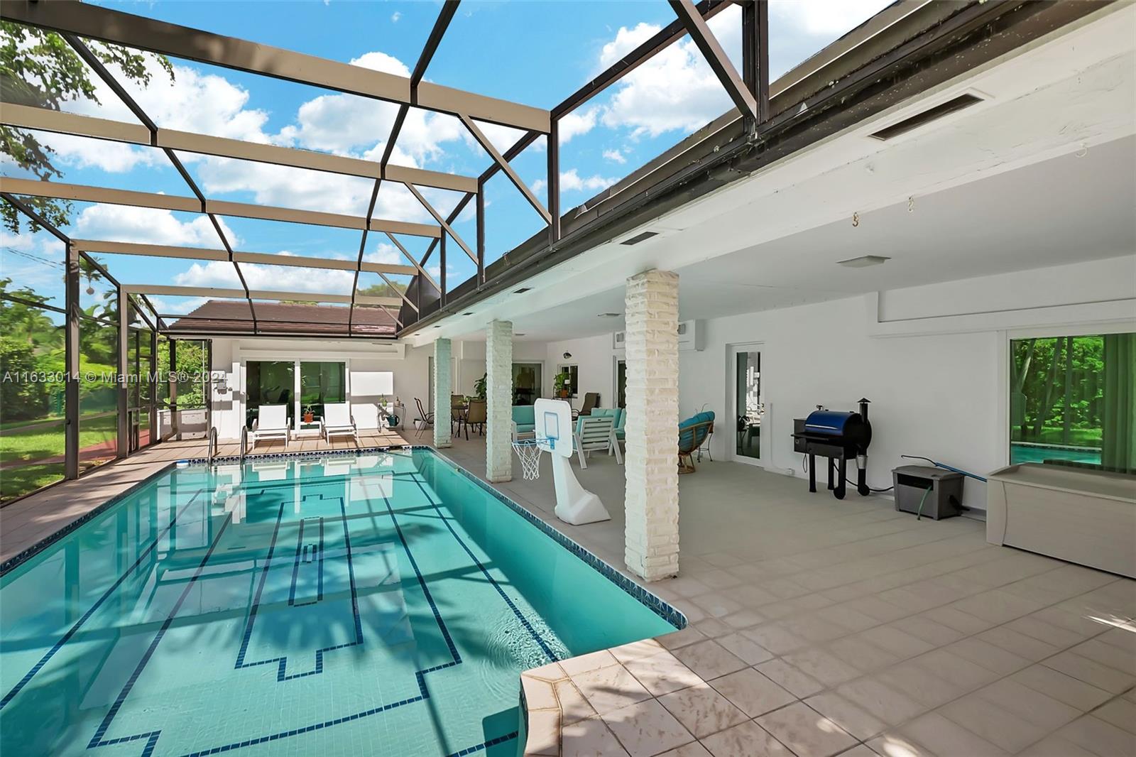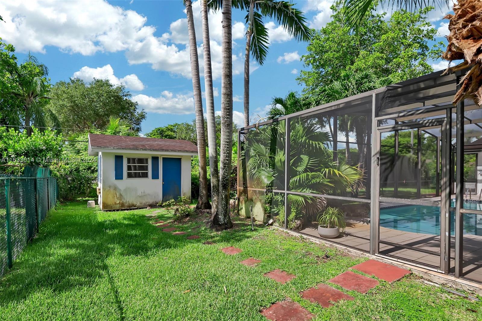 Enchanting 4 bdrm, 2 bath home in the fantastic community of Mangowood in Palmetto Bay. Adorable curb appeal w/ brick detail, charming blue shutters & cozy front porch perfect for relaxing in a rocking chair! Fabulous open concept formal living, dining rm opens to remodeled kitchen w/ eat in/snack bar, center island, walk in pantry. Large family rm overlooks the sparkling pool. Spacious indoor laundry rm w/ sink. Great, fenced backyard perfect for entertaining w/ screened pool, deep covered patio, built-in BBQ & shed. Impact windows/doors, newer vinyl flooring. Split bdrm plan. Primary suite has en-suite bath, dual sinks, combo shower/tub plus double closets. Nicely sized guest bdrms. Circular driveway, 2 car side entry garage. Close proximity to A+ schools and Coral Reef Park.