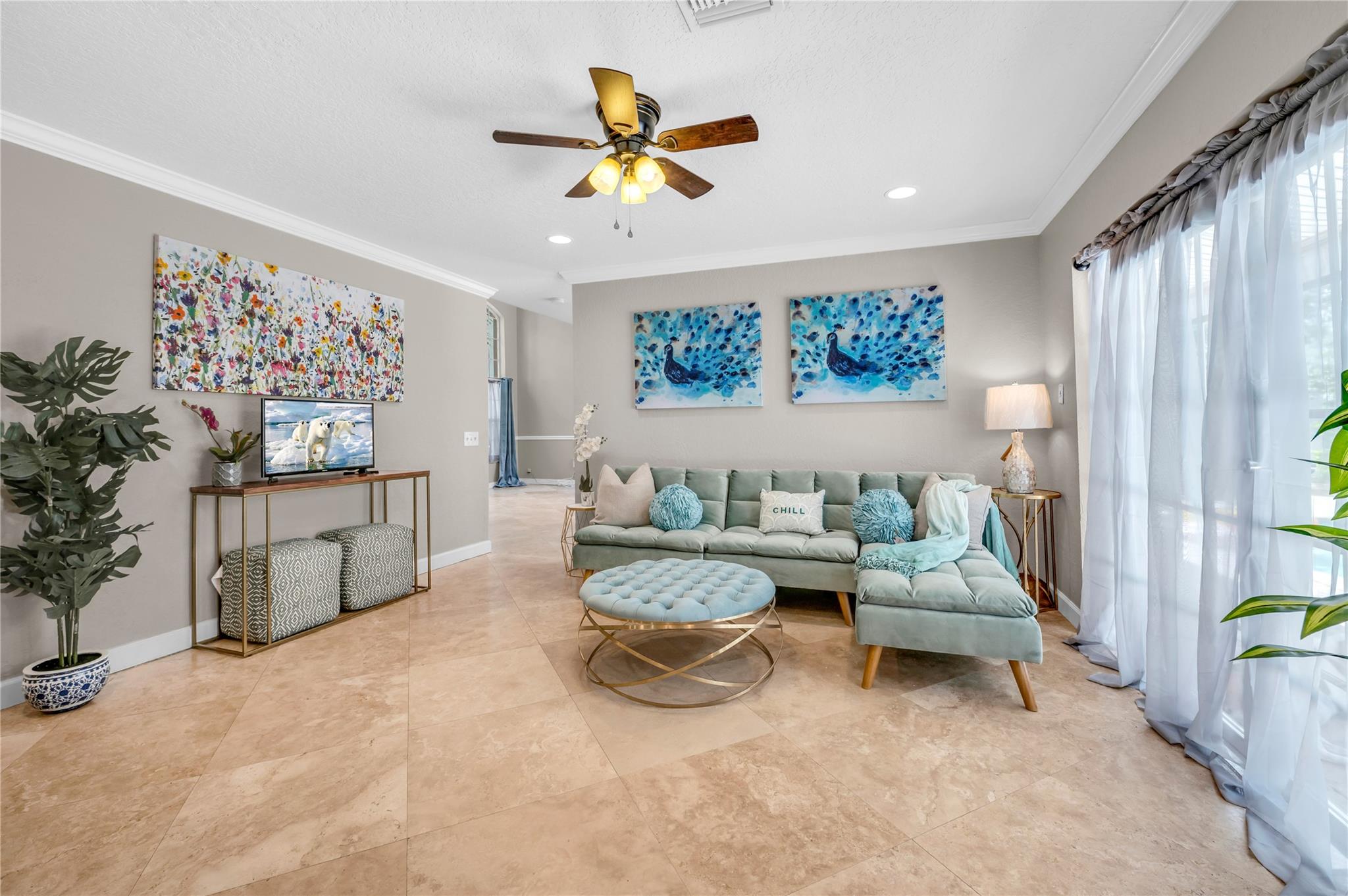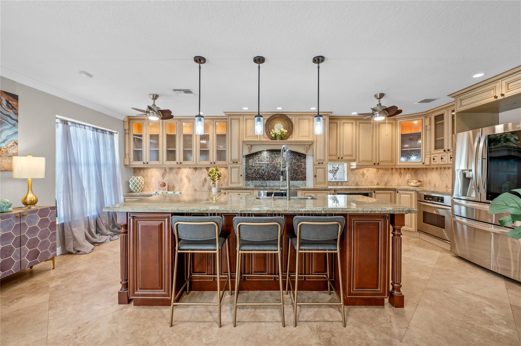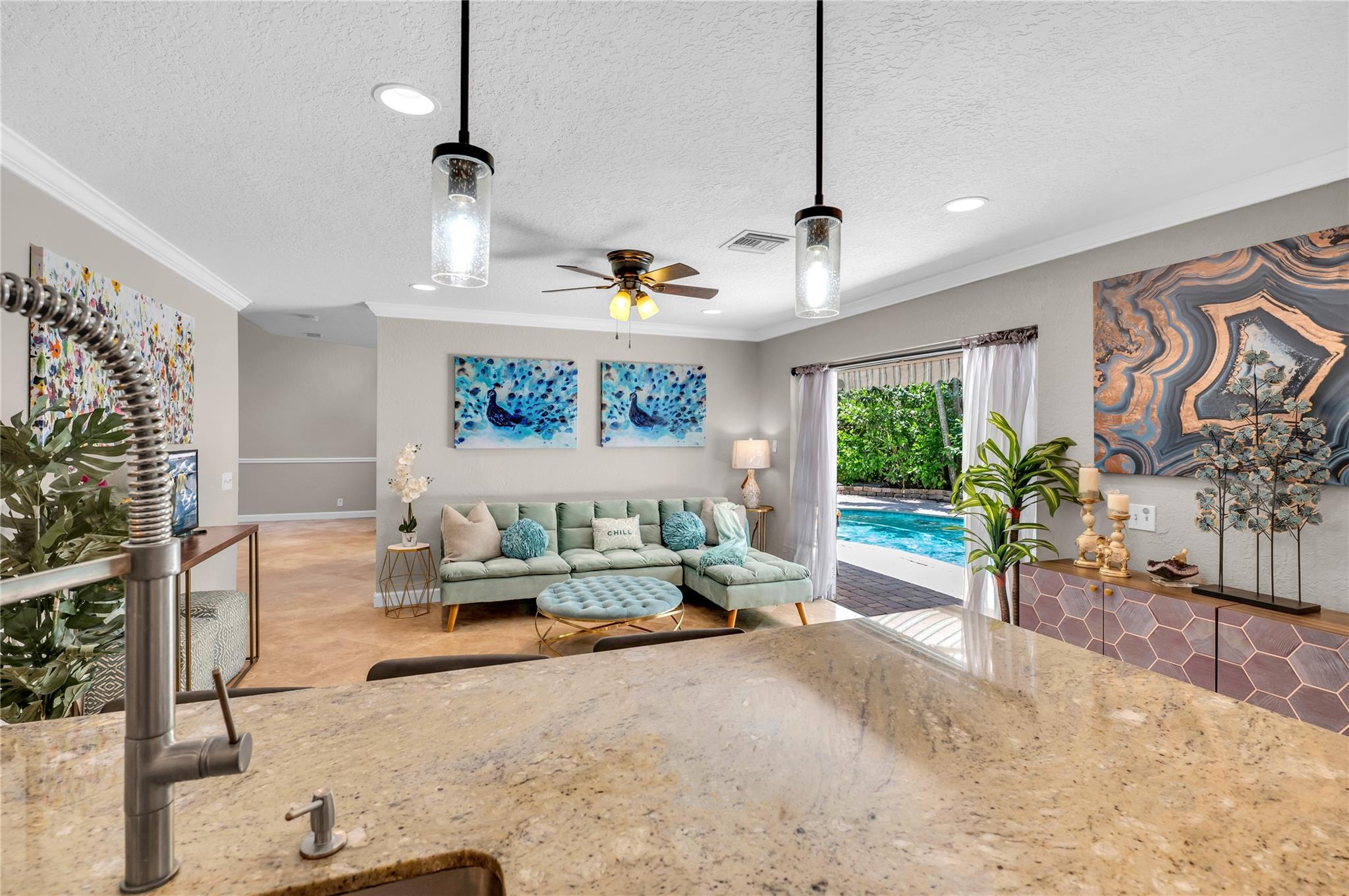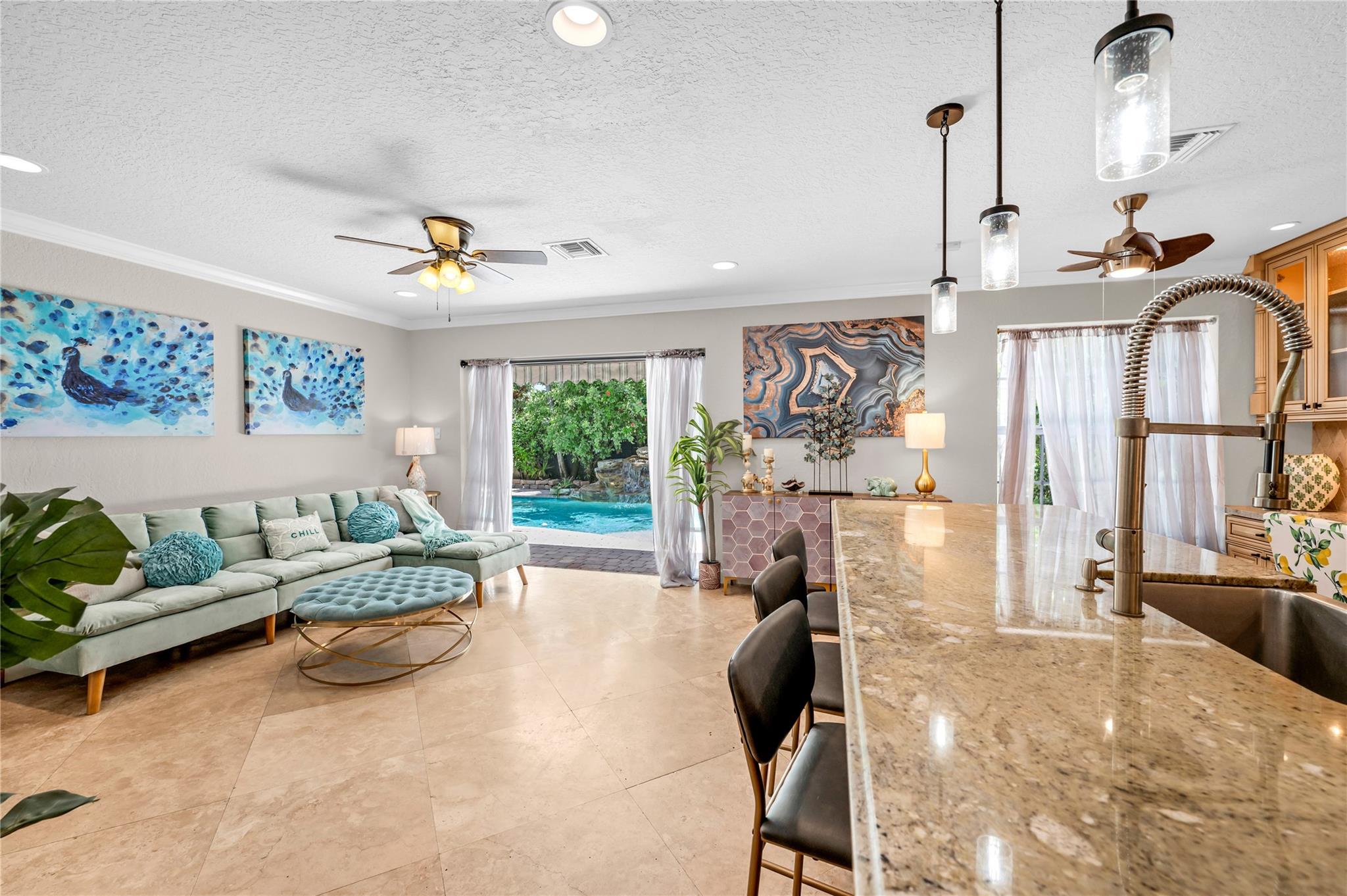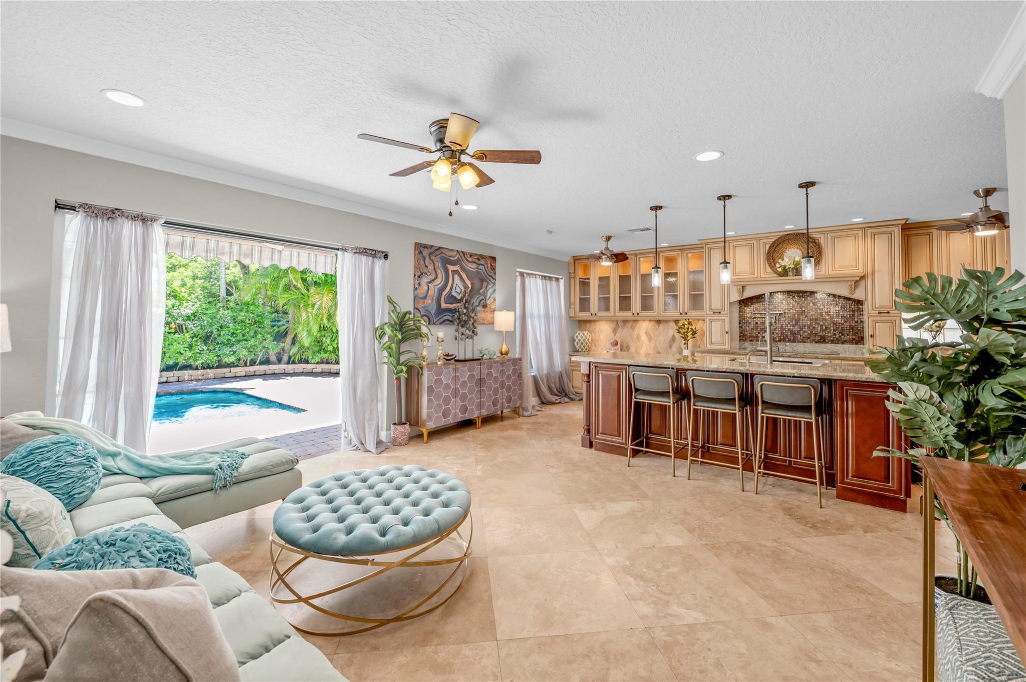 THIS IS IT! The search is over... Exquisite pool home nestled in the very desirable neighborhood of Ventana. Marvel at the vaulted ceilings from the spacious open concept living & dining areas, perfect for entertaining guests or spending quality time with family. The gourmet kitchen boasts exotic granite countertops while seeded glass enhances the built-in cabinets & desk area. The stainless-steel appliance suite with 3 ovens makes it a chef’s delight. There is no shortage of storage with the separate oversized pantry & wine room/dry bar. The spacious 2nd floor loft/office area (w/closet) connects 4 perfectly appointed bedrooms. The primary is oversized and features 2 walk-in closets & an ensuite featuring a shower & jacuzzi tub.