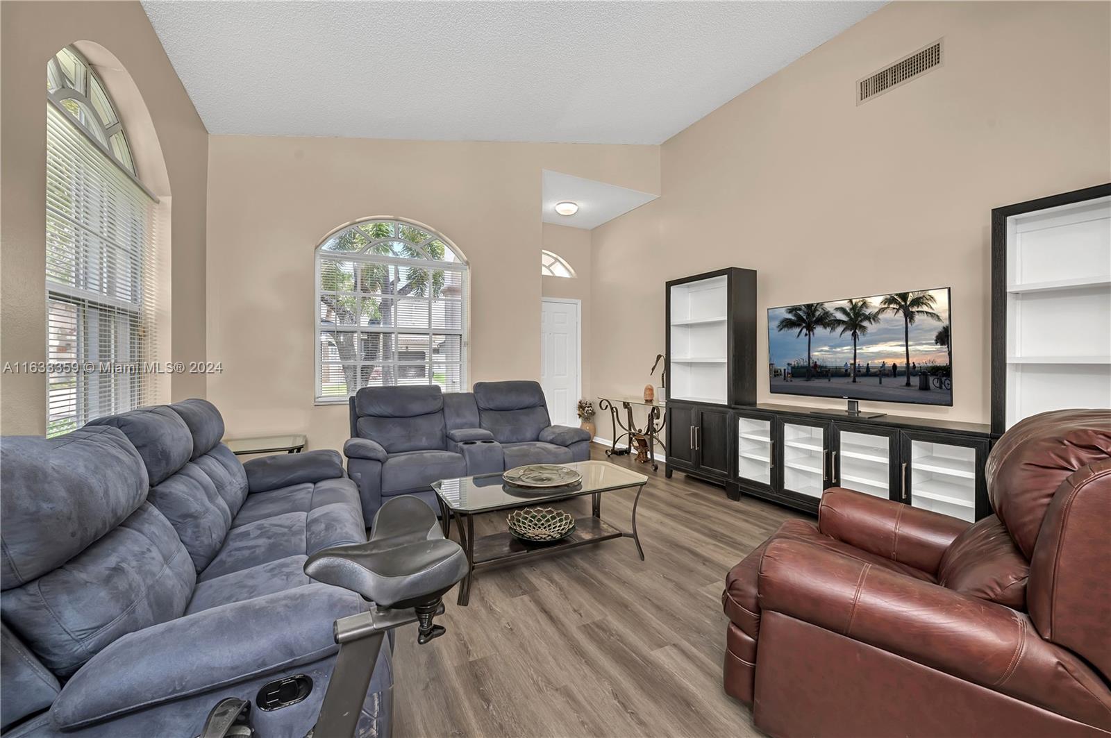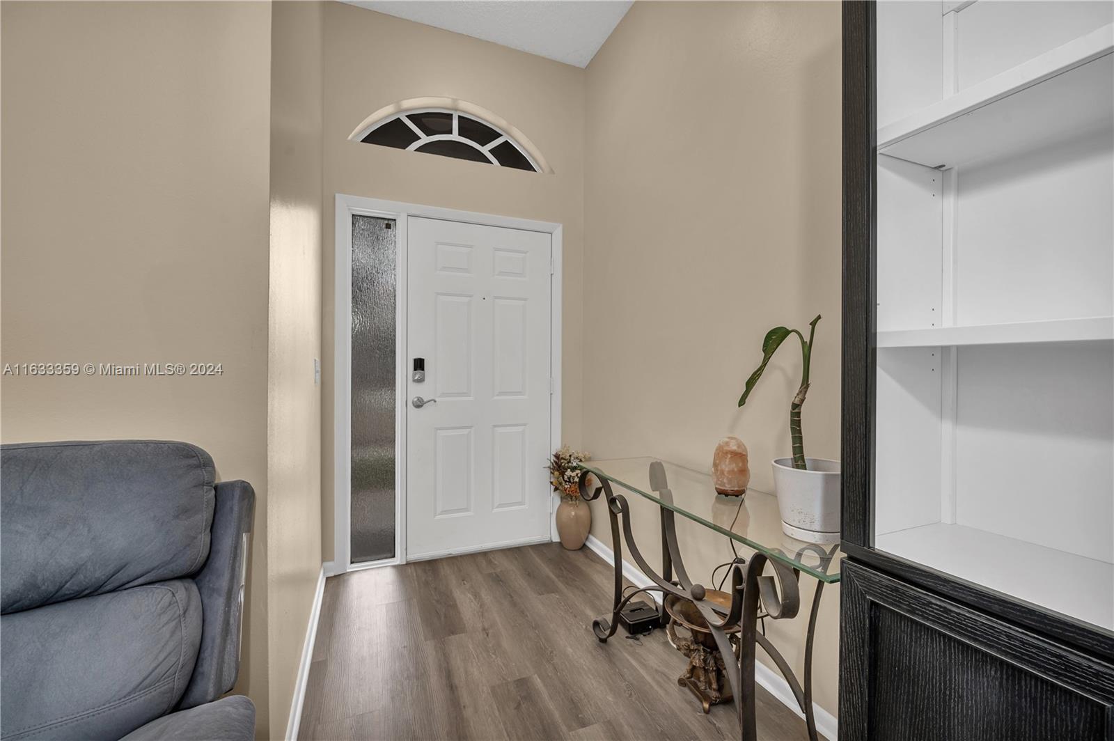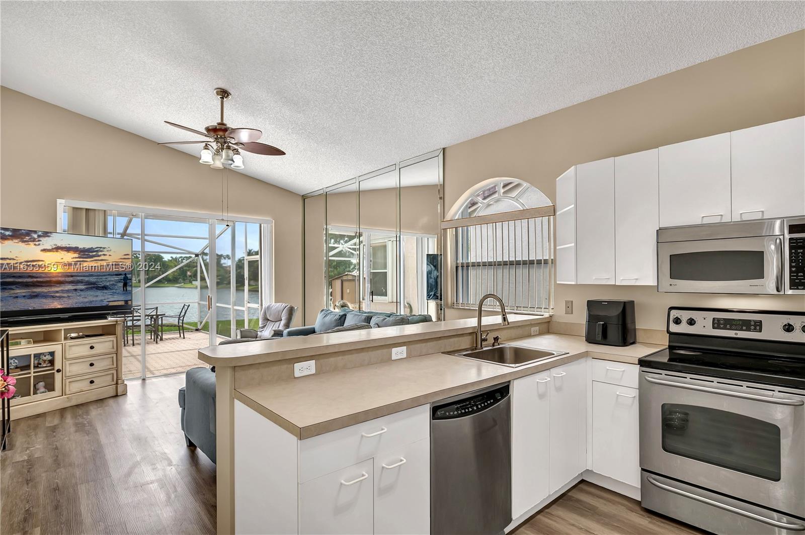 Enjoy Lakefront Living in this cozy one-story home. Nestled in the highly-desired community of Mahogany Way in Towngate, this freshly painted Lakefront home boasts high-volume ceilings and spacious living areas throughout. Situated on a generous lot, the home features new floors & new baseboards (2024), and an eat-in kitchen with incredible potential. The home is protected by accordion shutters and comes equipped with a new water heater (2024), newer A/C (2022), and a large one-car garage. Best of all, the home offers an easy-to-maintain screened-in patio with ample green areas and direct, unobstructed long lake views. Community amenities include a pool, playground, clubhouse, and more!