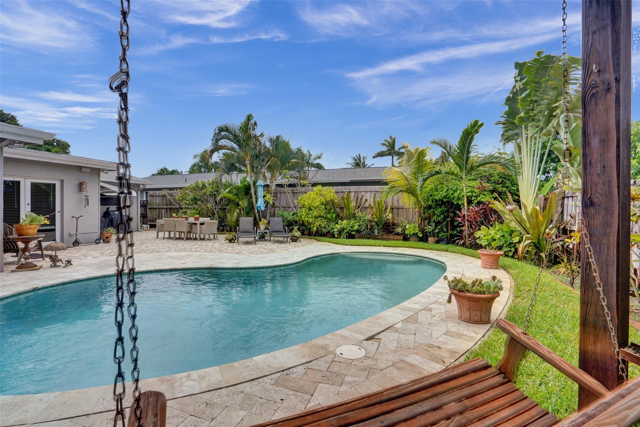 Welcome to your south Florida dream home! This beautiful 3-bed, 2-bath residence perfectly blends comfort and style. Enclosed Florida room is the 3rd bedroom, currently used as a den. With a 1-car garage and a stylish paved circular driveway you will have plenty of room to park all your vehicles. Featuring an updated kitchen and a dedicated laundry room including washer and dryer, the true highlight of this home is the stunning fenced backyard, complete with a sparkling pool and a solid wood swing bench making it perfect for entertaining and relaxation. Located in a serene and convenient neighborhood of Hollywood Hills, you’ll be just a short walk from schools, shops, and places of worship. Don't miss this incredible opportunity—call now and make this dream home yours!