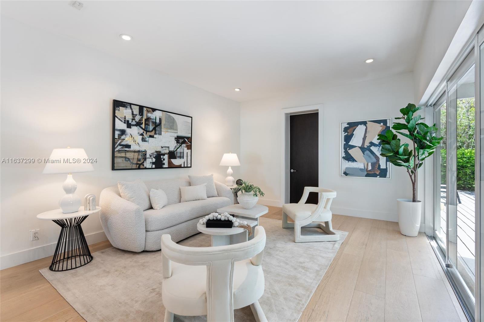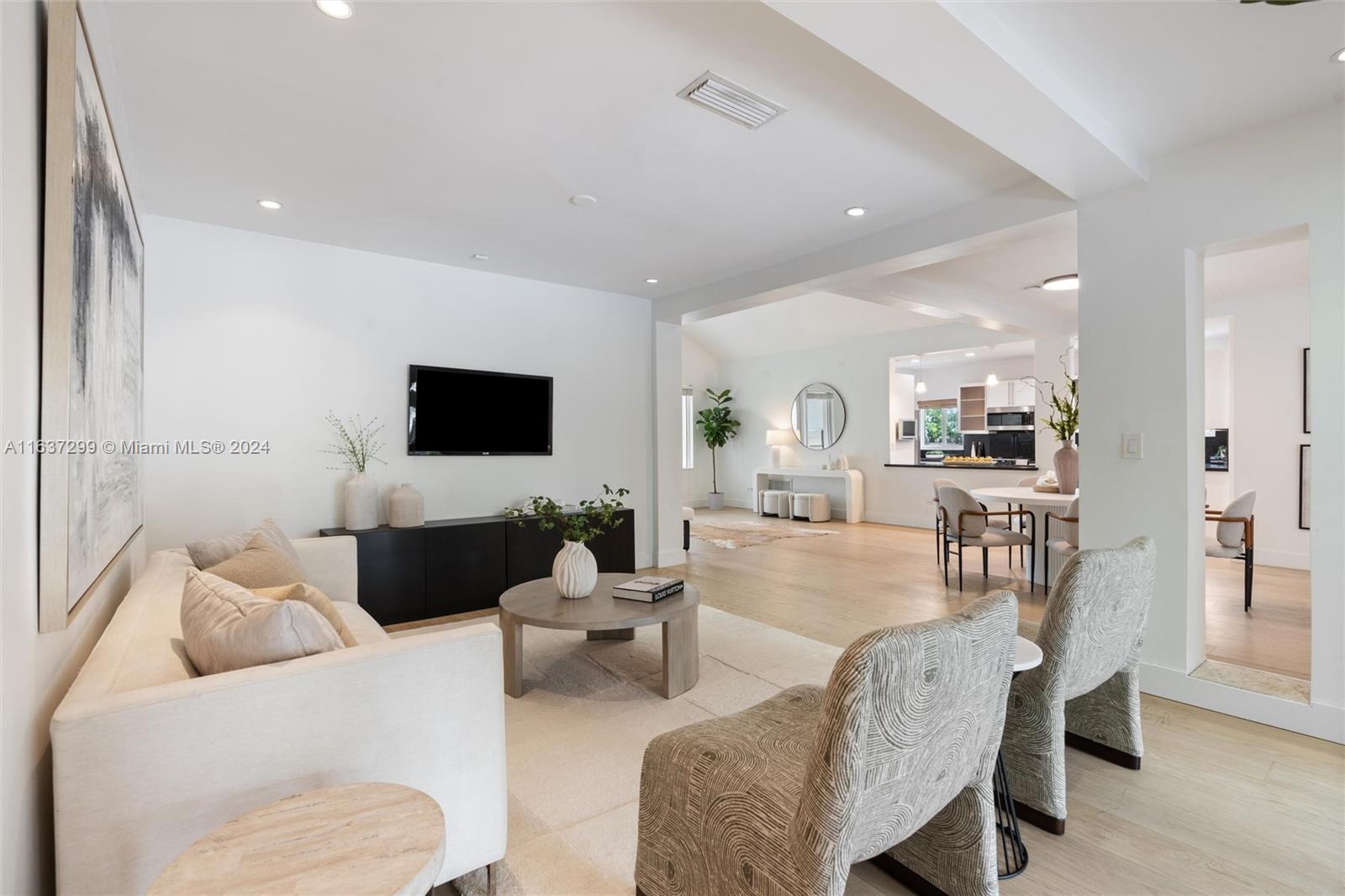 Welcome to this modern Art Deco home on prestigious La Gorce Drive. Spacious layout, open-concept design, new impact windows/doors, and wide plank hardwood floors blend elegance with functionality. Two living areas and an expansive dining area provide ample pace for relaxation and entertaining. Four bedrooms, three full baths (including elegant primary spa-bathroom), and split bedroom floor plan provide privacy and comfort. Sliding glass doors lead to covered Ipe wood deck and saltwater heated pool, offering seamless indoor/outdoor living. Lush landscaping creates serene backyard oasis. Convenient location on quiet street, less than a mile walk to beach, easy access to Miami Beach amenities and A-rated schools. A lifestyle of luxury and convenience awaits in this wonderful home!