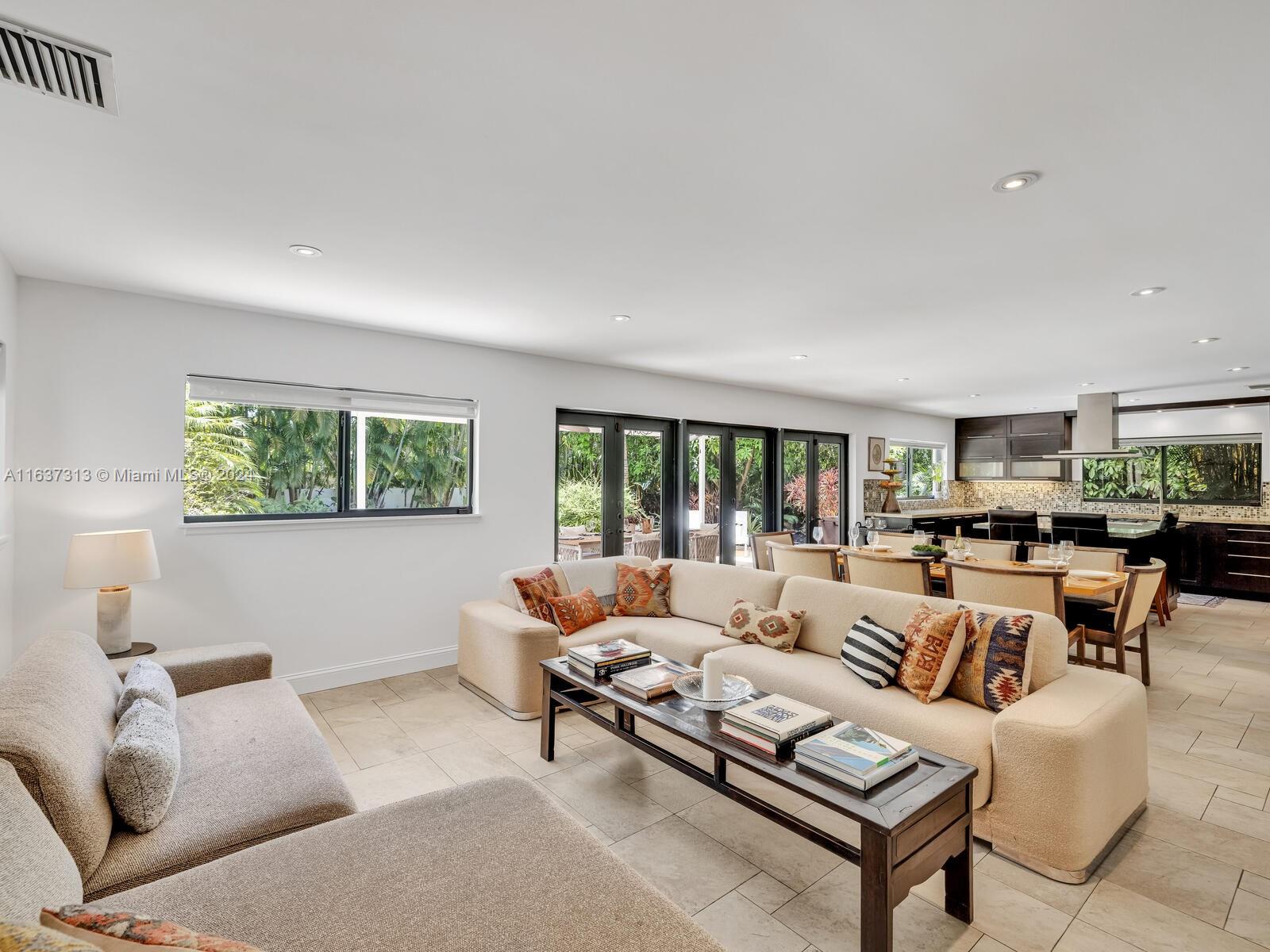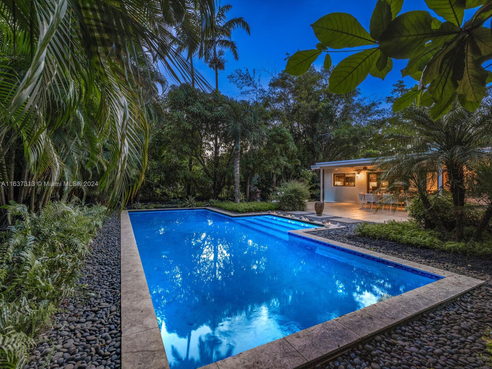 Welcome to Shores Garden Oasis! Timeless luxury awaits you in this beautifully updated tropical retreat on a massive 12,800 SF lot. Enter into gorgeous, cypress beam vaulted formal living with pass-through gas fireplace to open-flow living, dining and kitchen, overlooking lush tropical native gardens and a sparkling 36’ lap pool. Privacy galore with two spacious guestrooms and dreamy main suite retreat with double vanity, walk-in shower bathroom, and French doors to the rear gardens. Great features: entertainment room leading to large, covered patio; impact windows-doors; large gas range kitchen with oversized cooking island; butler pantry/wet bar; interior laundry; and one-car garage. All just a couple blocks to downtown Miami Shores on a quiet tree-lined street in a non-flood zone.