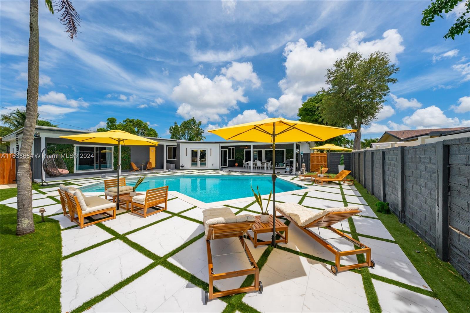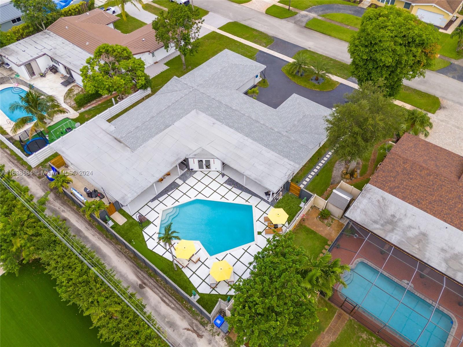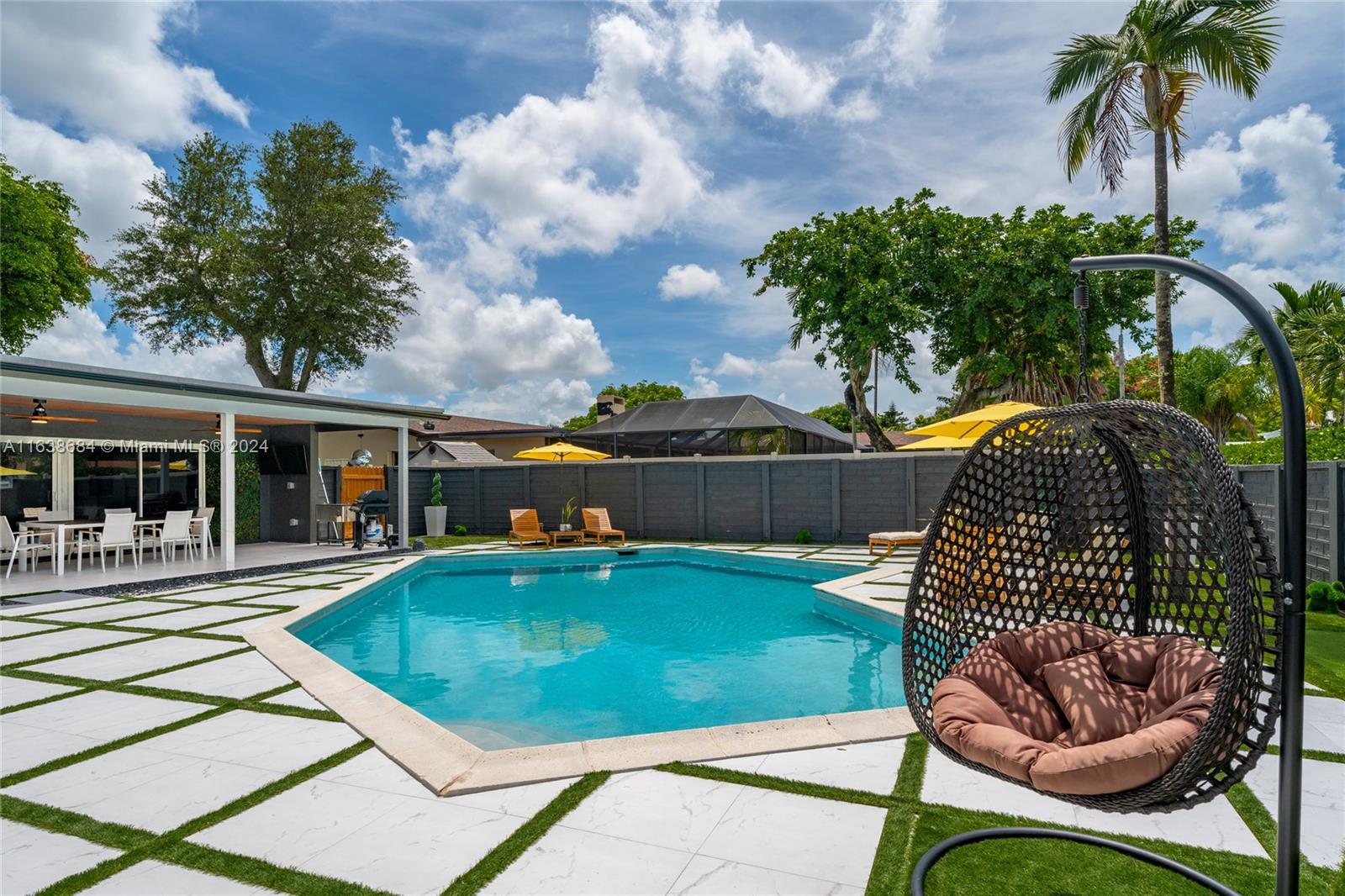 Welcome to this classic renovated 5 BD / 4 BA mid-century pool home, exuding a luxurious Palm Springs vibe. Nestled in Hollywood Hills, this gorgeous home boasts one of the largest lots in the neighborhood, and a resort-style rear yard complete with oversized pool, pristine putting green, outdoor TV, elegant covered Florida room, and cabana bath with relaxing sauna. The expansive primary bedroom offers a stunning view of the pool. Four additional spacious bedrooms and a fully renovated, state-of-the-art kitchen. Enjoy new porcelain floors throughout, spacious two-car garage, and brand-new, high-impact windows and doors. Recent updates include new roof, modern pool lining, and advanced electrical system. Don't miss this opportunity!