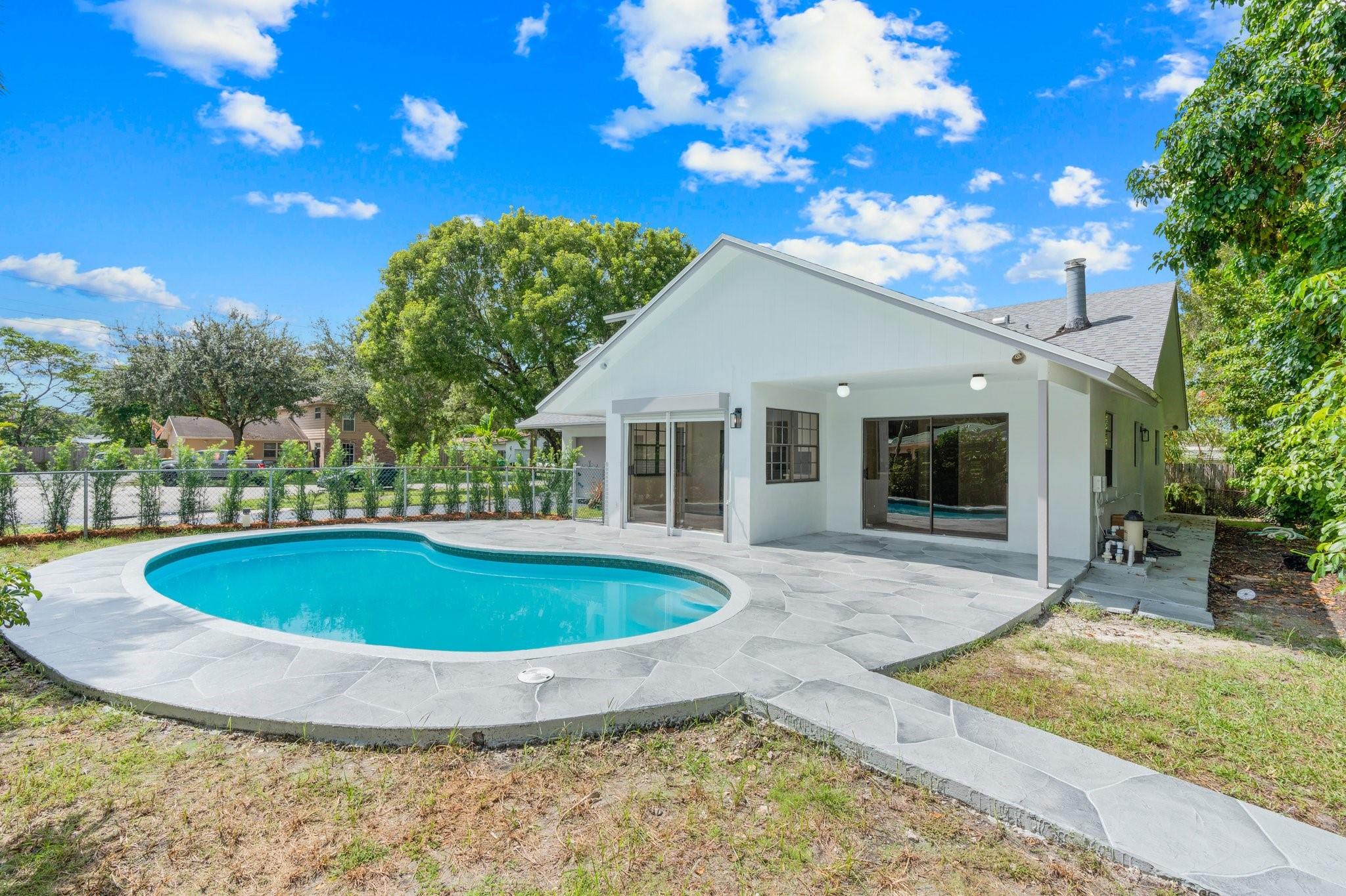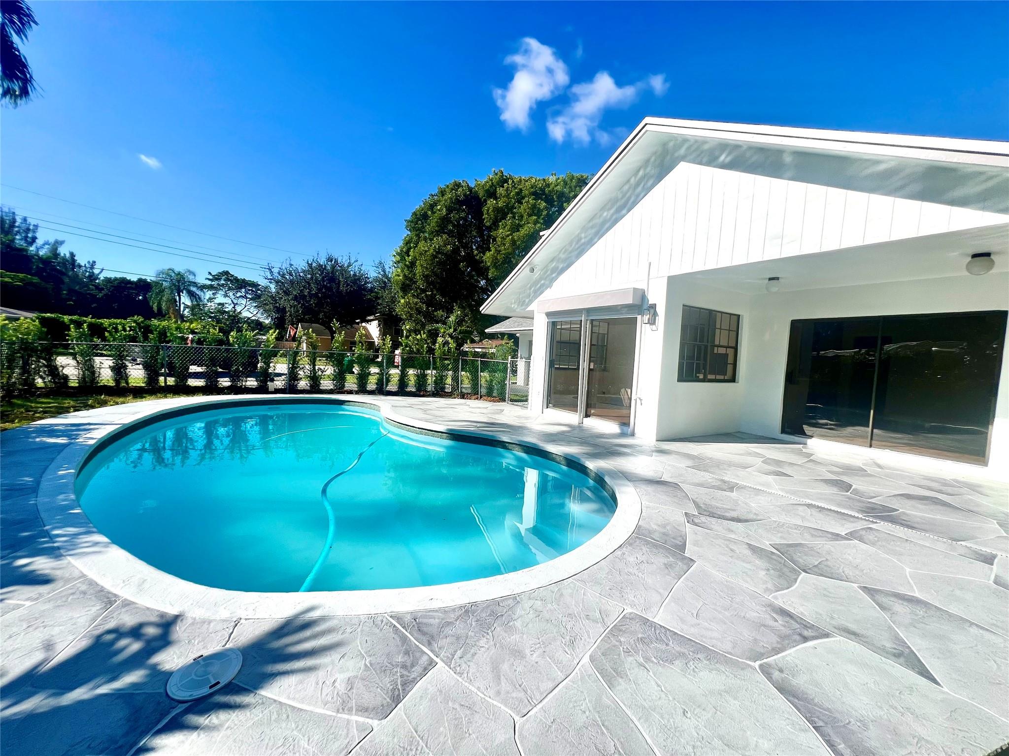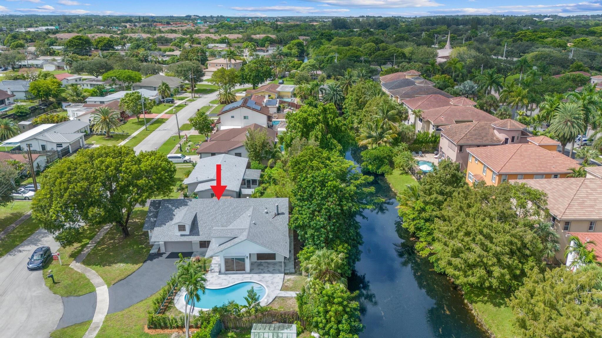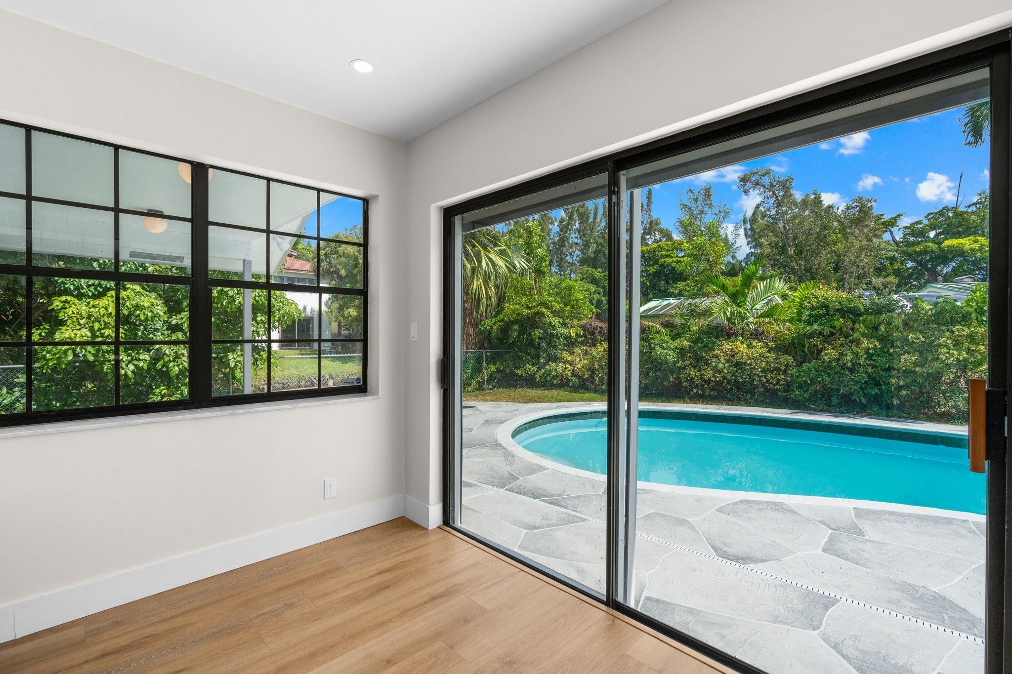This home can easily be split into a 2/1 and 1/1 with separate entrance if you desire. Looking for the perfect blend of luxury and comfort? This 3 bed, 2 bath waterfront home with a garage and separate office space is the one! Enjoy stunning views of the pool and dock from the newly redone pool deck. The interior boasts high volume ceilings, an open concept kitchen and living area, and wood look flooring. The primary bedroom is a serene retreat with a walk-in closet, private bathroom, and separate vanity/make-up area. The backyard is fully fenced for privacy and features a covered patio and pool. Located on a quiet cul-de-sac and just minutes from American Heritage Academy. This home has it all! No HOA! Property has partial hurricane windows and a power shutter for the pool sliding door.