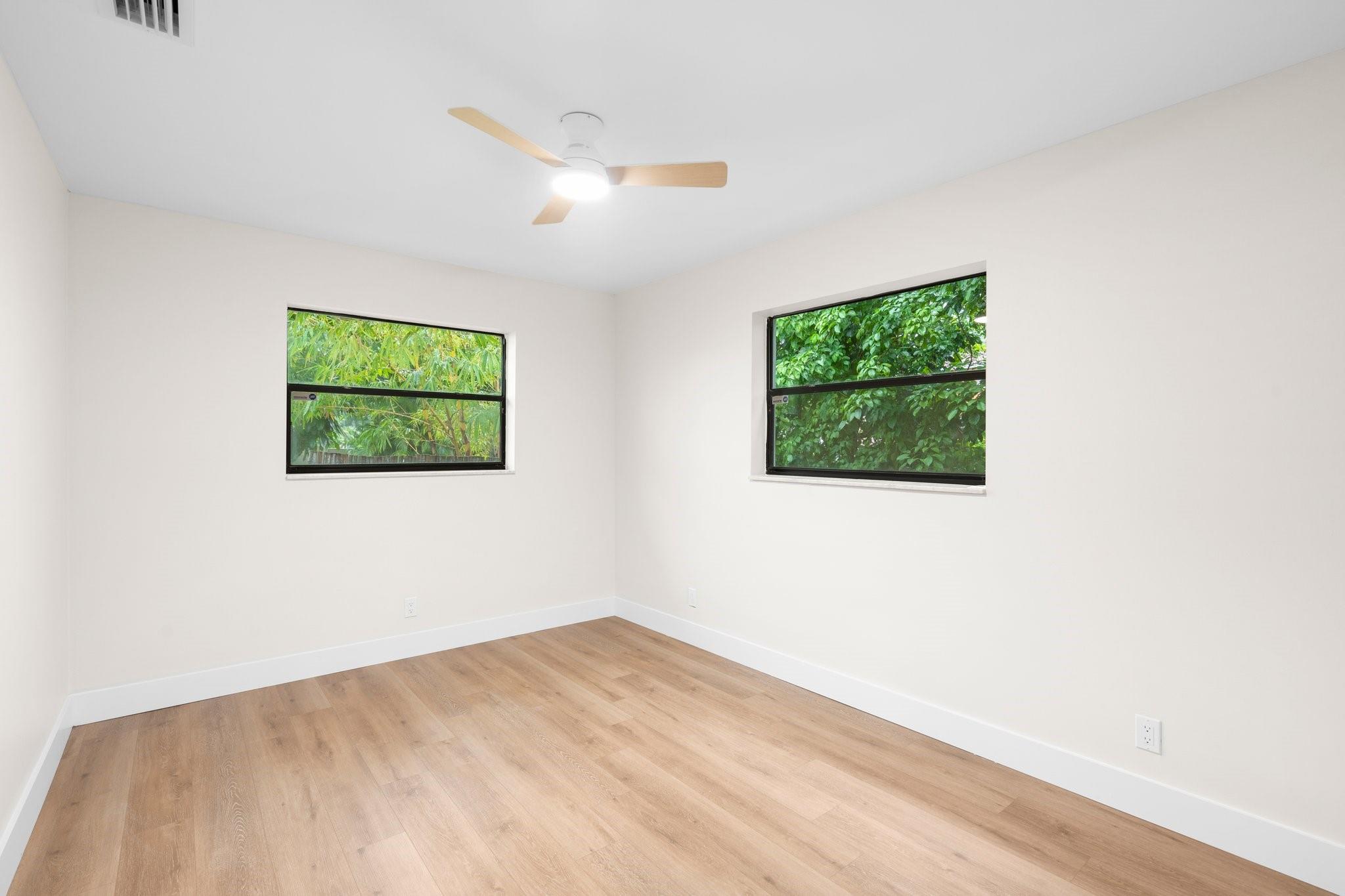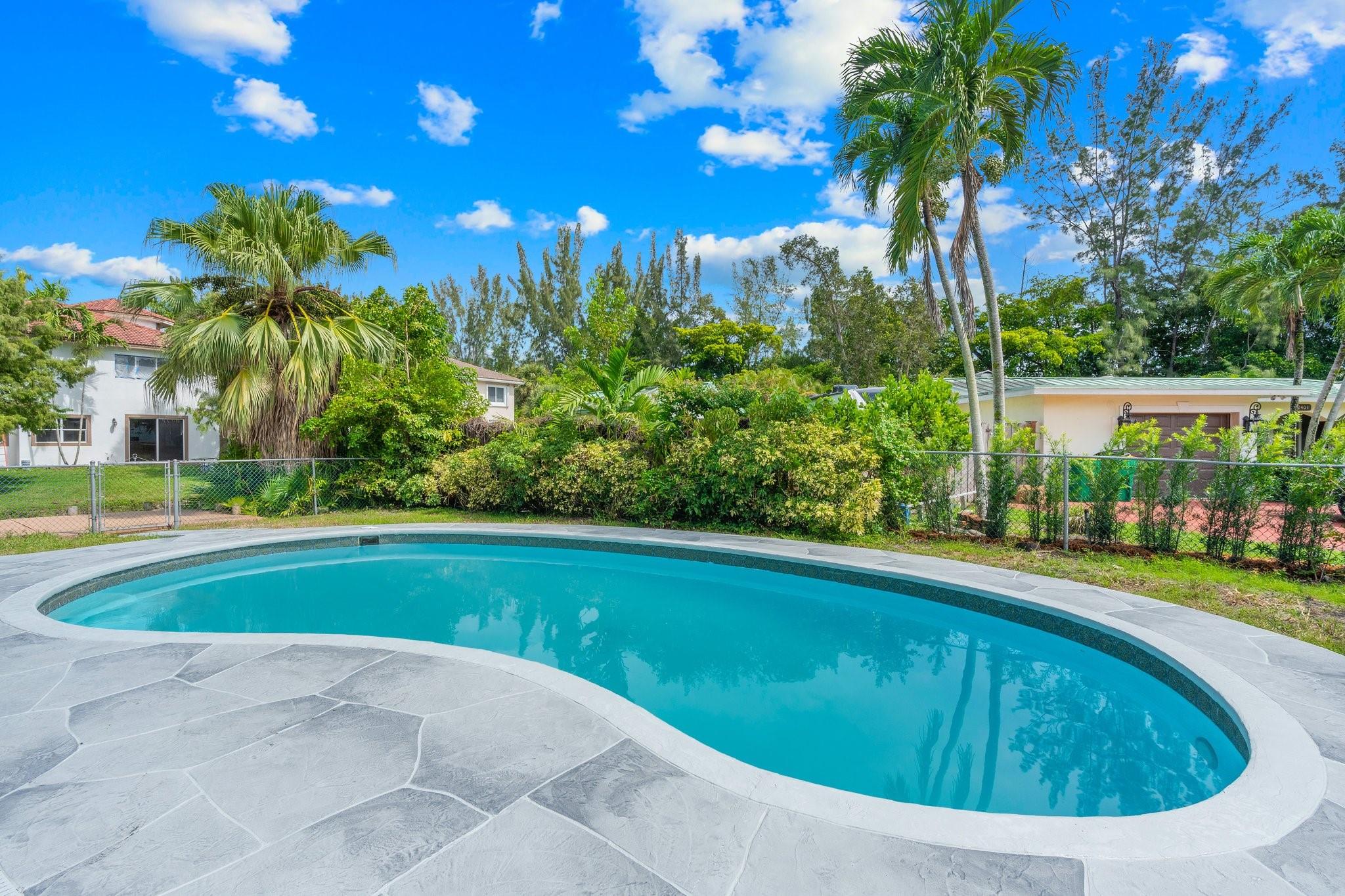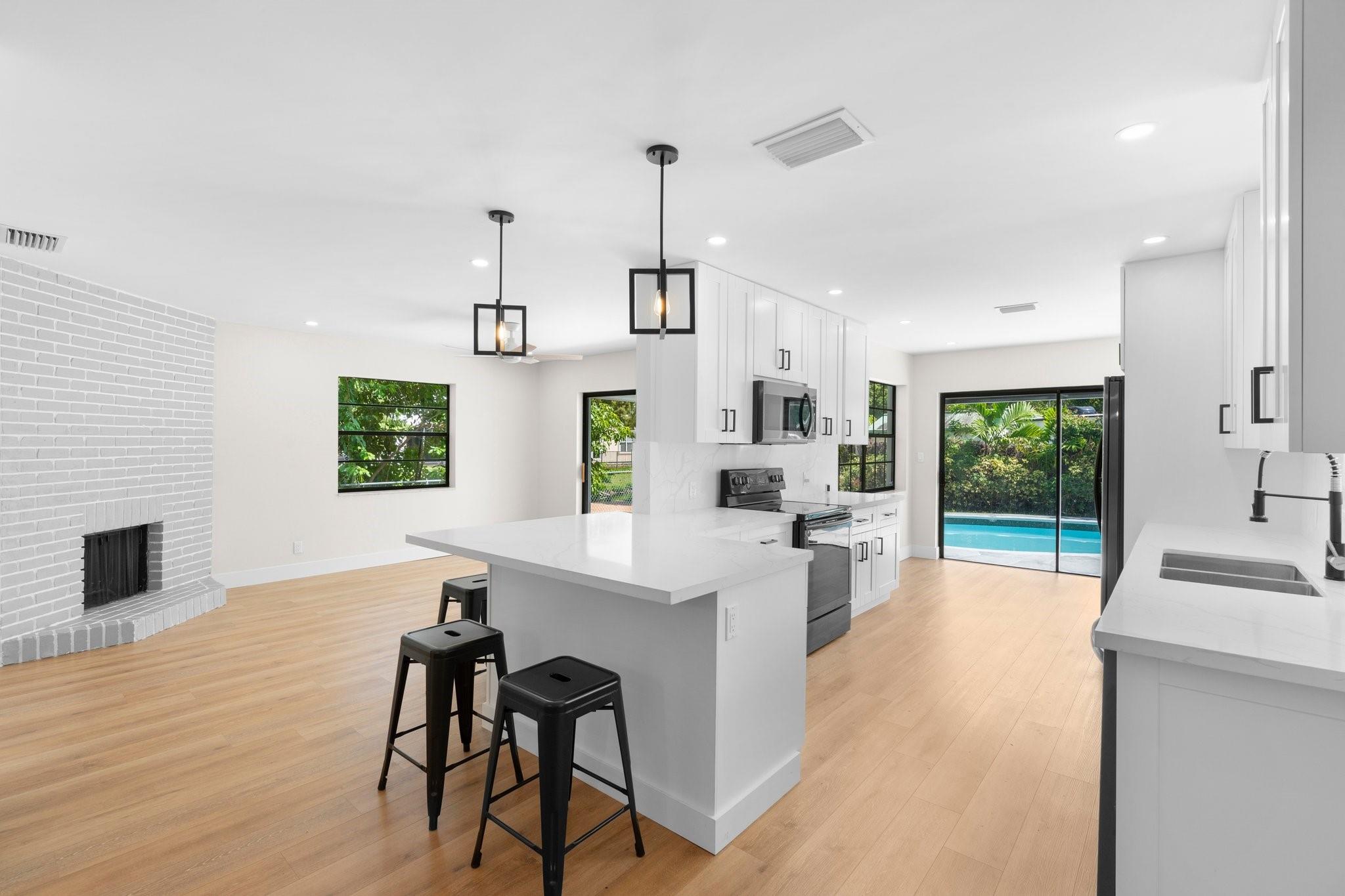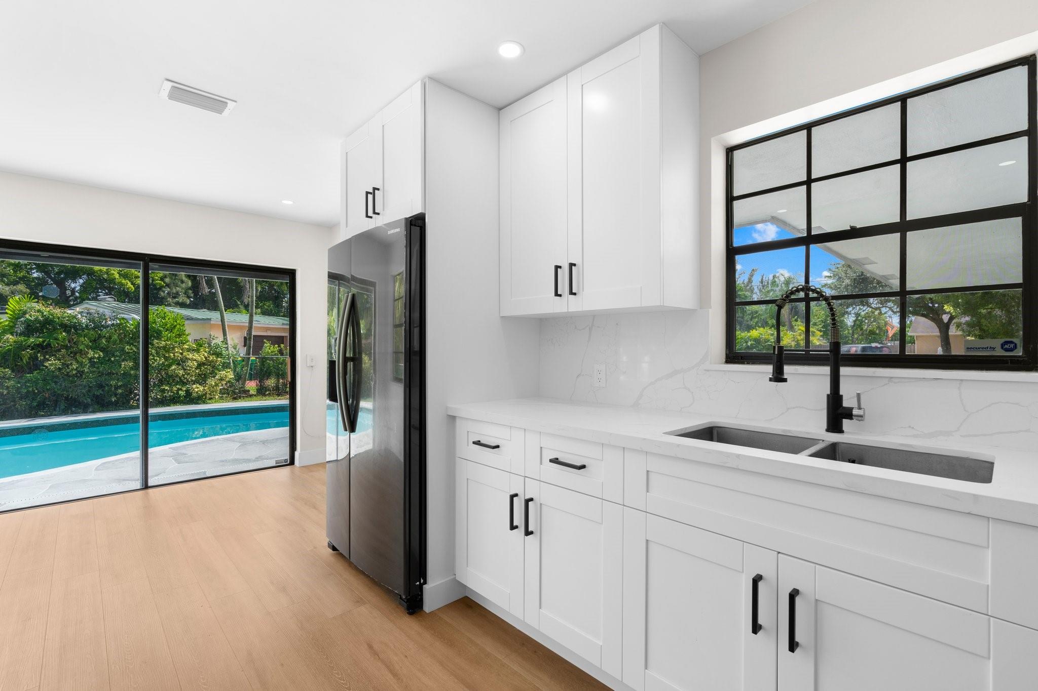 This home can easily be split into a 2/1 and 1/1 with separate entrance if you desire. Looking for the perfect blend of luxury and comfort? This 3 bed, 2 bath waterfront home with a garage and separate office space is the one! Enjoy stunning views of the pool and dock from the newly redone pool deck. The interior boasts high volume ceilings, an open concept kitchen and living area, and wood look flooring. The primary bedroom is a serene retreat with a walk-in closet, private bathroom, and separate vanity/make-up area. The backyard is fully fenced for privacy and features a covered patio and pool. Located on a quiet cul-de-sac and just minutes from American Heritage Academy. This home has it all! No HOA! Property has partial hurricane windows and a power shutter for the pool sliding door.