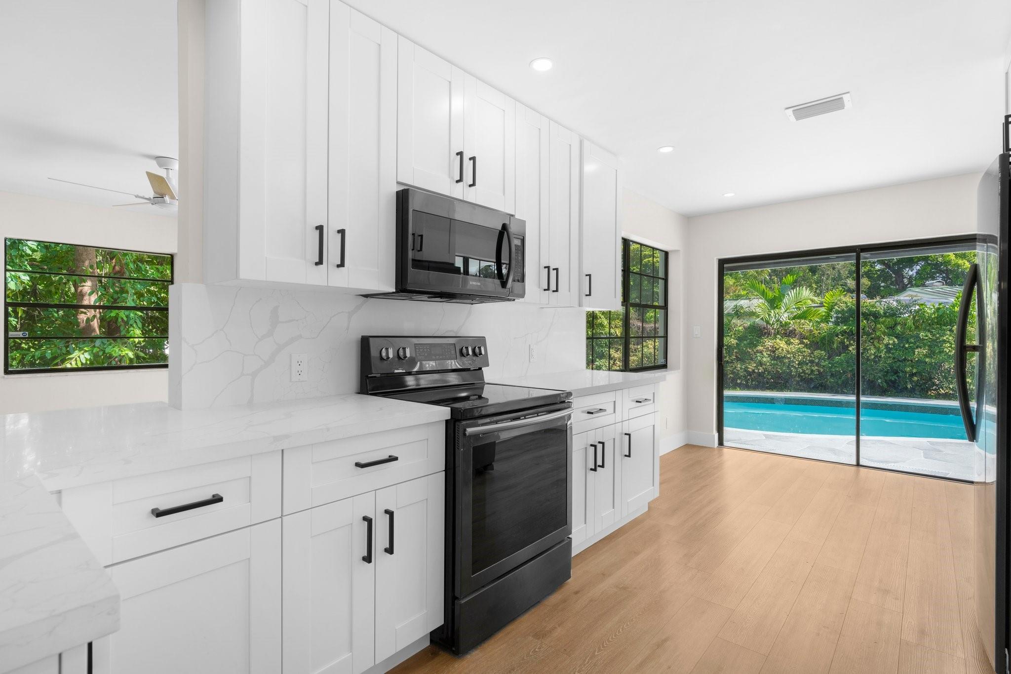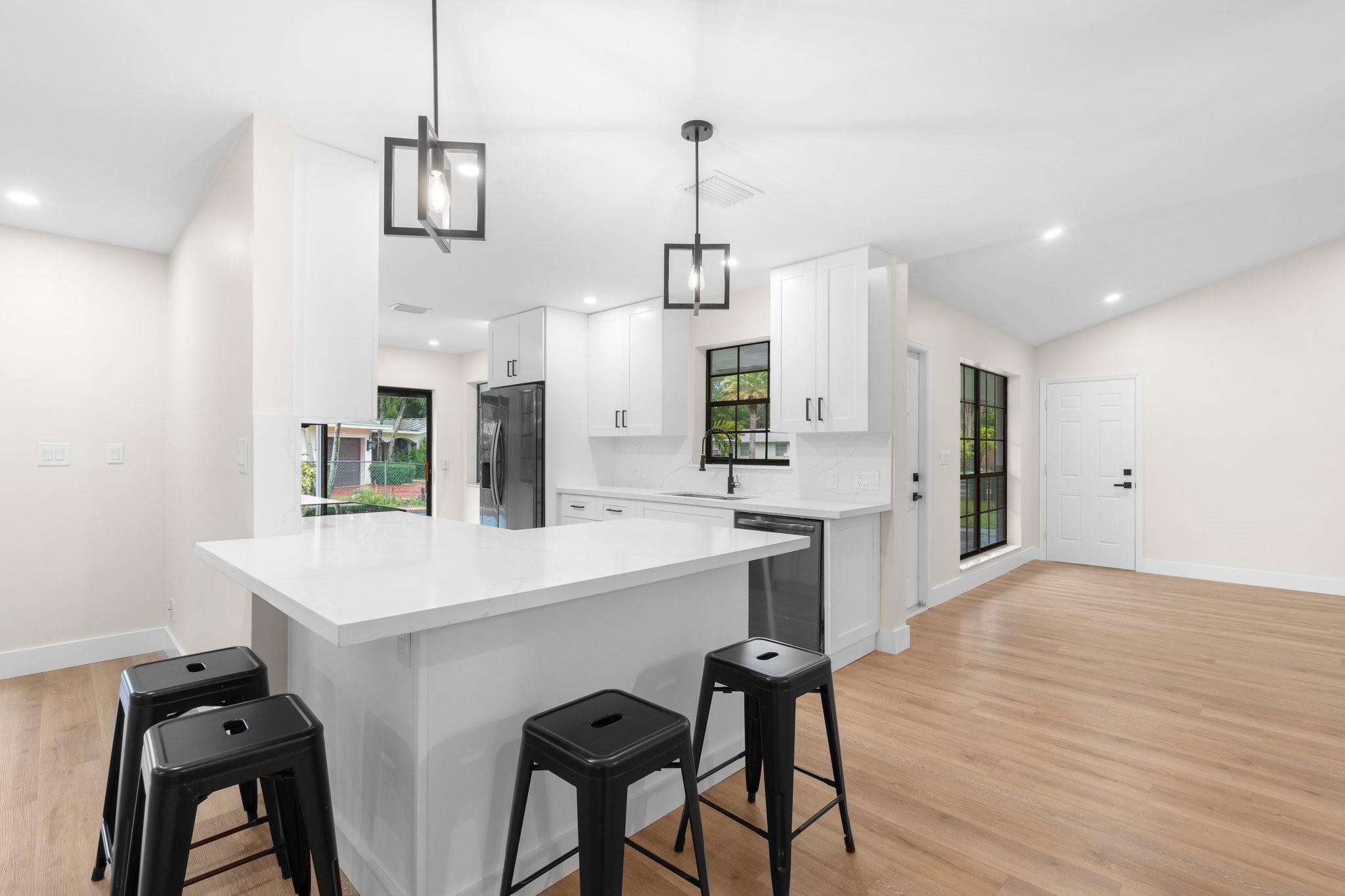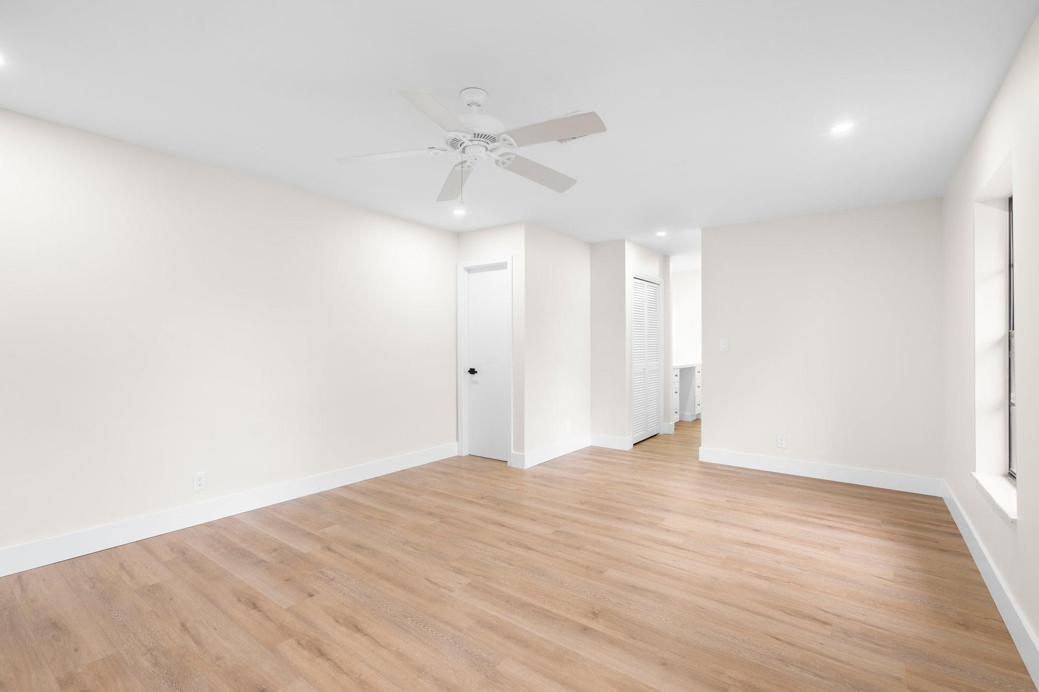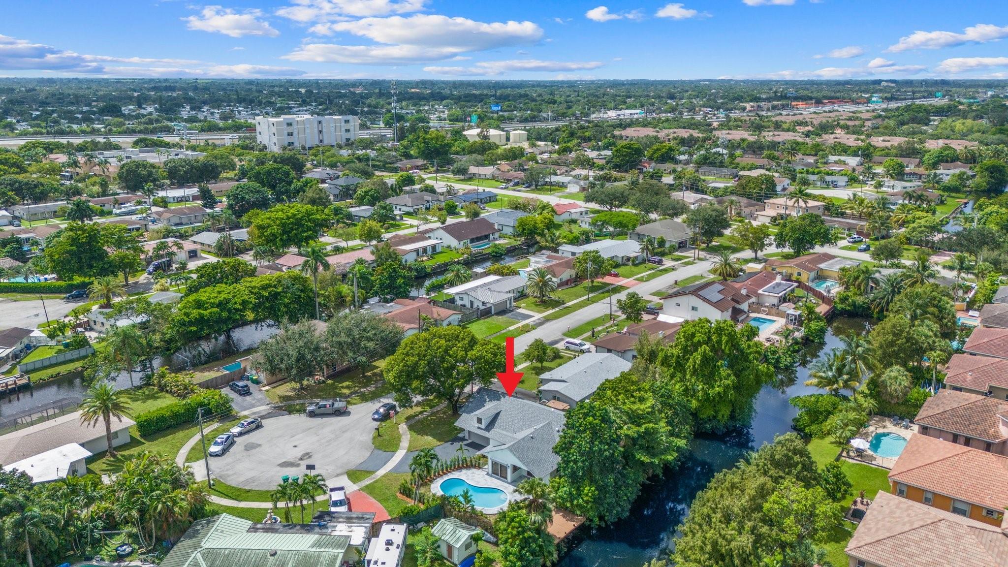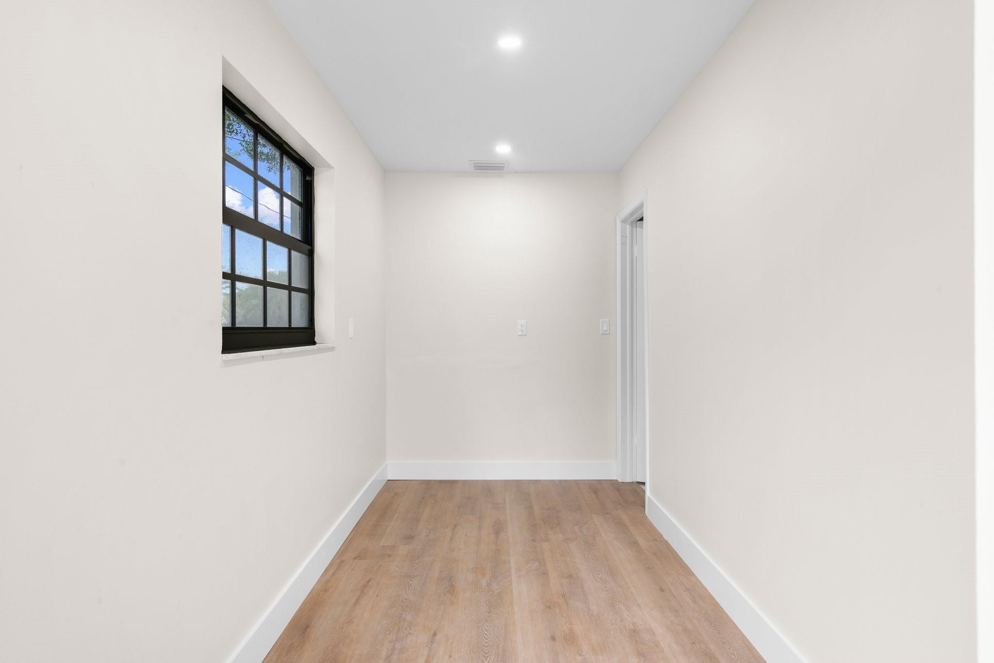This home can easily be split into a 2/1 and 1/1 with separate entrance if you desire. Looking for the perfect blend of luxury and comfort? This 3 bed, 2 bath waterfront home with a garage and separate office space is the one! Enjoy stunning views of the pool and dock from the newly redone pool deck. The interior boasts high volume ceilings, an open concept kitchen and living area, and wood look flooring. The primary bedroom is a serene retreat with a walk-in closet, private bathroom, and separate vanity/make-up area. The backyard is fully fenced for privacy and features a covered patio and pool. Located on a quiet cul-de-sac and just minutes from American Heritage Academy. This home has it all! No HOA! Property has partial hurricane windows and a power shutter for the pool sliding door.