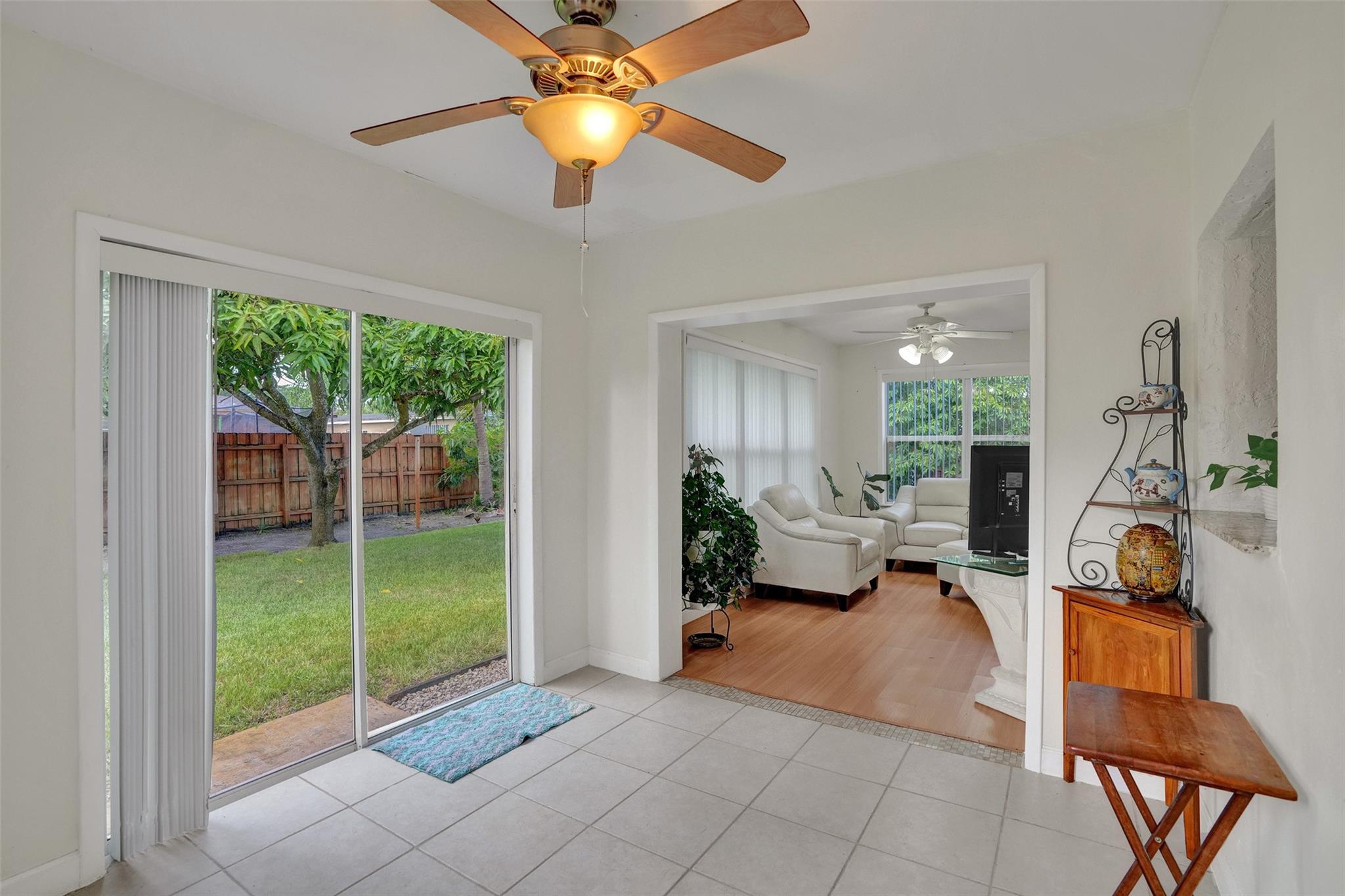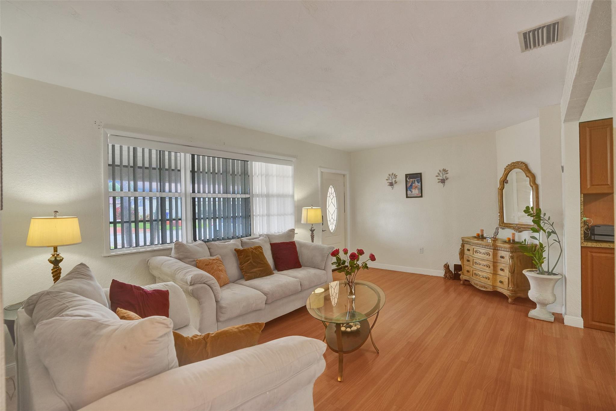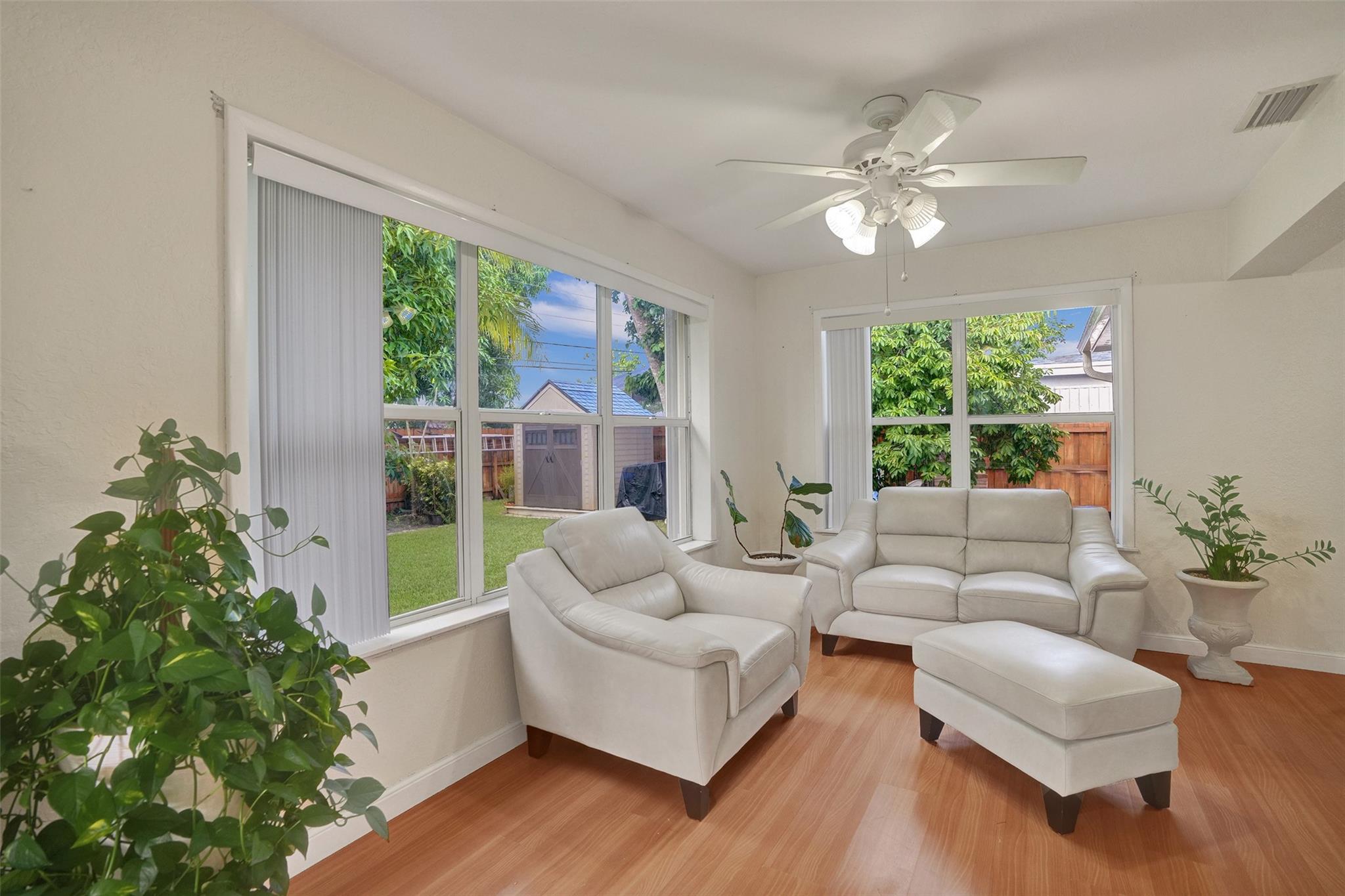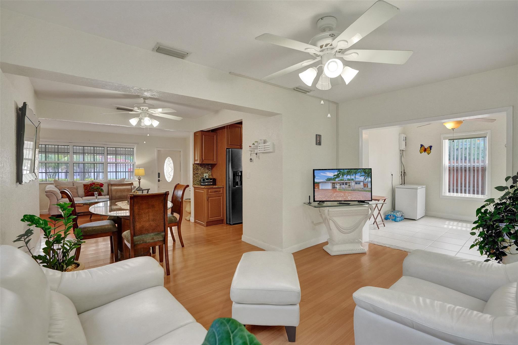 Cozy and well-maintained 2-bedroom, 2-bath home in Miramar, offering 1,319 sq. ft. of cozy living space. This home has a remodeled kitchen and updated baths and is move-in ready. Laminate floors throughout. The family room overlooks a beautifully landscaped backyard. The property has a sprinkler system with a well. New roof 2020. and A/C 2018. All doors are impacted, including the garage door—Accordion Hurricane shutters on all windows. The property boasts a beautiful large driveway—a fully fenced backyard with mango, avocado and soursop trees. You’ll fall in love with this home's warm and inviting energy—don’t miss out!