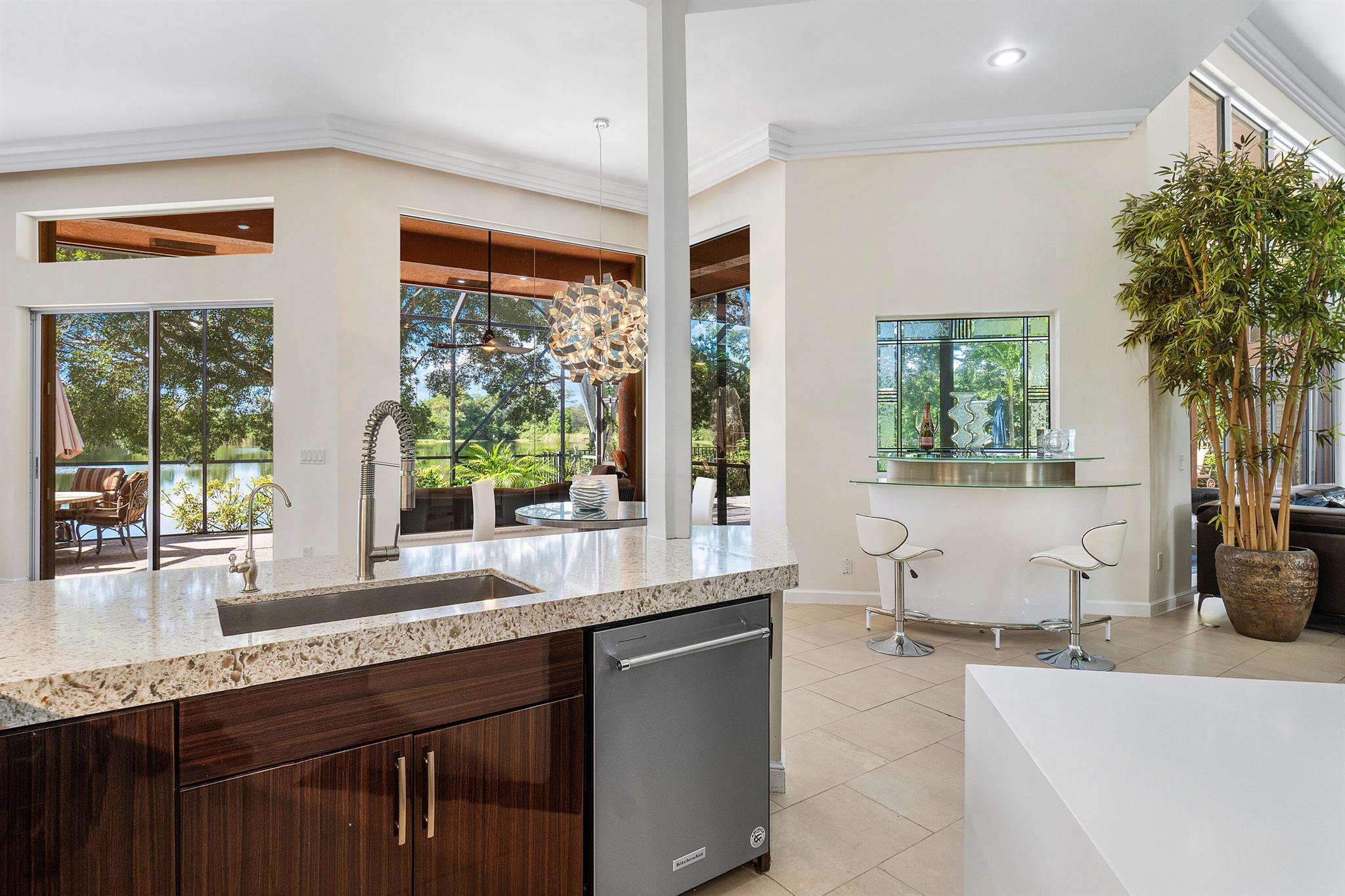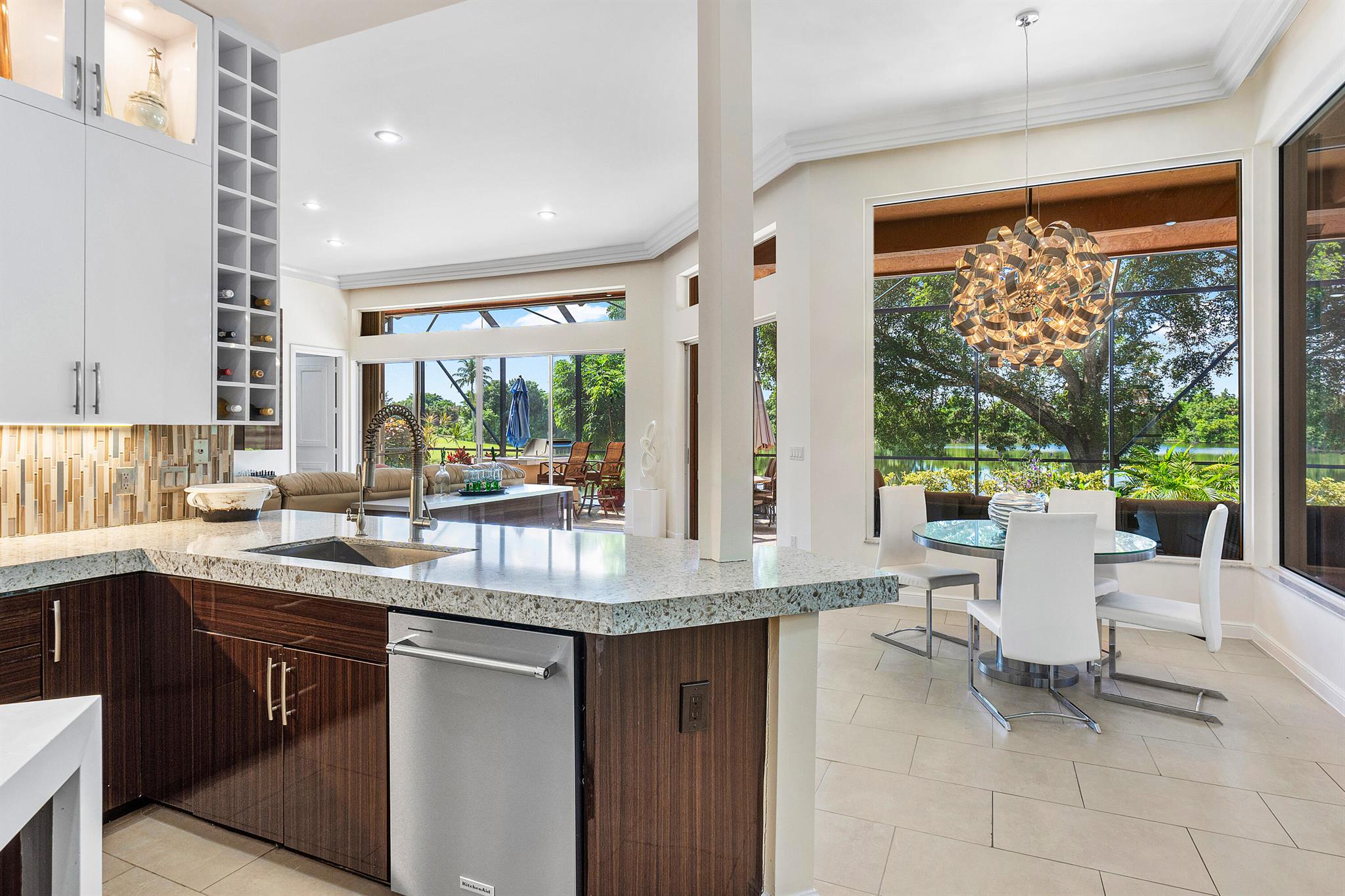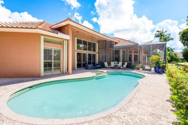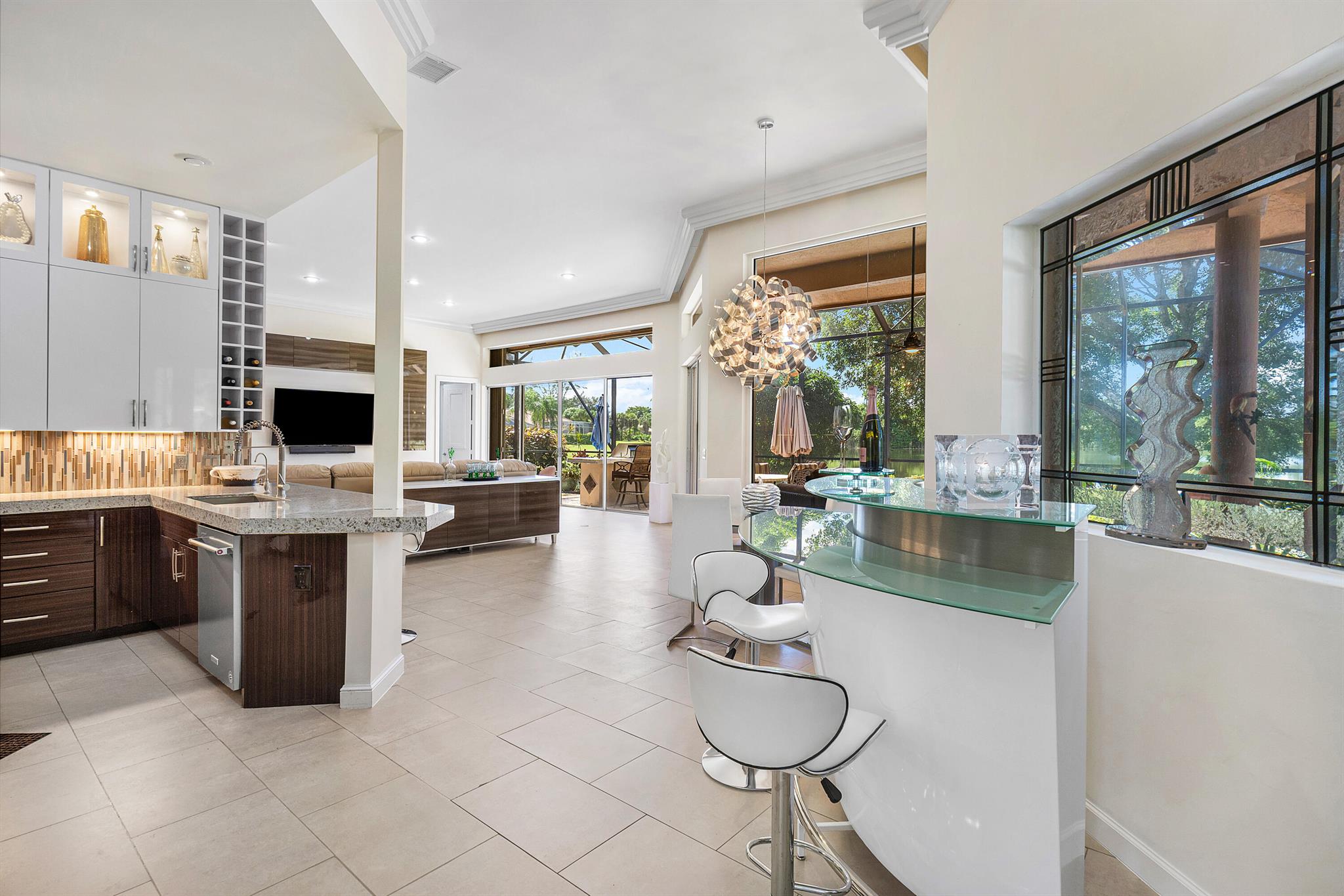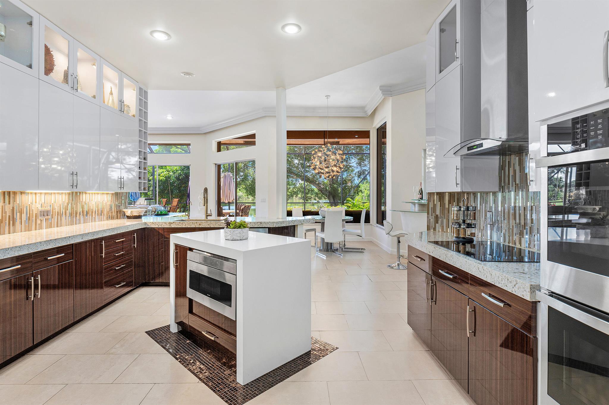 Spectacular 1 story, lakefront, pool home on over 1/3 acre with much privacy. 4 bedrooms, 2 dens, & 4.5 updated baths, & modern kitchen, perfect for any chef. Kitchen is outfitted w/top of the line, stainless steel appliances, stone countertops, glass cabinets to ceiling, two tone uppers & lowers, 2 pantries, & working island. Primary bedroom suggests a 5 star hotel suite w/den, grand en-suite bath, & 2 walk-in closets w/superior built-ins. Home impresses w/crown molding & dramatic ceilings. 3 car garage grants further storage. The covered & screened back patio leads to an open, sunny pool & spa, all ideal for entertaining. Take in the serene views from home while living in a Golf & Country Club Community including endless amenities.Membership Required.