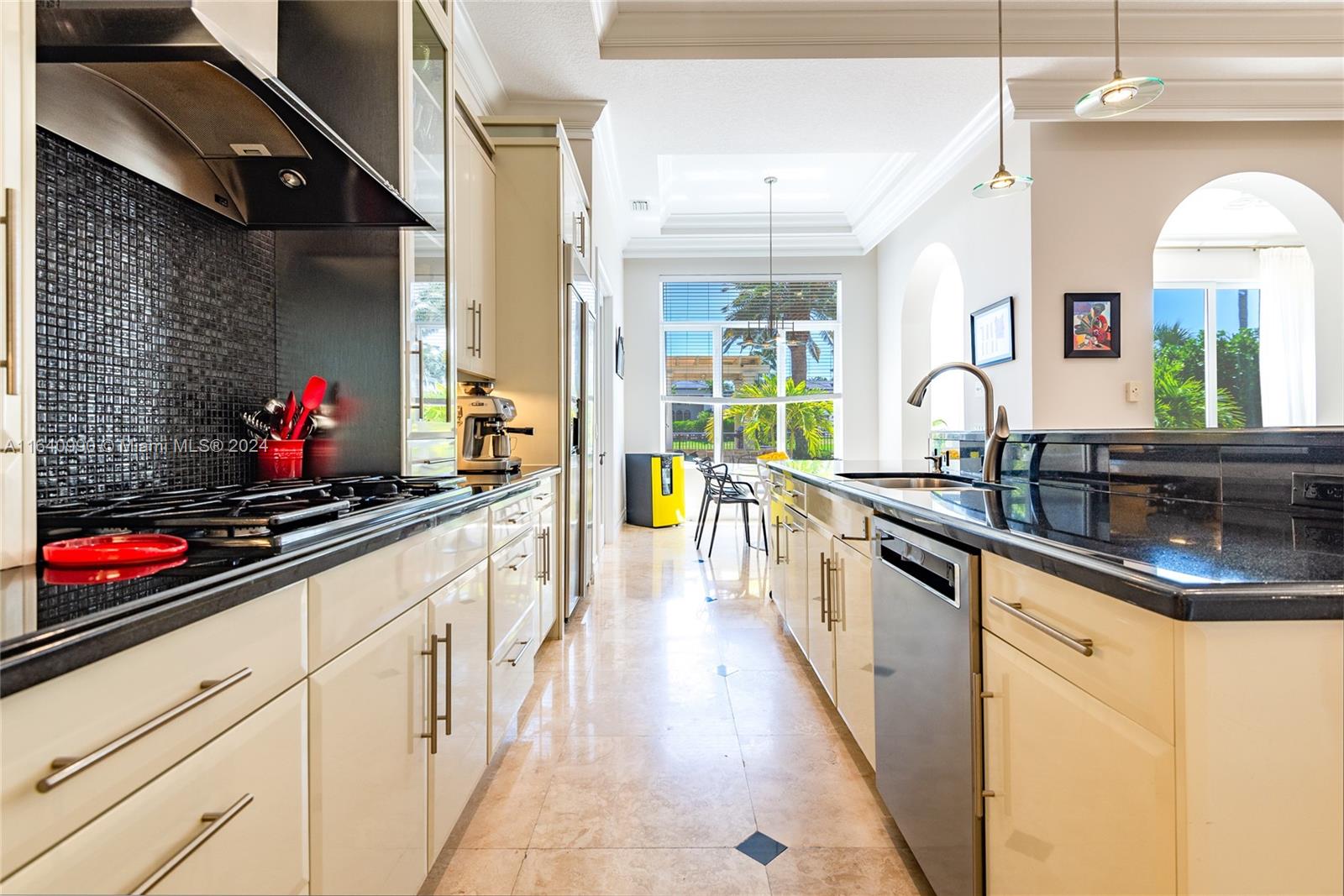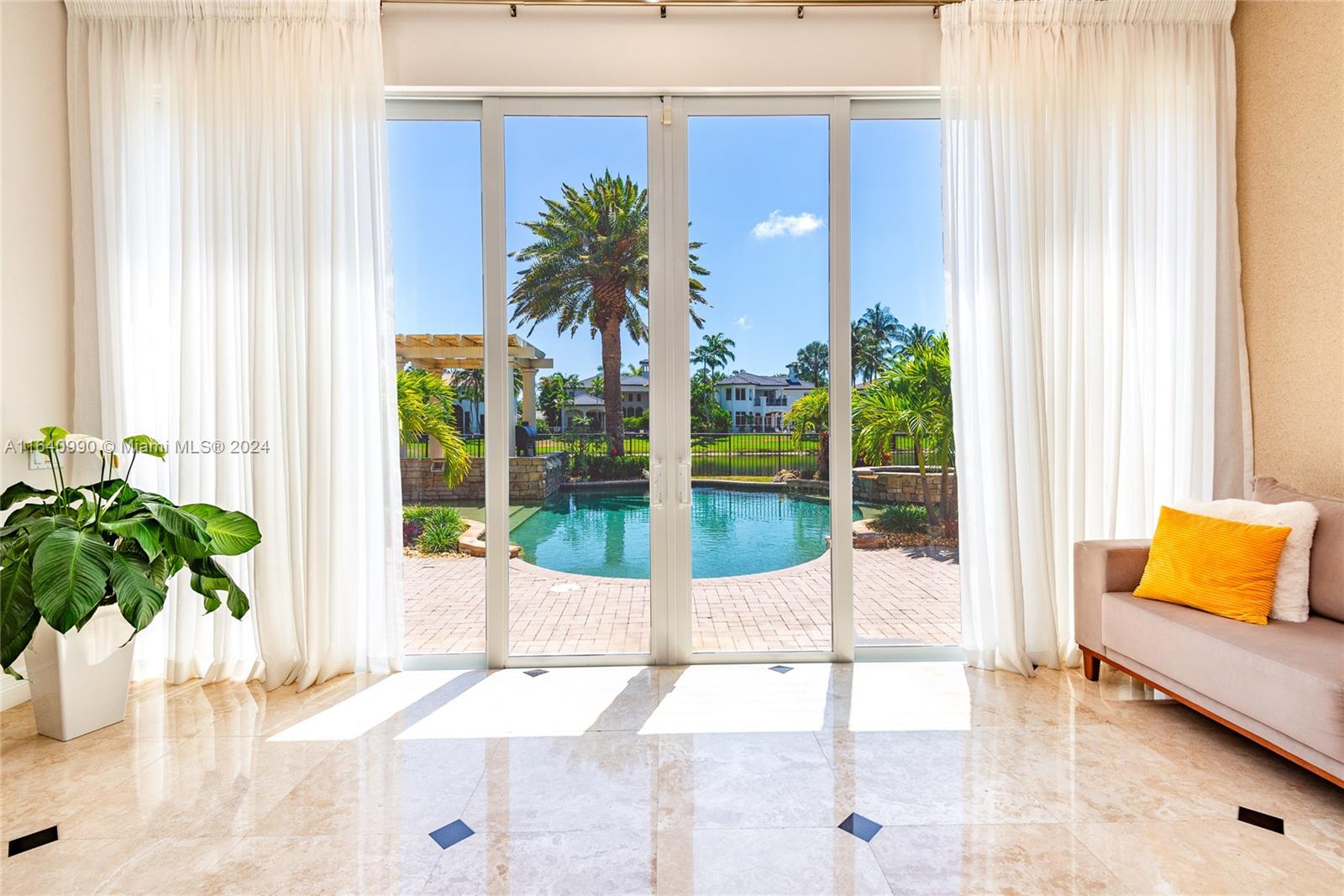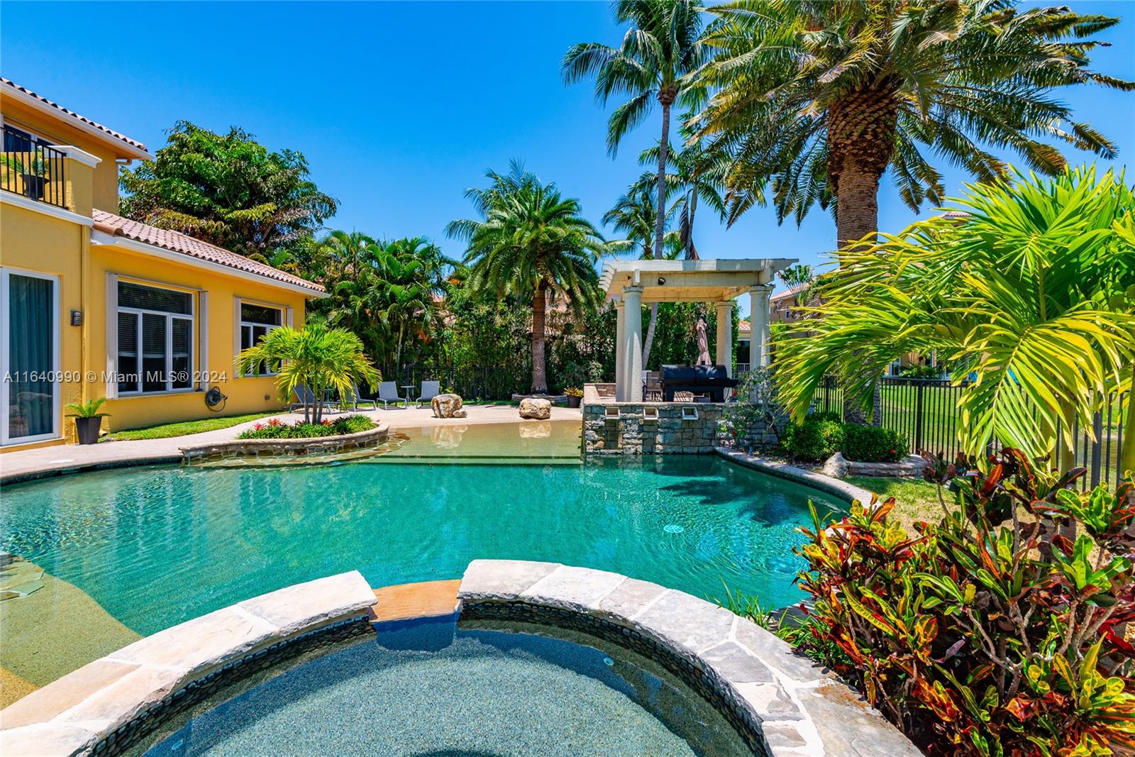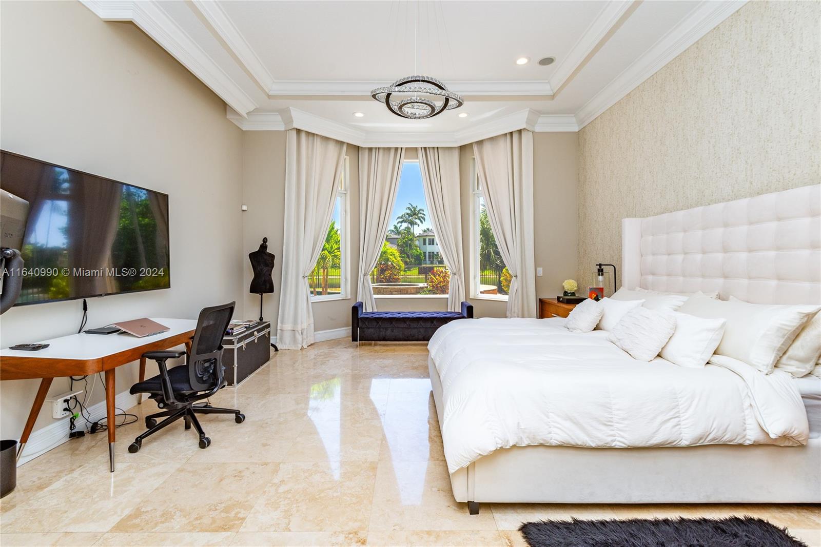 Experience luxury living in this model house,featuring premium upgrades throughout. Enjoy the elegance of marble & wood flooring. Beach-style pool with spa,complemented by a sun shelf & gazebo,creating a private oasis for relaxation & entertainment,overlooking a serene lake. Wall internal communication devices with the built-in ceiling sound system. The volume ceiling is enhanced with crown molding. Family room includes a dry bar,& a charming breakfast nook. The kitchen boasts exquisite details,including glass backsplash,contemporary white lacquer cabinetry, pantry, & granite countertops. The 3 car garage offers ample space. Relax in the media room with a gas fireplace, or unwind in the loft entertainment center. Master suite features walk-in closets & separate commodes in the master bath.