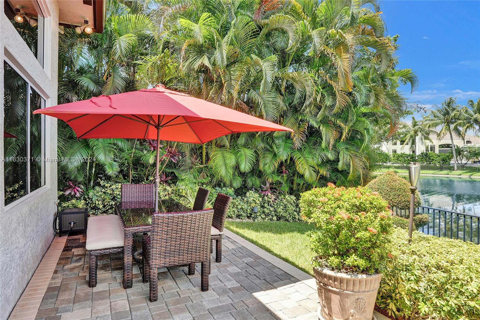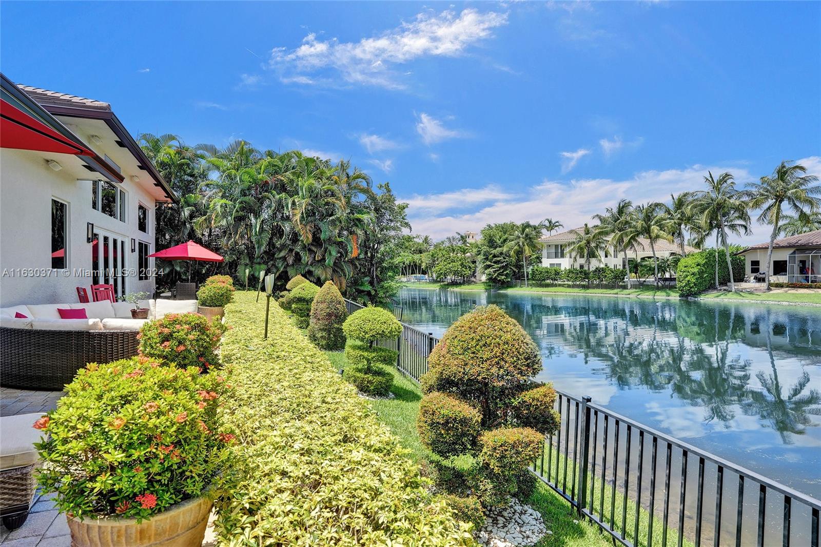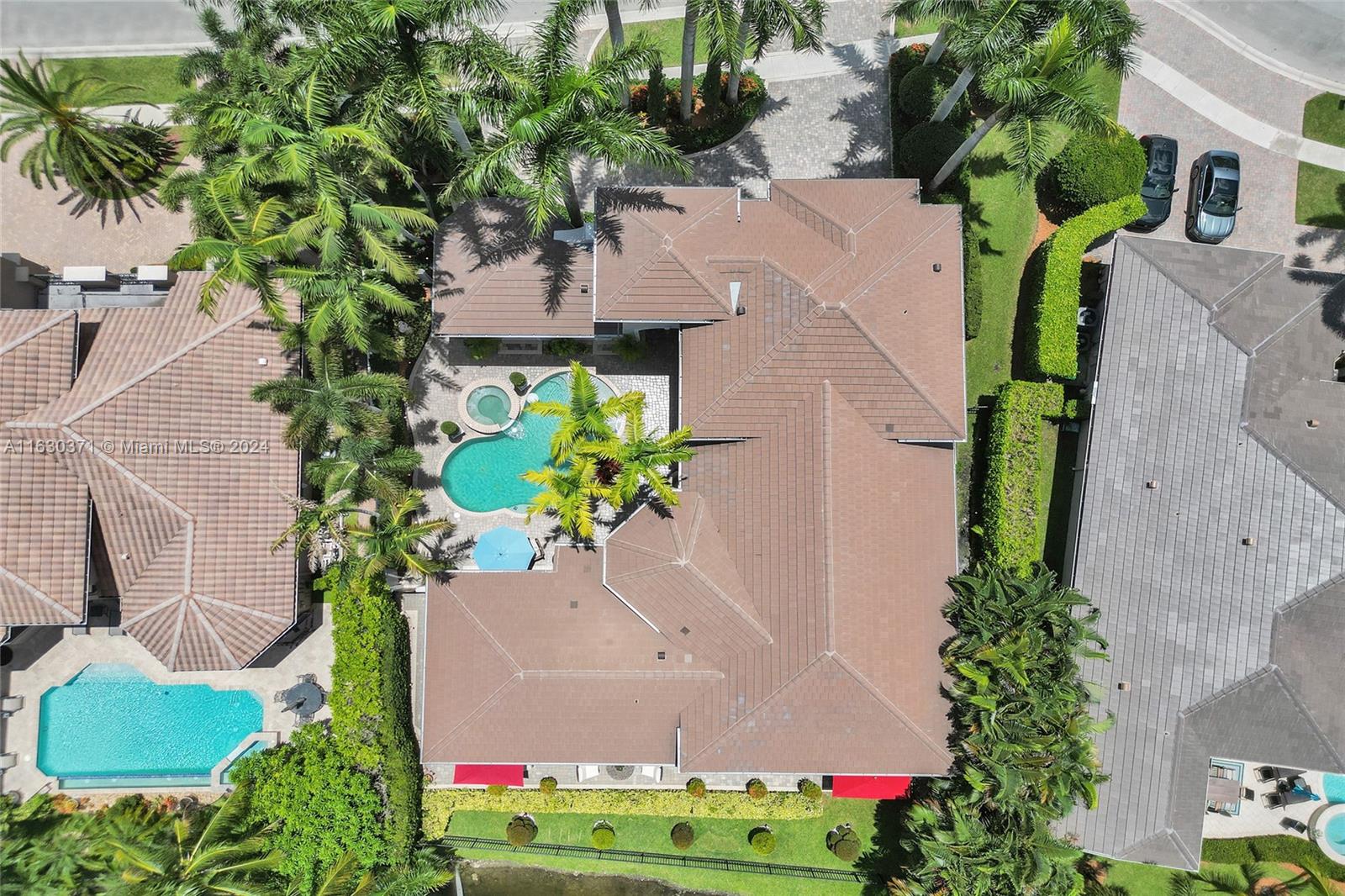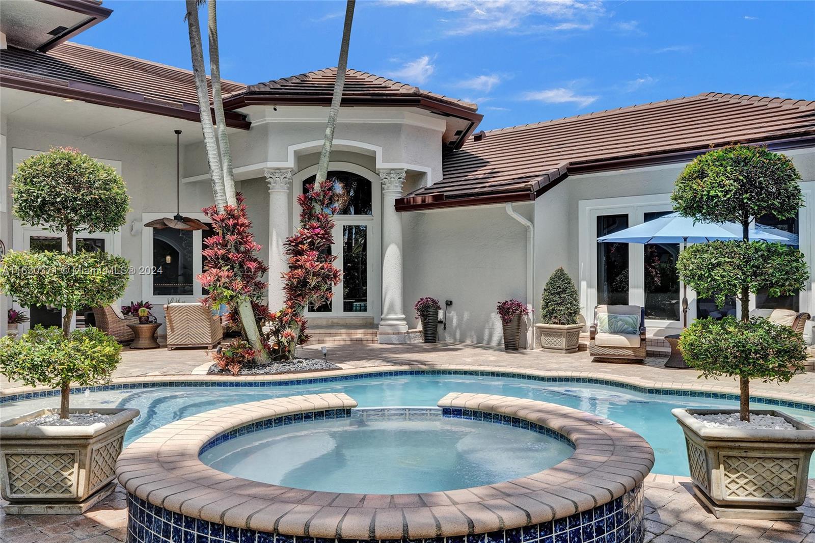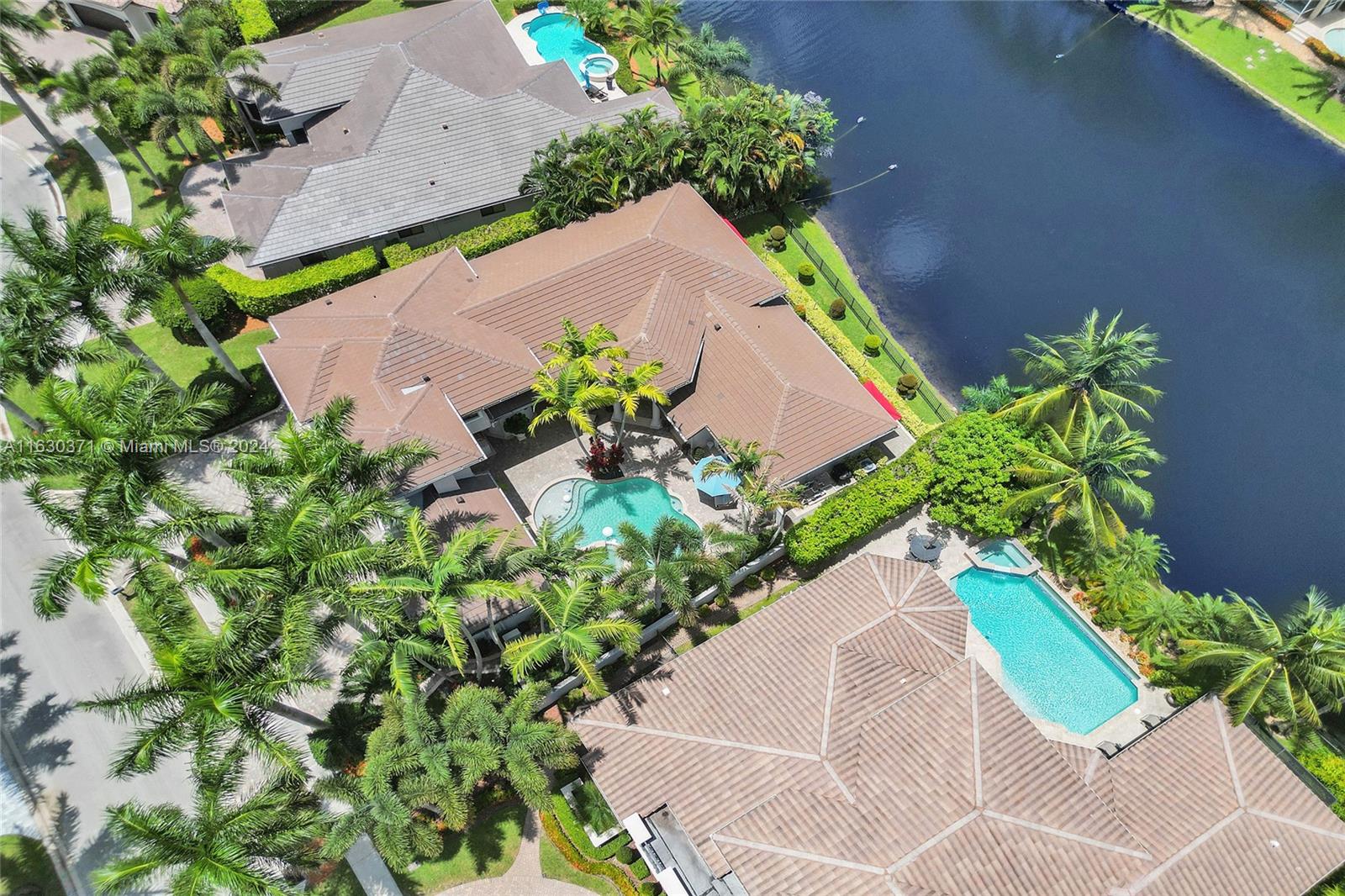 YOUR PRIVATE TROPICAL OASIS AWAITS YOU! Stunning 2 story house on a quiet cul-de-sac in the 24/7 guard gated Hawks Landing. It features 5 bed/4.5 bths w/ waterfront views. A New Roof, exterior paint 2023, all impact windows/doors in 2022. Smart Home, security cameras, security lights. The first floor has the sumptuous primary w/dbl W.I.C., marble spa bath. Wood floors & high volume ceilings make this a true retreat. Enjoy your large chef's kitchen with dbl. stacked wood & glass cabinets. High end appliances w/ 6 burner gas stove & dbl. ovens. New wine & beverage cooler makes for easy entertaining. marble & wood floors throughout. The separate guest house has views of the pool & spa plus amazing courtyard landscaping, W.I.C. and refreshment bar plus full bath. Look no further, you’re home.