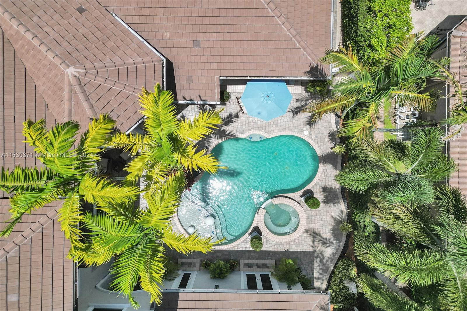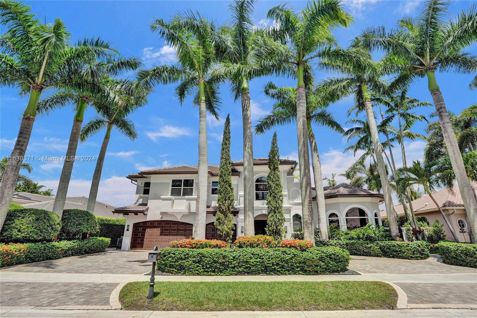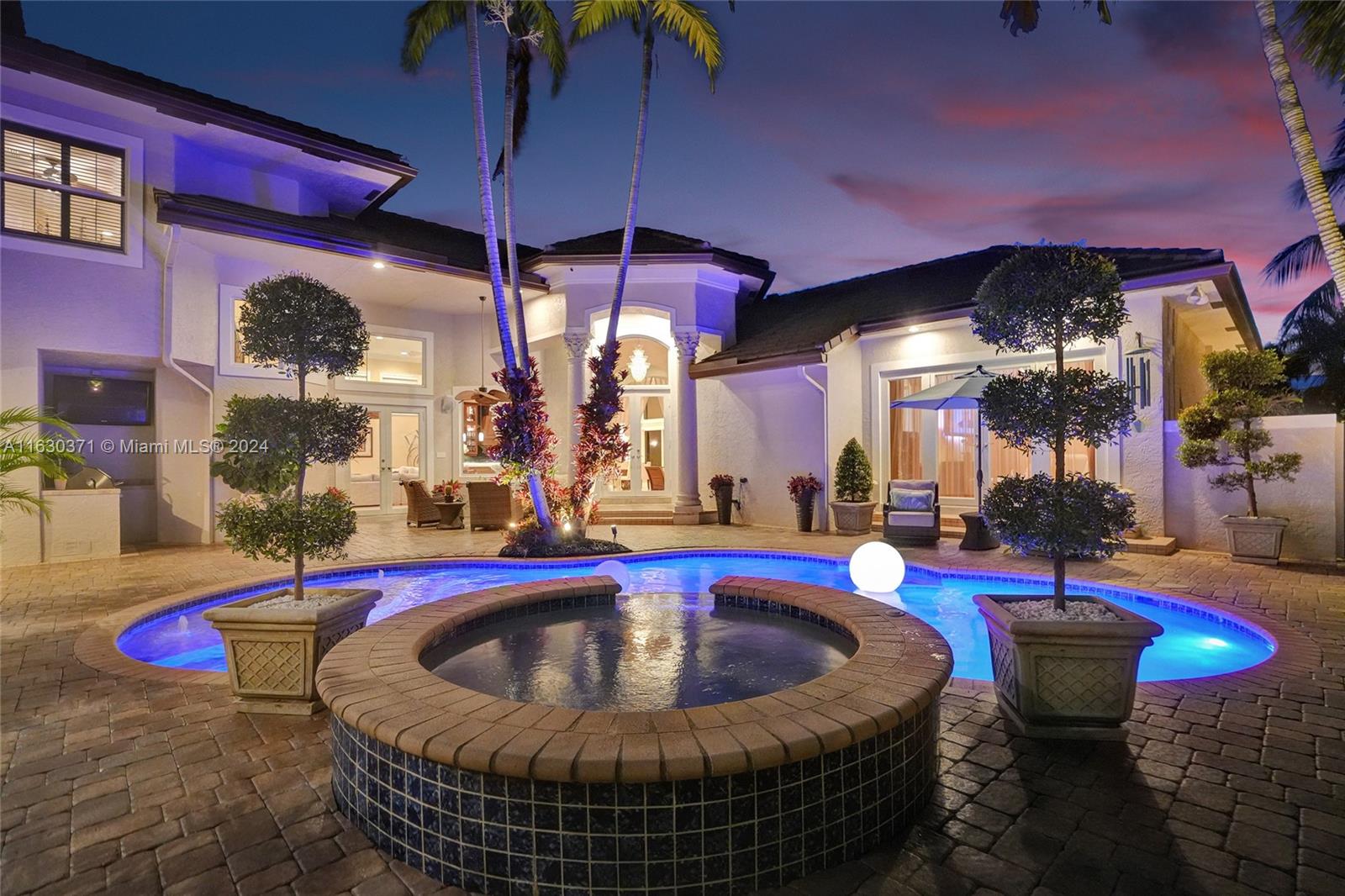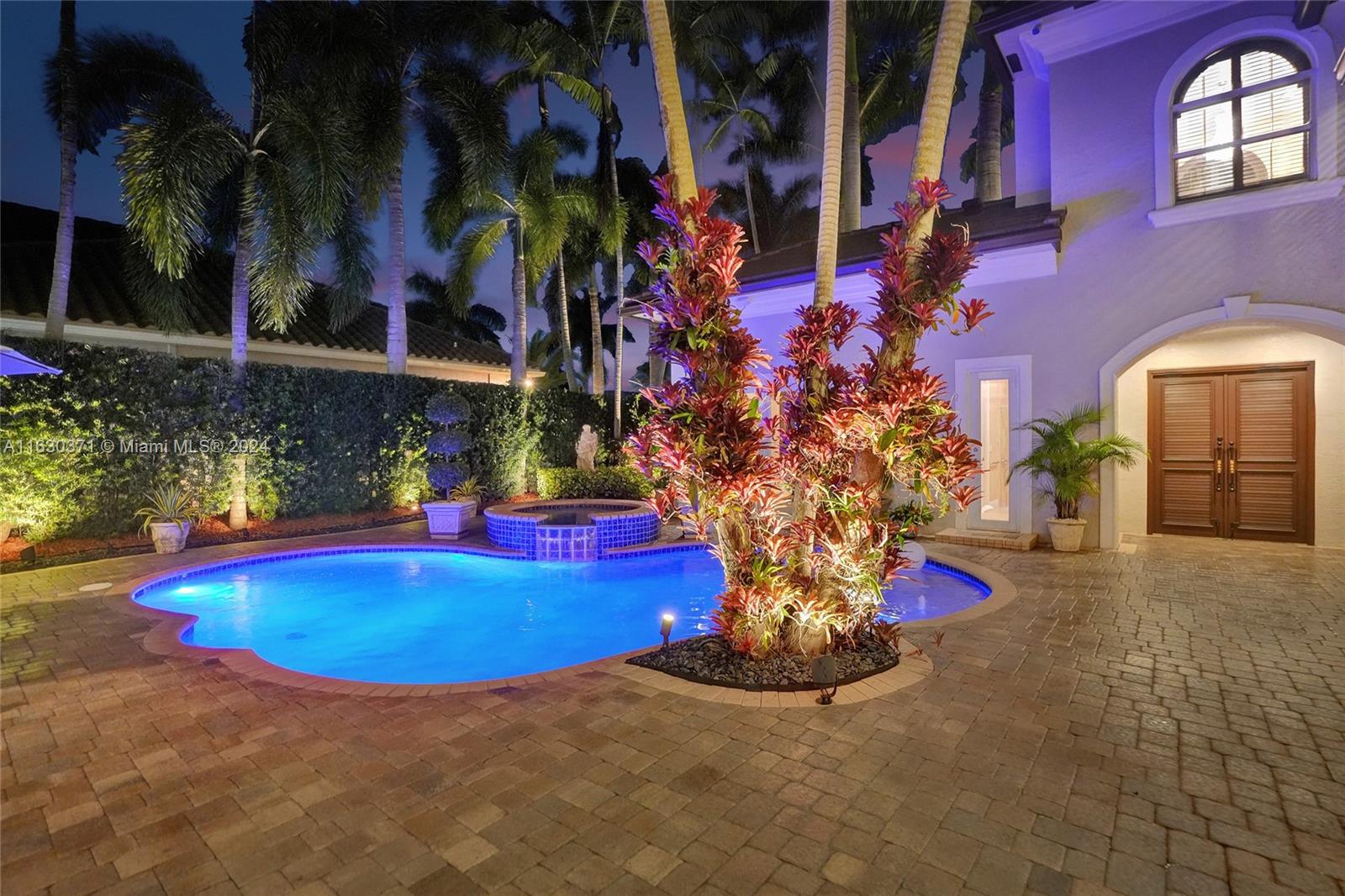 YOUR PRIVATE TROPICAL OASIS AWAITS YOU! Stunning 2 story house on a quiet cul-de-sac in the 24/7 guard gated Hawks Landing. It features 5 bed/4.5 bths w/ waterfront views. A New Roof, exterior paint 2023, all impact windows/doors in 2022. Smart Home, security cameras, security lights. The first floor has the sumptuous primary w/dbl W.I.C., marble spa bath. Wood floors & high volume ceilings make this a true retreat. Enjoy your large chef's kitchen with dbl. stacked wood & glass cabinets. High end appliances w/ 6 burner gas stove & dbl. ovens. New wine & beverage cooler makes for easy entertaining. marble & wood floors throughout. The separate guest house has views of the pool & spa plus amazing courtyard landscaping, W.I.C. and refreshment bar plus full bath. Look no further, you’re home.