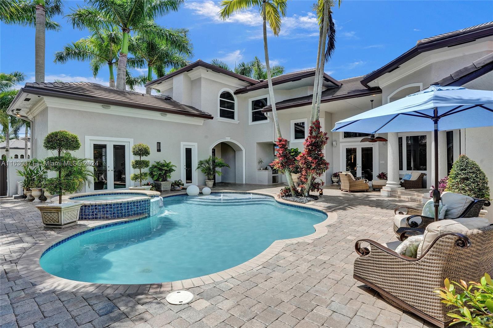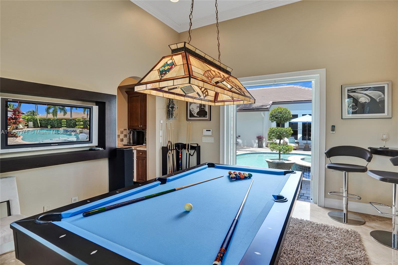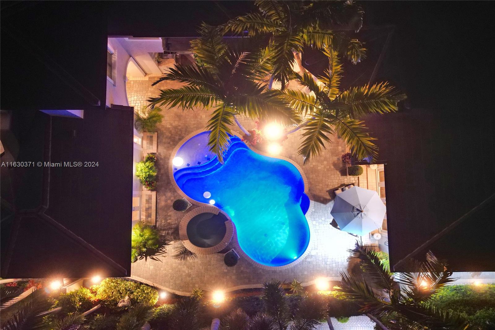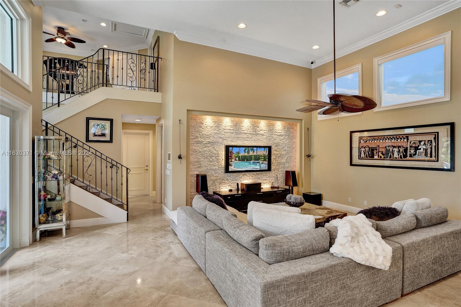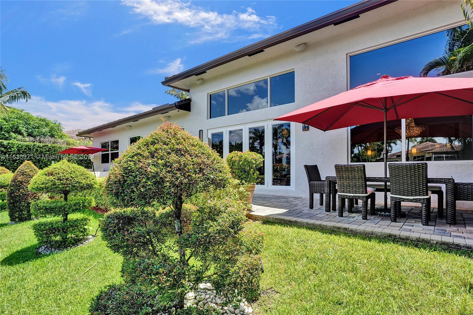YOUR PRIVATE TROPICAL OASIS AWAITS YOU! Stunning 2 story house on a quiet cul-de-sac in the 24/7 guard gated Hawks Landing. It features 5 bed/4.5 bths w/ waterfront views. A New Roof, exterior paint 2023, all impact windows/doors in 2022. Smart Home, security cameras, security lights. The first floor has the sumptuous primary w/dbl W.I.C., marble spa bath. Wood floors & high volume ceilings make this a true retreat. Enjoy your large chef's kitchen with dbl. stacked wood & glass cabinets. High end appliances w/ 6 burner gas stove & dbl. ovens. New wine & beverage cooler makes for easy entertaining. marble & wood floors throughout. The separate guest house has views of the pool & spa plus amazing courtyard landscaping, W.I.C. and refreshment bar plus full bath. Look no further, you’re home.