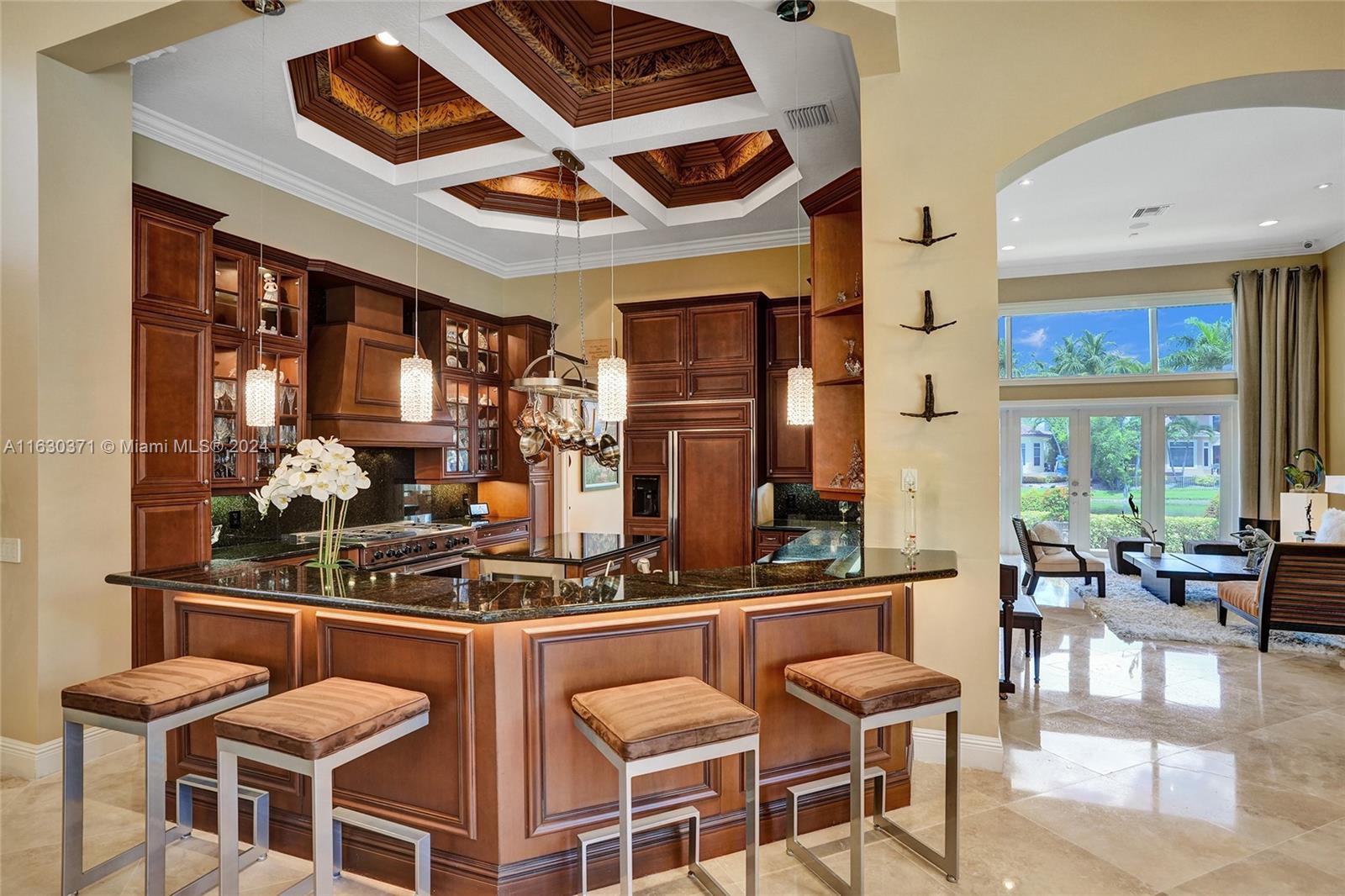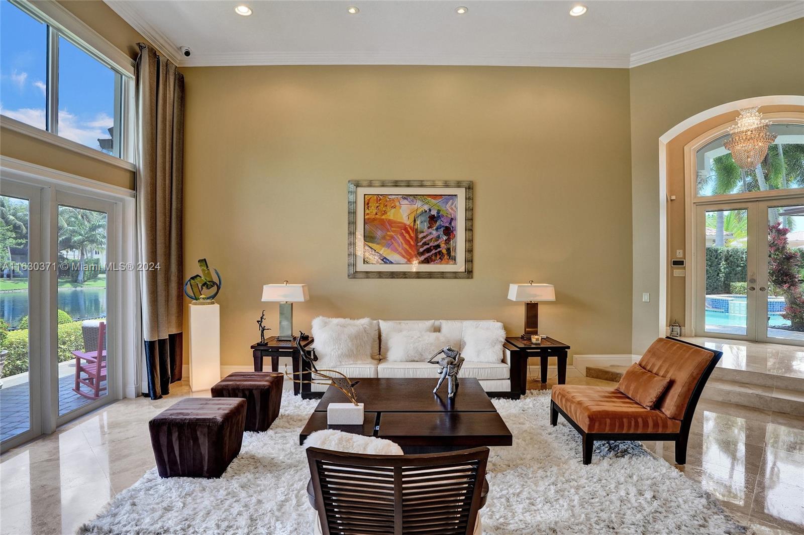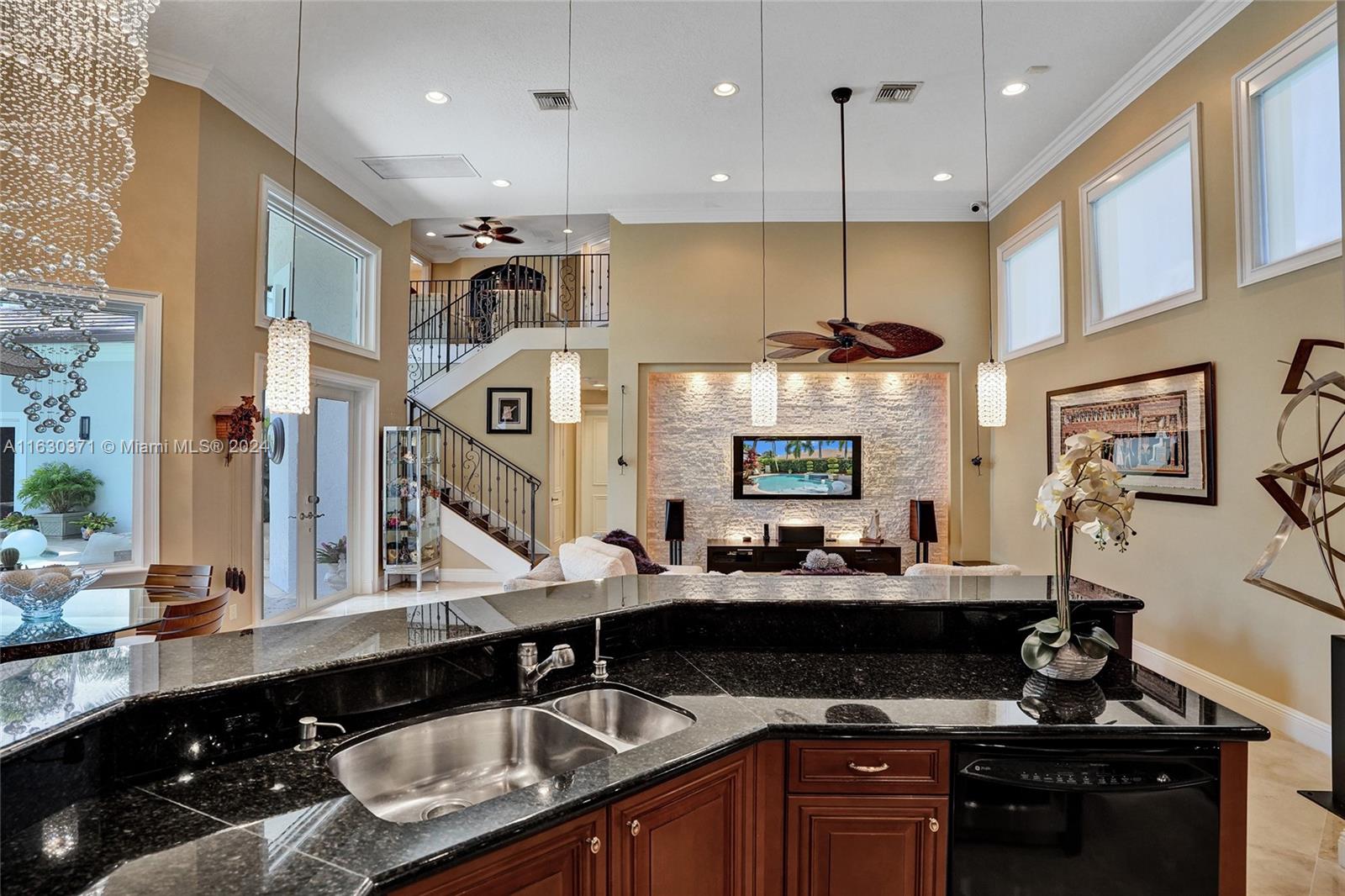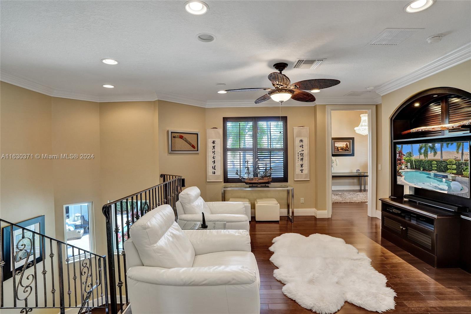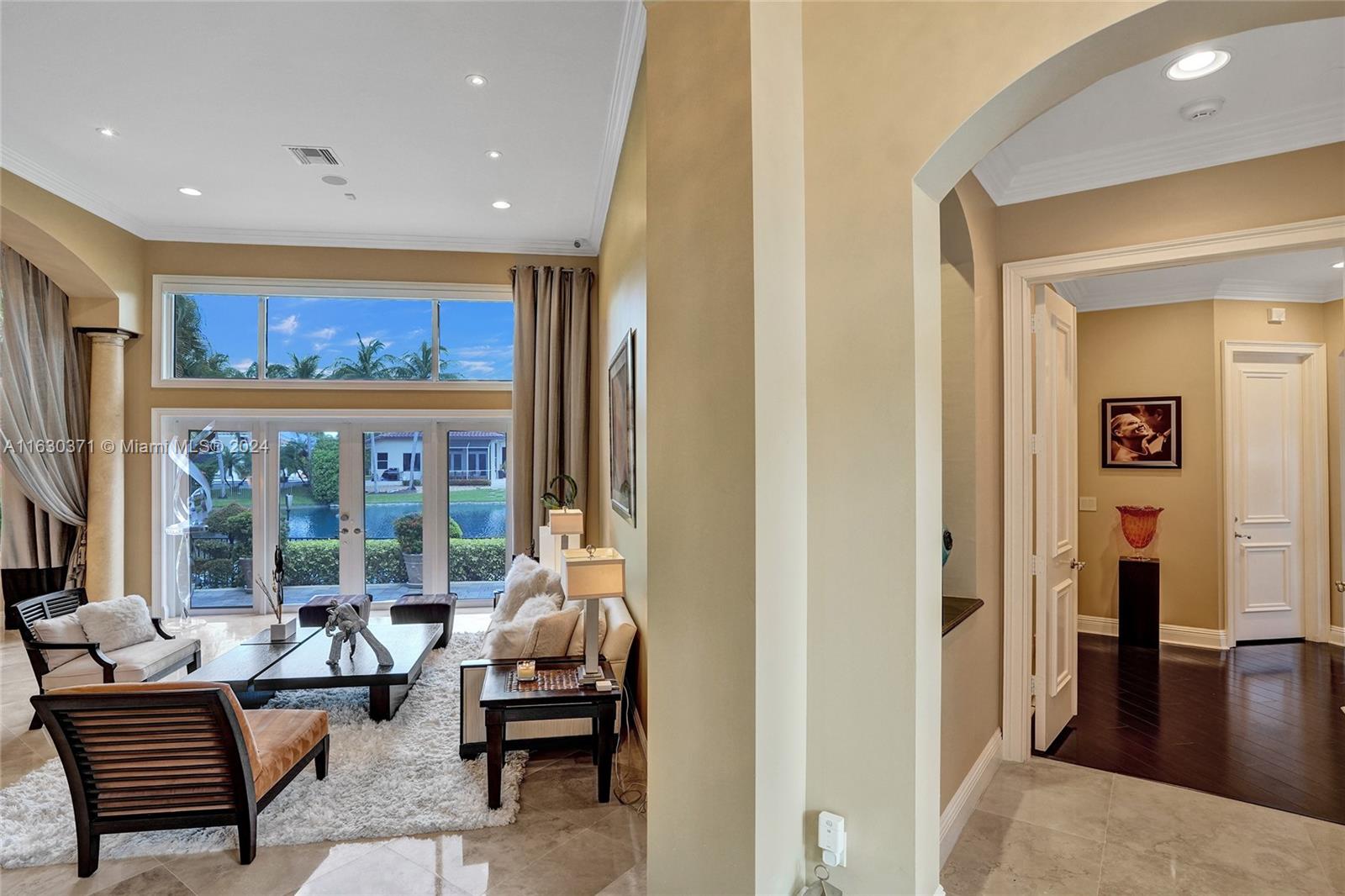 YOUR PRIVATE TROPICAL OASIS AWAITS YOU! Stunning 2 story house on a quiet cul-de-sac in the 24/7 guard gated Hawks Landing. It features 5 bed/4.5 bths w/ waterfront views. A New Roof, exterior paint 2023, all impact windows/doors in 2022. Smart Home, security cameras, security lights. The first floor has the sumptuous primary w/dbl W.I.C., marble spa bath. Wood floors & high volume ceilings make this a true retreat. Enjoy your large chef's kitchen with dbl. stacked wood & glass cabinets. High end appliances w/ 6 burner gas stove & dbl. ovens. New wine & beverage cooler makes for easy entertaining. marble & wood floors throughout. The separate guest house has views of the pool & spa plus amazing courtyard landscaping, W.I.C. and refreshment bar plus full bath. Look no further, you’re home.