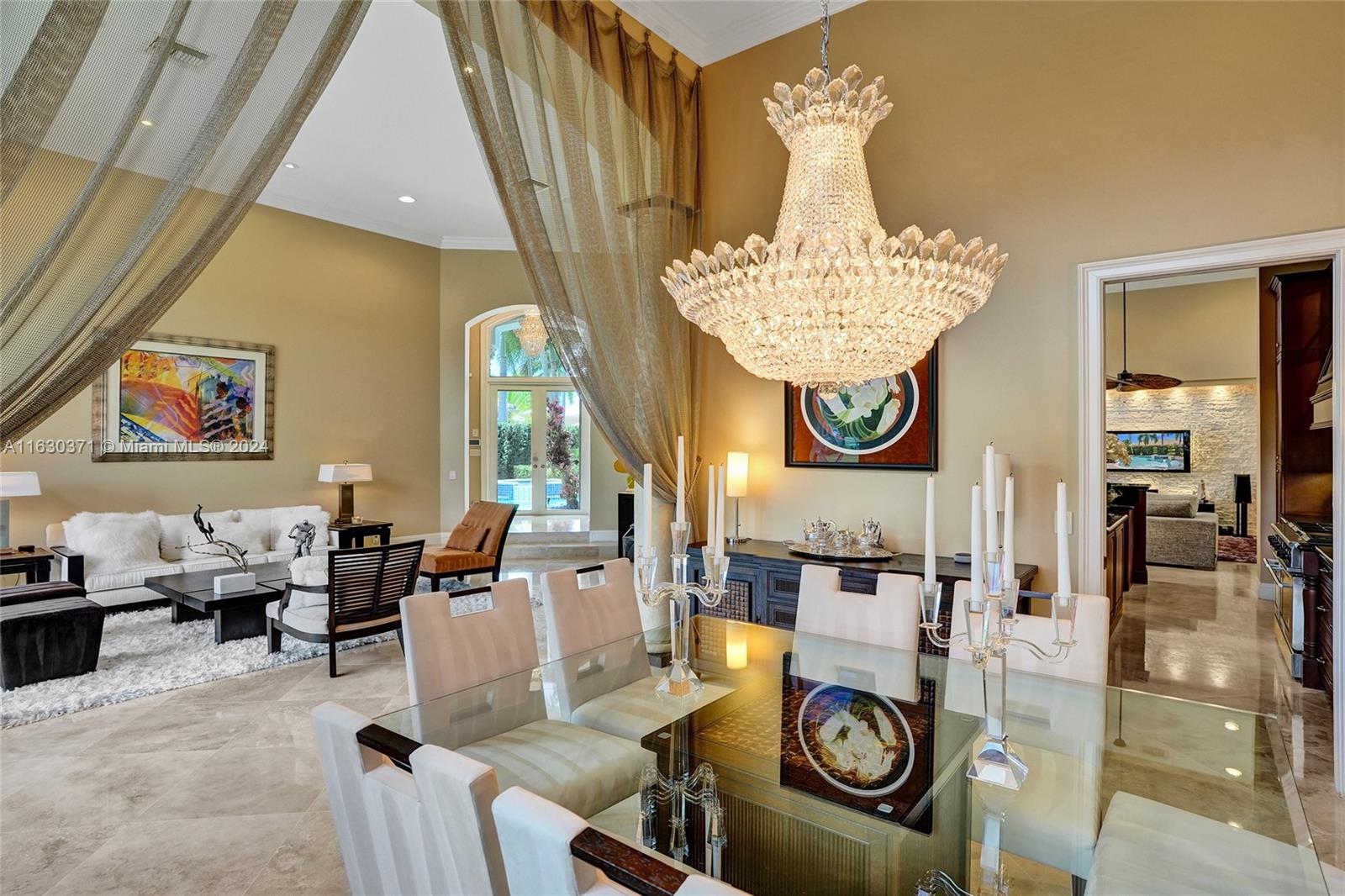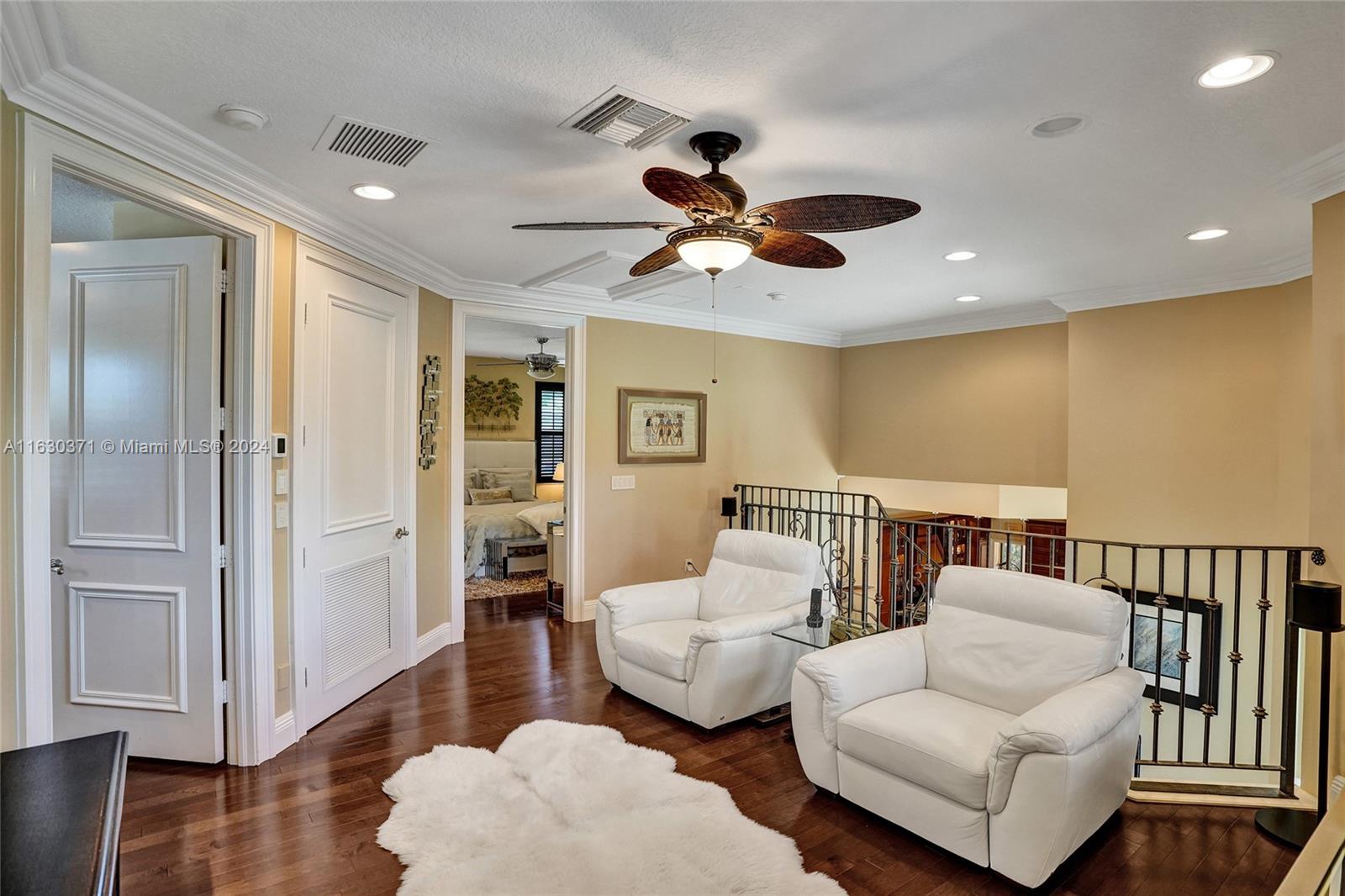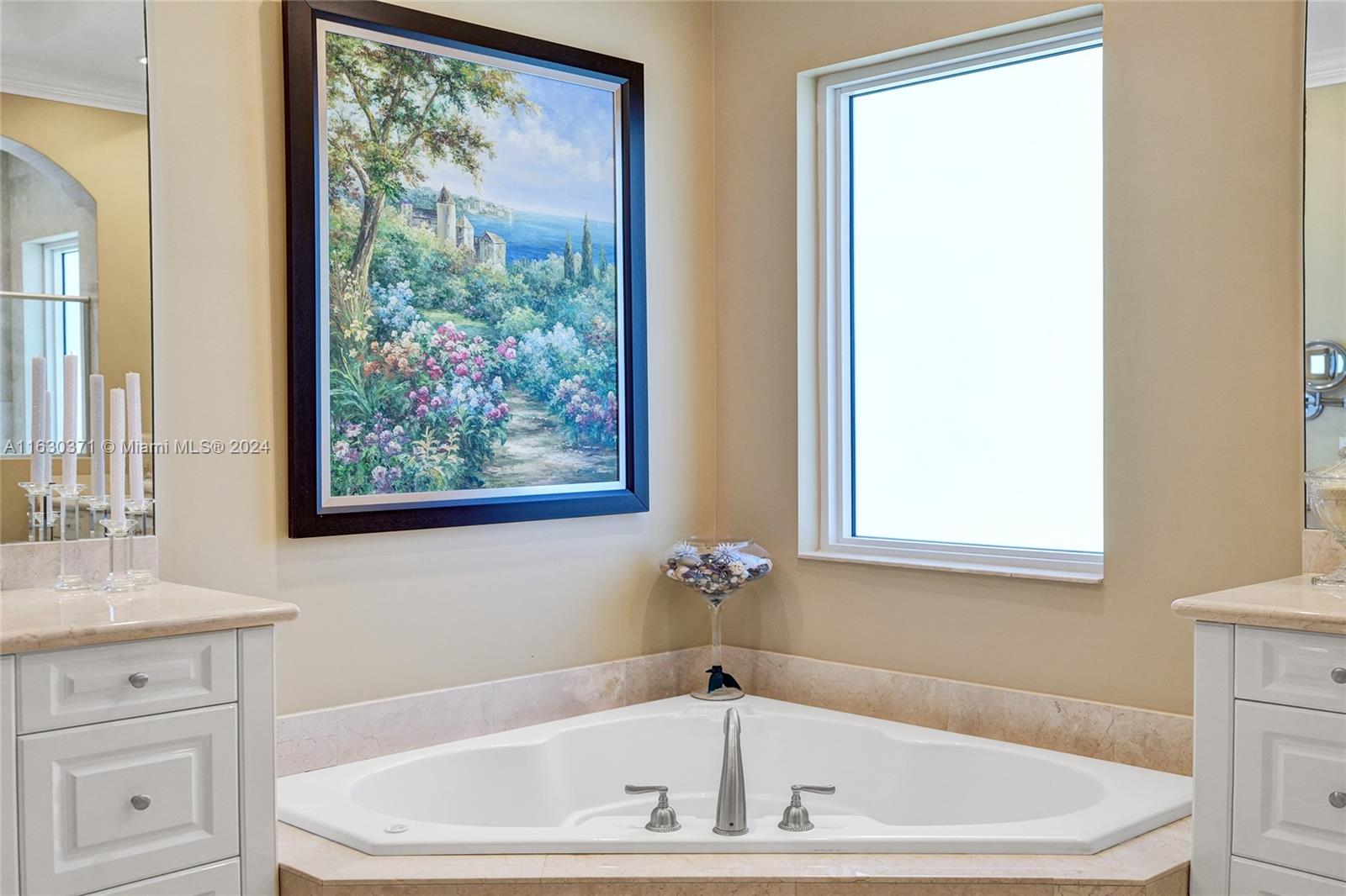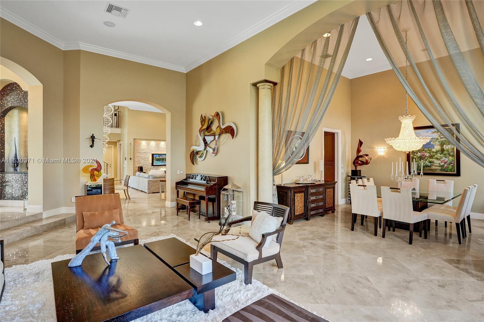YOUR PRIVATE TROPICAL OASIS AWAITS YOU! Stunning 2 story house on a quiet cul-de-sac in the 24/7 guard gated Hawks Landing. It features 5 bed/4.5 bths w/ waterfront views. A New Roof, exterior paint 2023, all impact windows/doors in 2022. Smart Home, security cameras, security lights. The first floor has the sumptuous primary w/dbl W.I.C., marble spa bath. Wood floors & high volume ceilings make this a true retreat. Enjoy your large chef's kitchen with dbl. stacked wood & glass cabinets. High end appliances w/ 6 burner gas stove & dbl. ovens. New wine & beverage cooler makes for easy entertaining. marble & wood floors throughout. The separate guest house has views of the pool & spa plus amazing courtyard landscaping, W.I.C. and refreshment bar plus full bath. Look no further, you’re home.