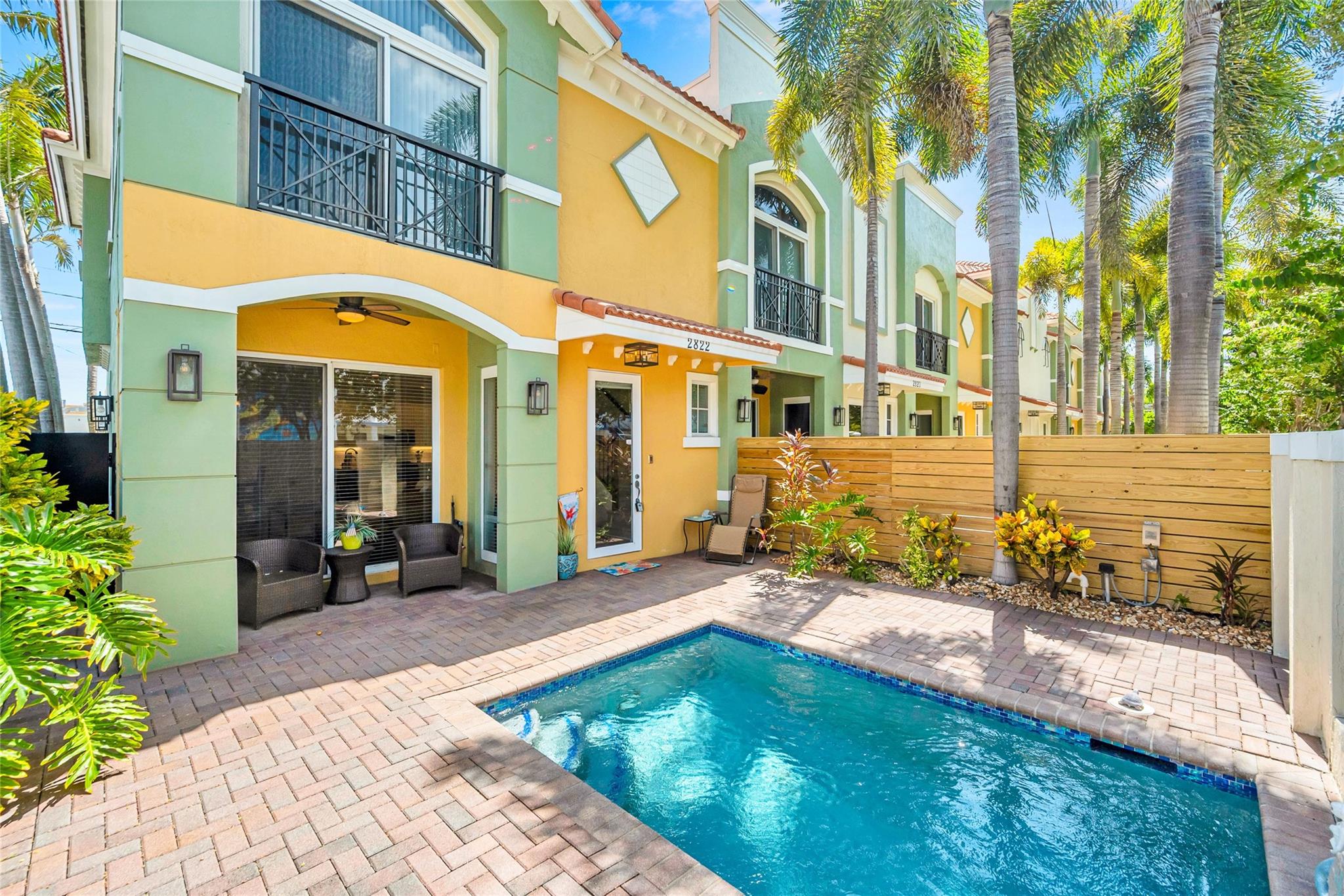 Two-story, newer construction (2007) townhouse with private splash/cocktail pool in boutique Coral Ridge development! Spacious, corner unit offers an open floor plan with main living area, including a powder room, on the first floor and all three bedrooms, along with a separate laundry room, on the second floor. Features include: sleek, modern kitchen w/new appliances (2023), quartz countertops & backsplash and an abundance of wood cabinetry; oversized primary suite with huge walk-in closet; true 2-car garage w/driveway parking for 2 additional vehicles; volume ceilings; impact glass throughout; private & walled courtyard entry. Very desirable location only blocks from the beach and just minutes to Las Olas and downtown!
