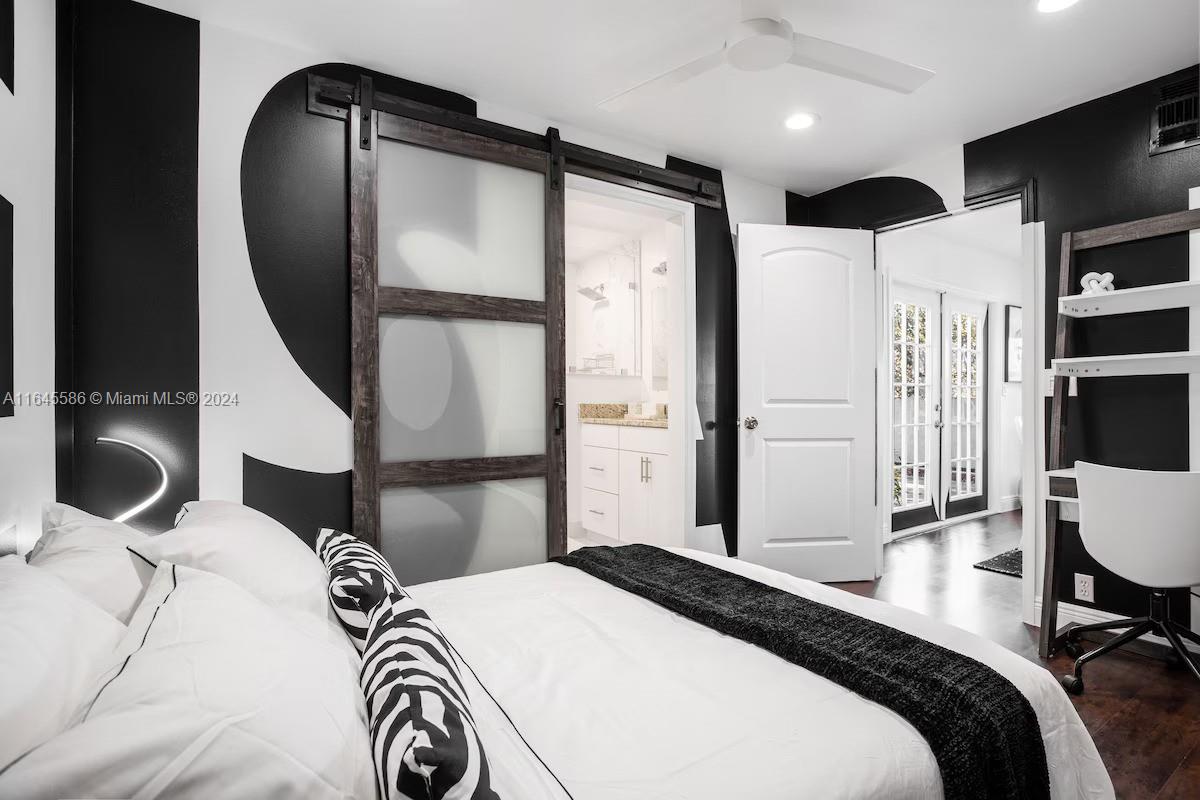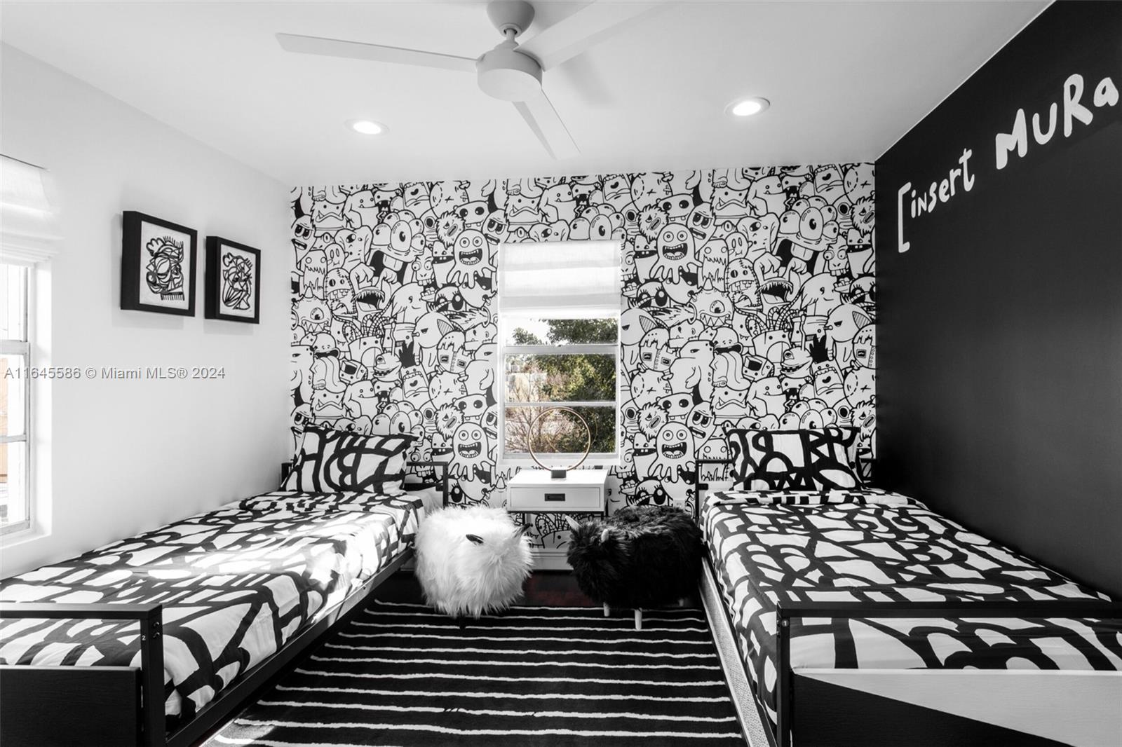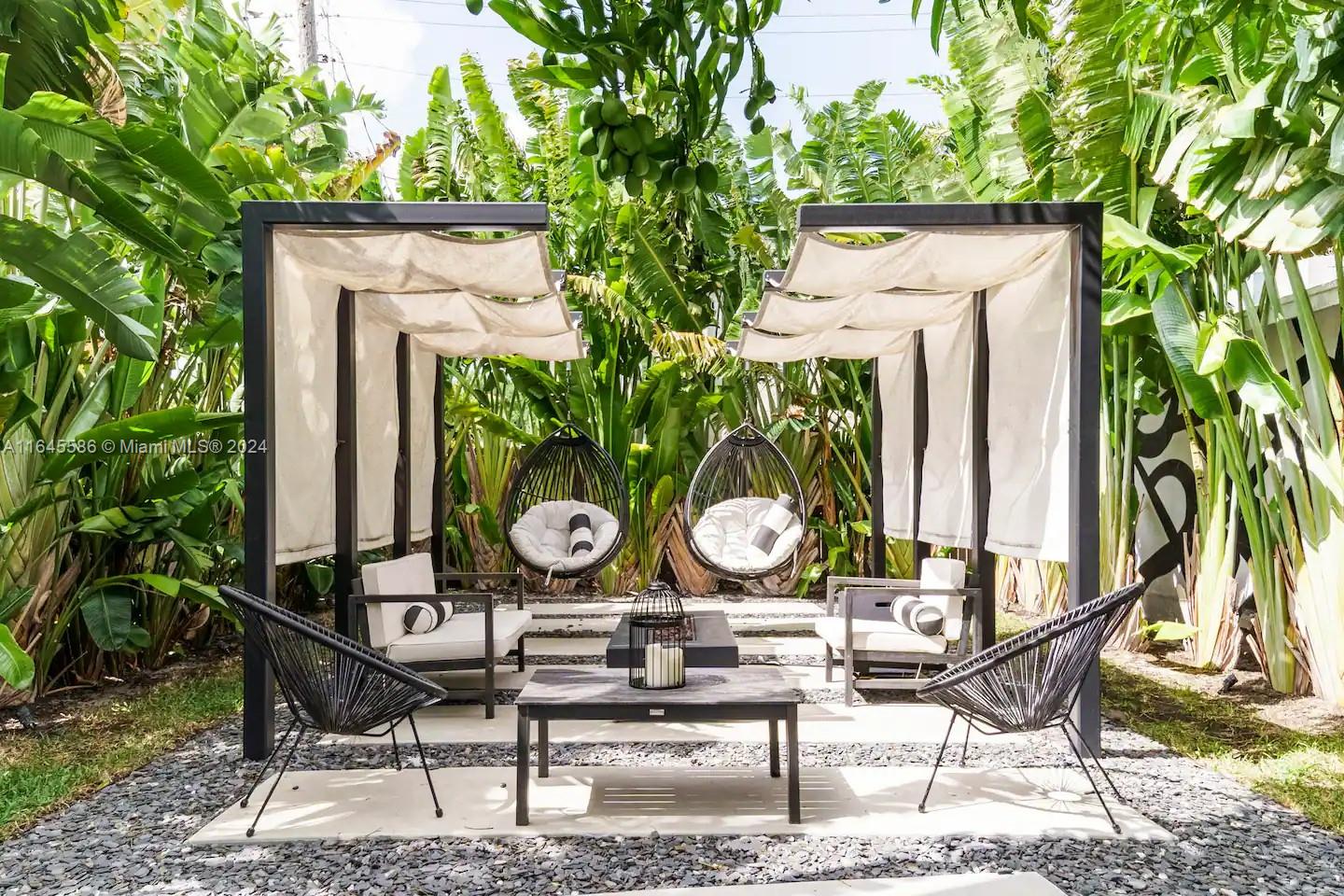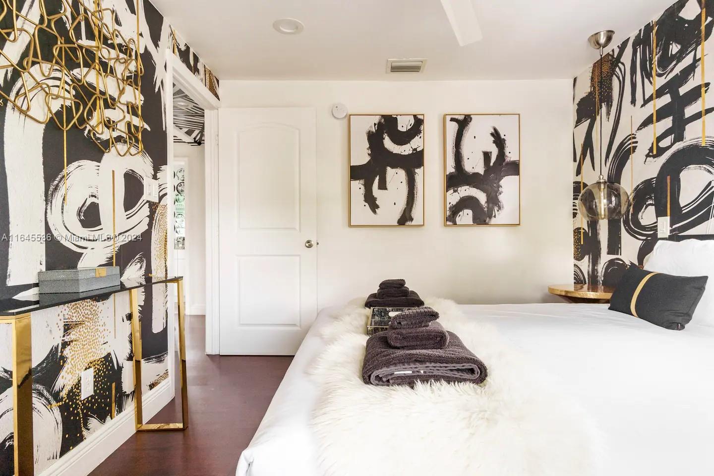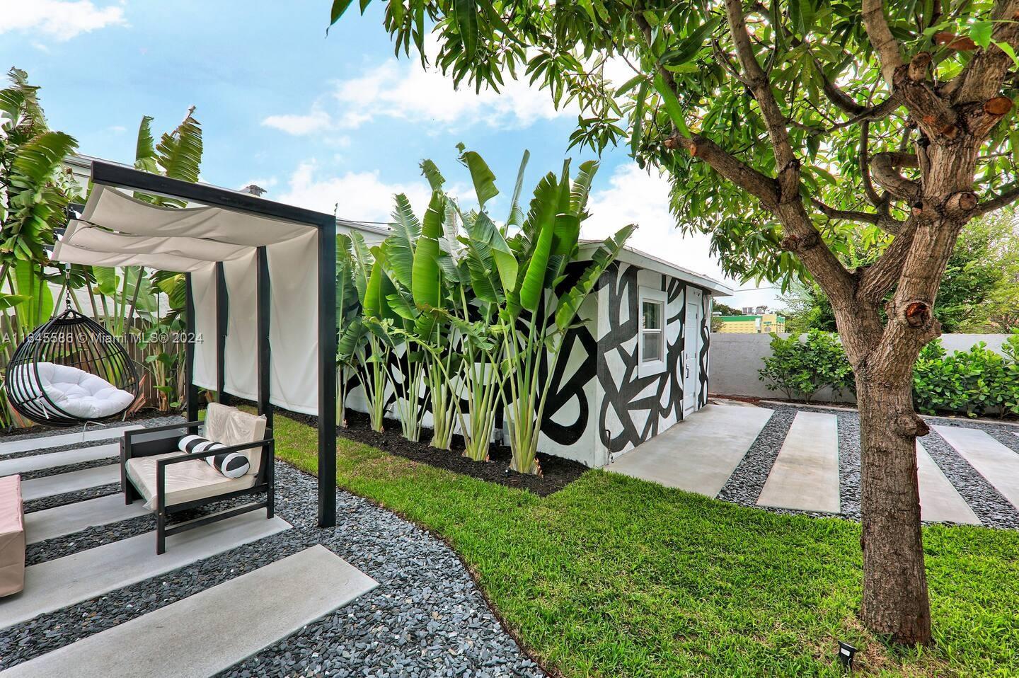 Unique, modern, and professionally designed DUPLEX property in prime location. The property is adorned with original artwork and installations throughout. The main house spans 1342 square feet and features 4 bedrooms and 2 bathrooms. The home’s striking B&W theme has been thoughtfully curated to provide a one-of-a-kind living experience. In addition to the main house, the property includes a 450 square feet guest house, offering 1 bedroom and 1 bathroom with an open floorplan, industrial steel barn doors, and polished concrete floors. The property also has a landscaped garden with a grill, fire pit, swing chairs, and outdoor dining area.