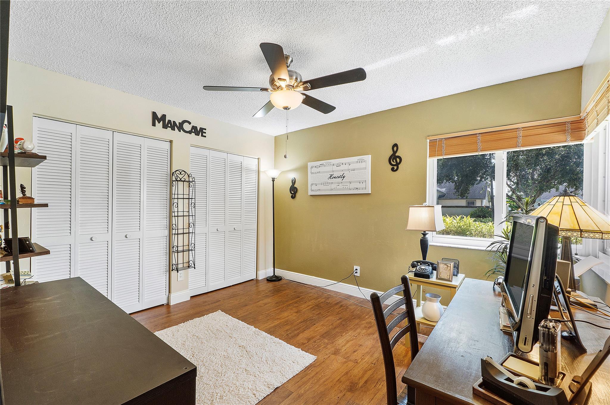 Check out this 3 bed, 2.5 bath nestled on a desirable corner lot in a serene community with a remarkably low HOA just $50 a year. Partial impact windows & doors. Inside features a split floor plan offering privacy & comfort. Spacious living & dining areas w/elegant & long lasting Dade Pine Wood floors. Walk-in closets with built-ins offer generous storage space, w/custom shades & blinds. Kitchen updated w/sleek quartz countertops, recently updated appliances, and ample storage. Perfect for entertaining, the screened-in patio features a heated pool w/resurfaced Diamond Brite & New Tile (2023) complemented by updated pool equipment, a cabana bath, and a convenient outdoor shower. Also, features a two-car garage & is surrounded by abundant amenities, making it both convenient & comfortable.
