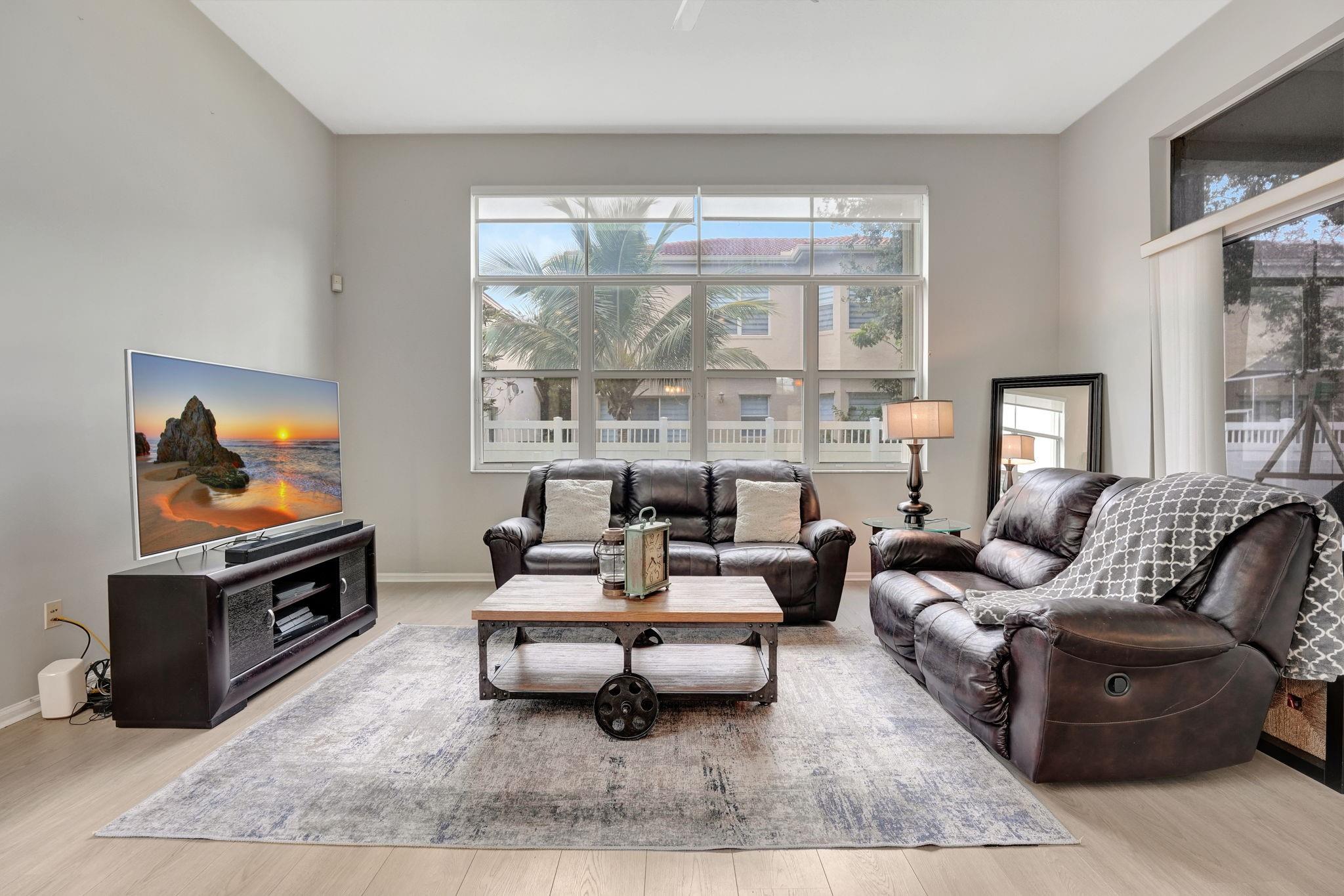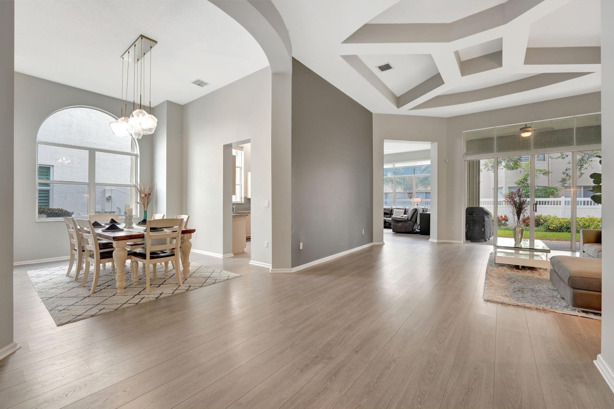 Discover this remarkable 4-bedroom, 3-bath home featuring stunning vaulted coffered ceilings that serve as the focal point of the home. The open floor plan is enhanced by neutral paint and expansive picture windows, allowing natural light to highlight the beautiful vinyl flooring throughout. Step outside to a fenced yard with room for a pool and a covered patio that is ideal for entertaining. Enjoy the perks of a community that includes a resort-style clubhouse, 2 pools, 24 hr guard gate, gym, basketball, tennis and more, all within easy reach of shopping and major highways. Situated on a private cul-de-sac in a highly-rated school district. Roof 2001 with recent clear 4pt, AC 2012, Water Heater 2015, Accordion shutters throughout including rated garage door. Priced to sell.