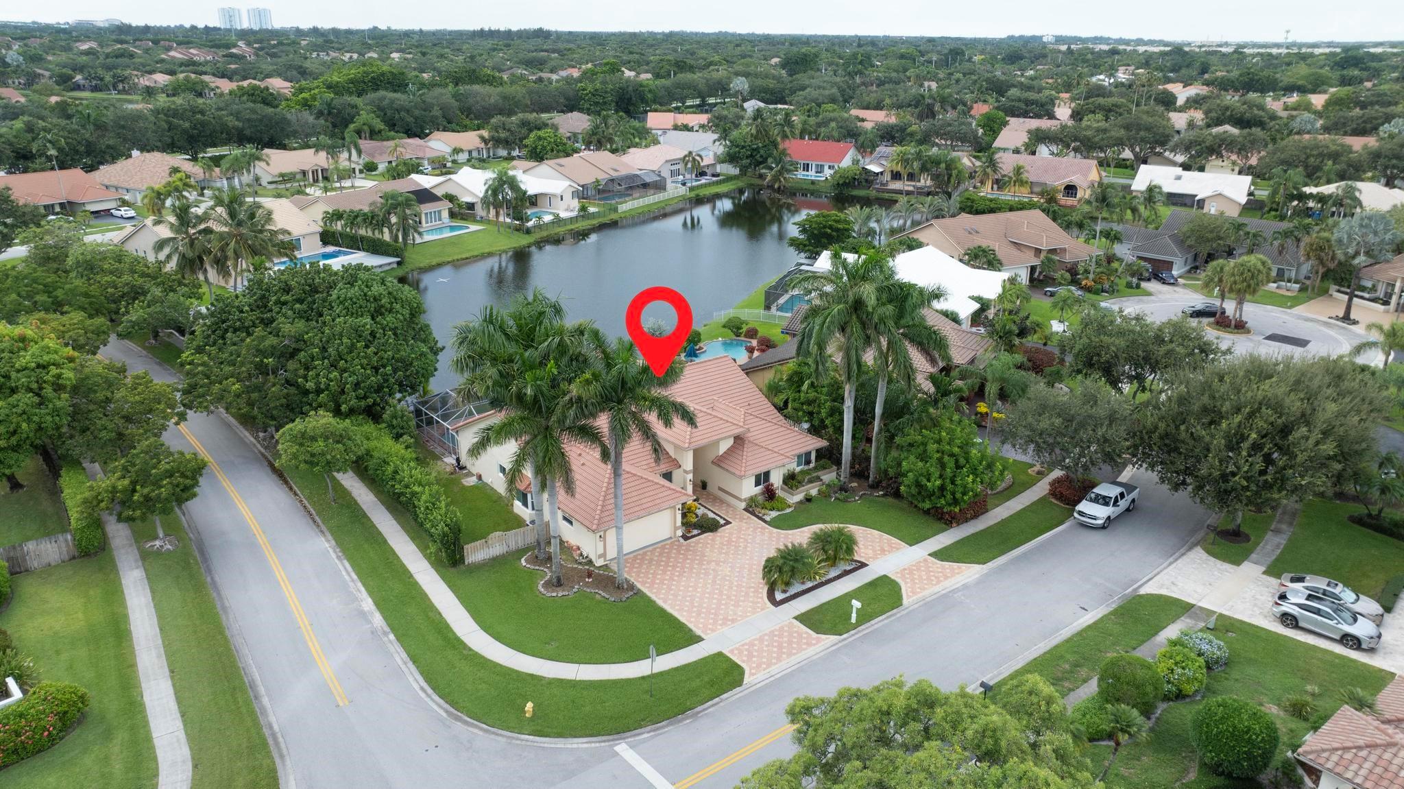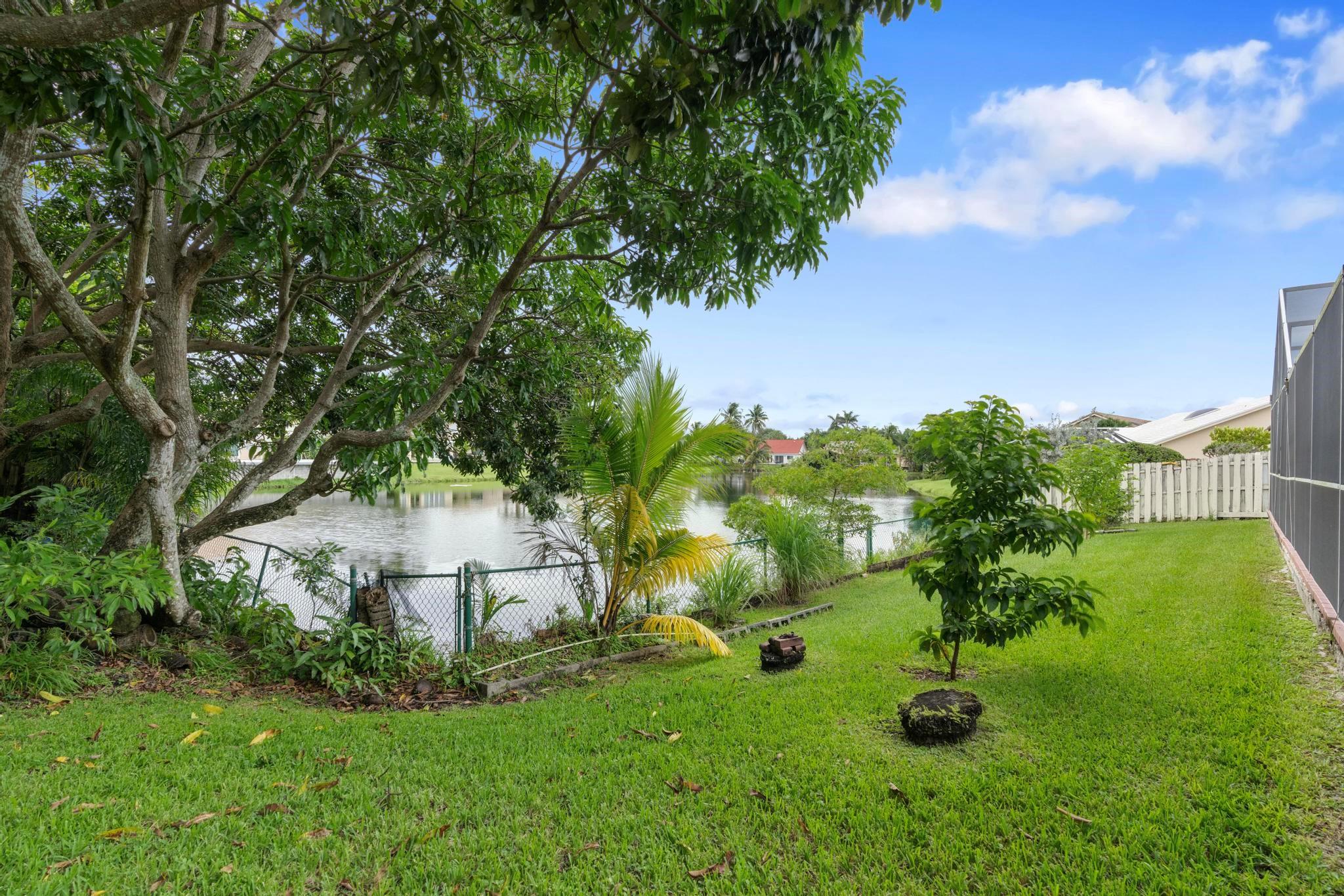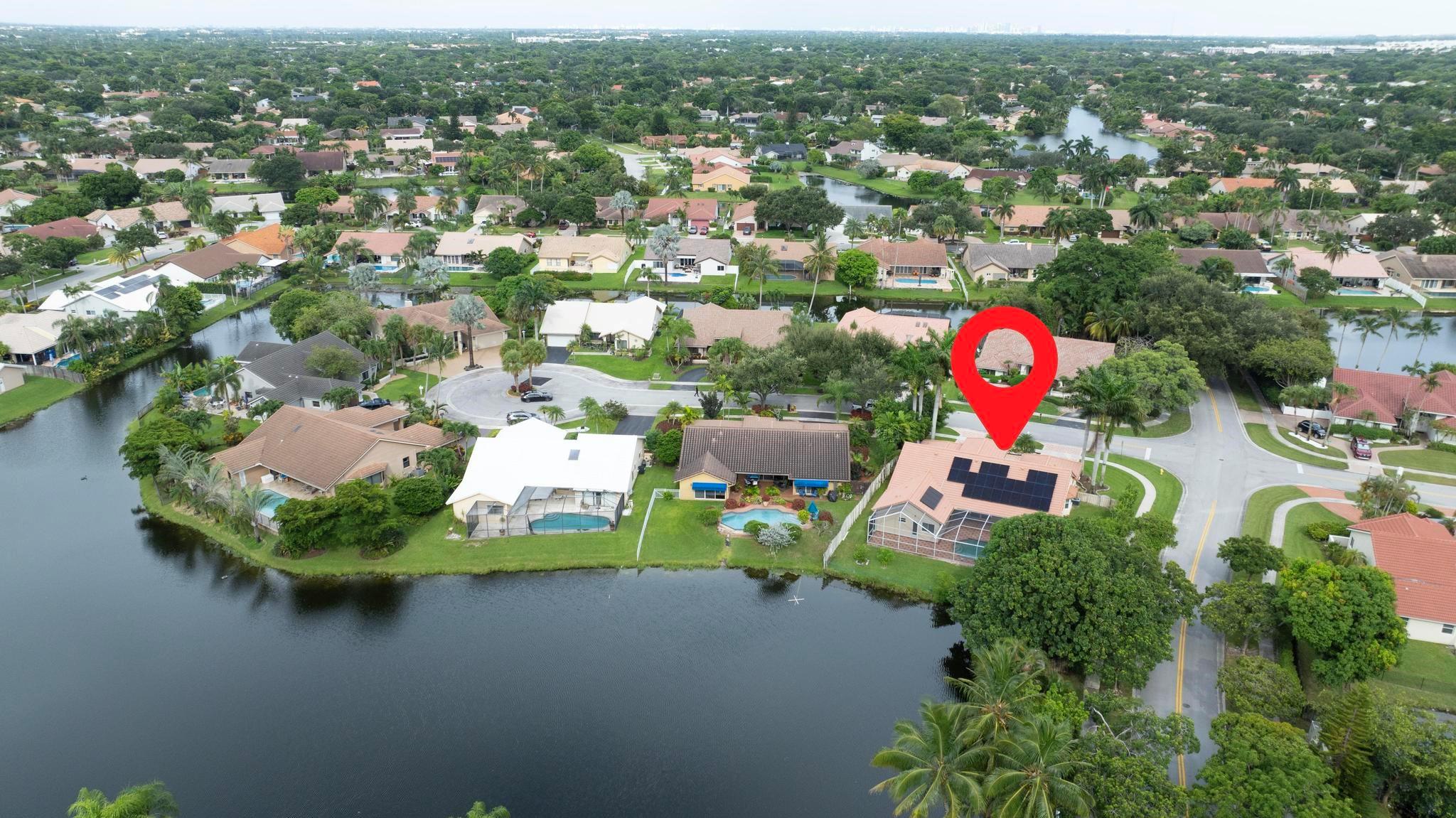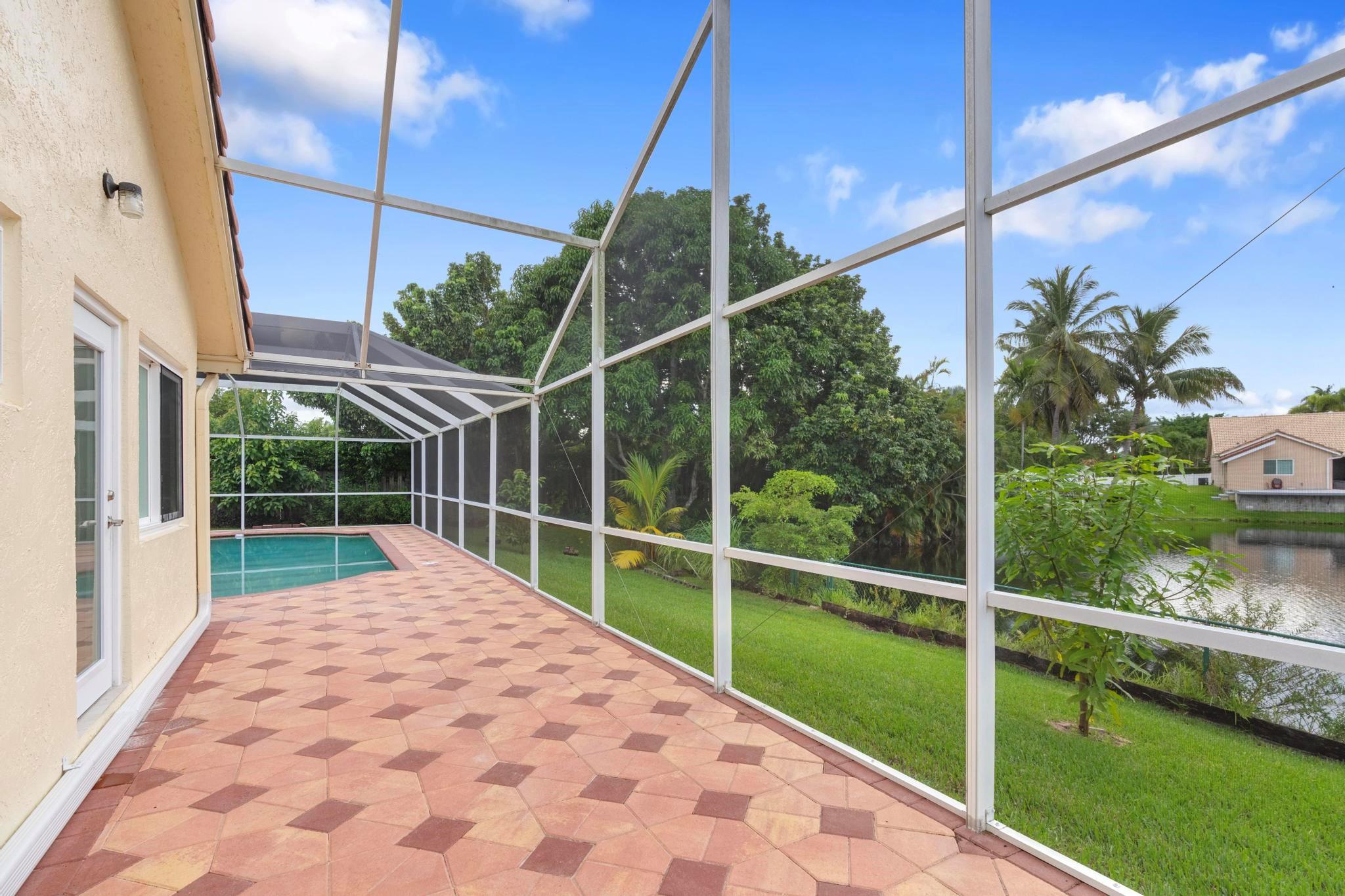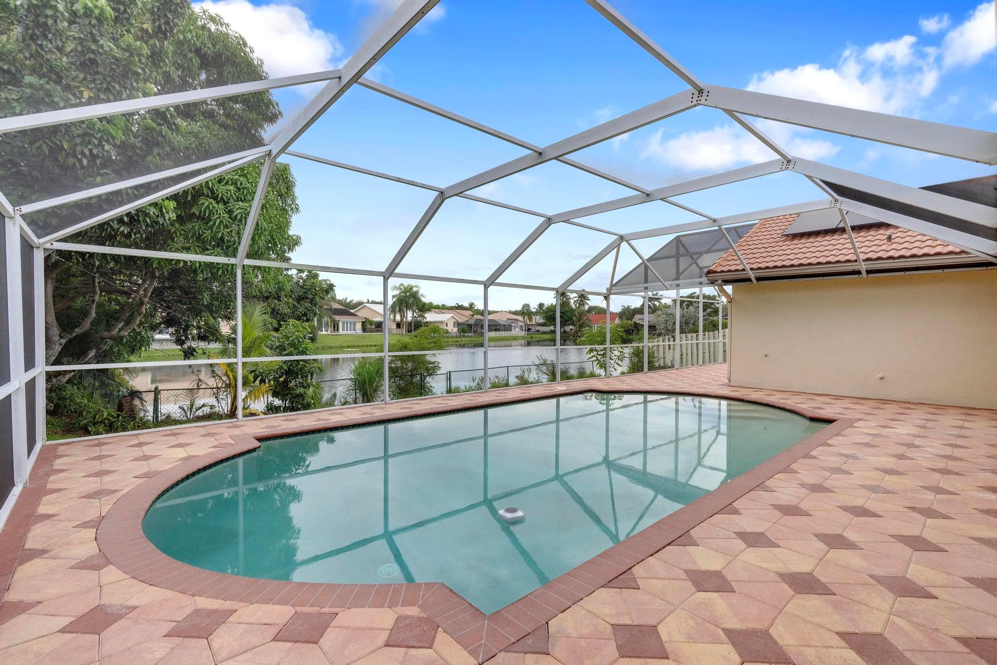 This exquisite single-story corner estate home offers luxurious living with its 4 bedrooms and 2.5 bathrooms spread over 3,028 square feet. Enjoy stunning lake views and the convenience of new hurricane impact windows. The recently renovated bathroom features high-end finishes, while the layout includes a wet bar, perfect for entertaining. Relax in the heated Jacuzzi with massage jets or unwind in the large screened-in pool, providing a private oasis for leisure. Additional features include dimmable LED recessed lighting, security cameras for peace of mind, and a newly installed paved driveway leading to a spacious 2-car garage. Located near Central Park with easy access to major roads and shopping malls, the home also boasts a solar panel system that can be transferred.