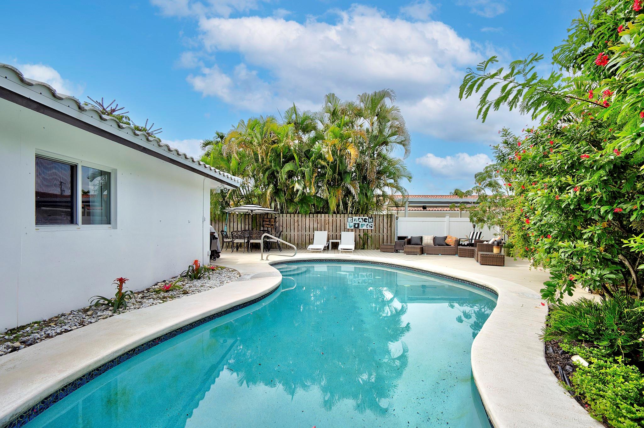 Welcome to this charming 2-bedroom, 2-bathroom home in the sought-after Imperial Point Community. Boasting nearly 2000 square feet of bright, open living space, this property offers the potential to convert into a 3rd bedroom. Enjoy the peace of mind provided by impact windows and a private, lush backyard featuring a kidney-shaped pool. The roof was replaced in 2010, and the HVAC system was updated in 2022. Conveniently located just 2 miles from Fort Lauderdale Beach, as well as shopping, dining, and top-rated schools like Westminster Academy, Pinecrest, and Cardinal Gibbons.