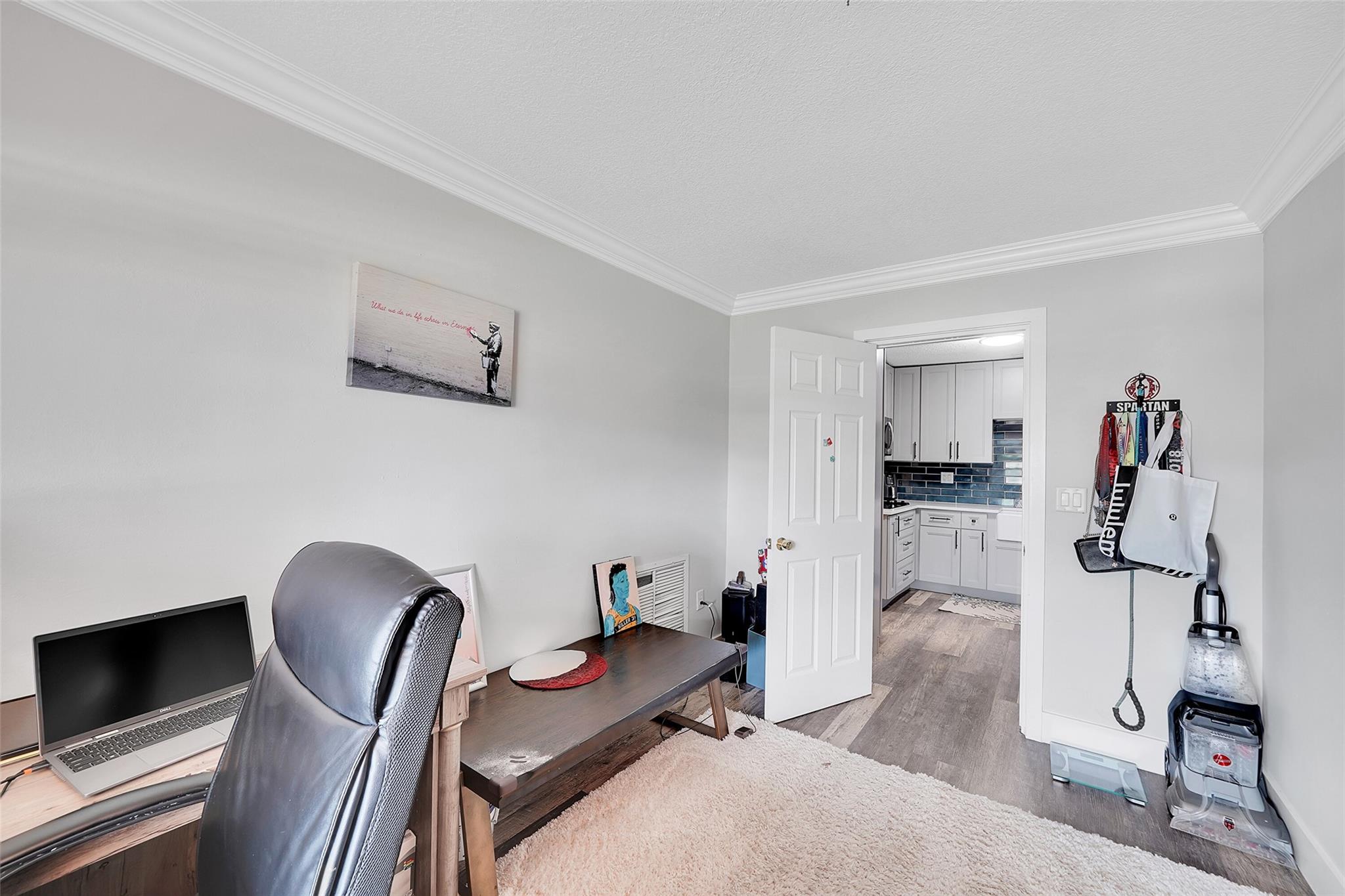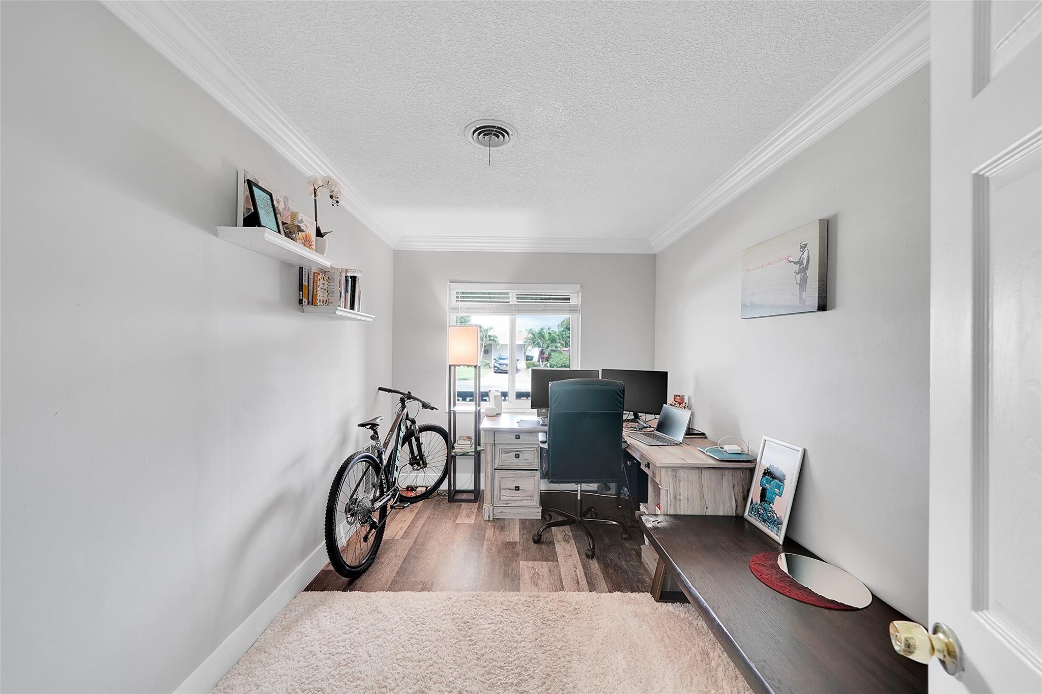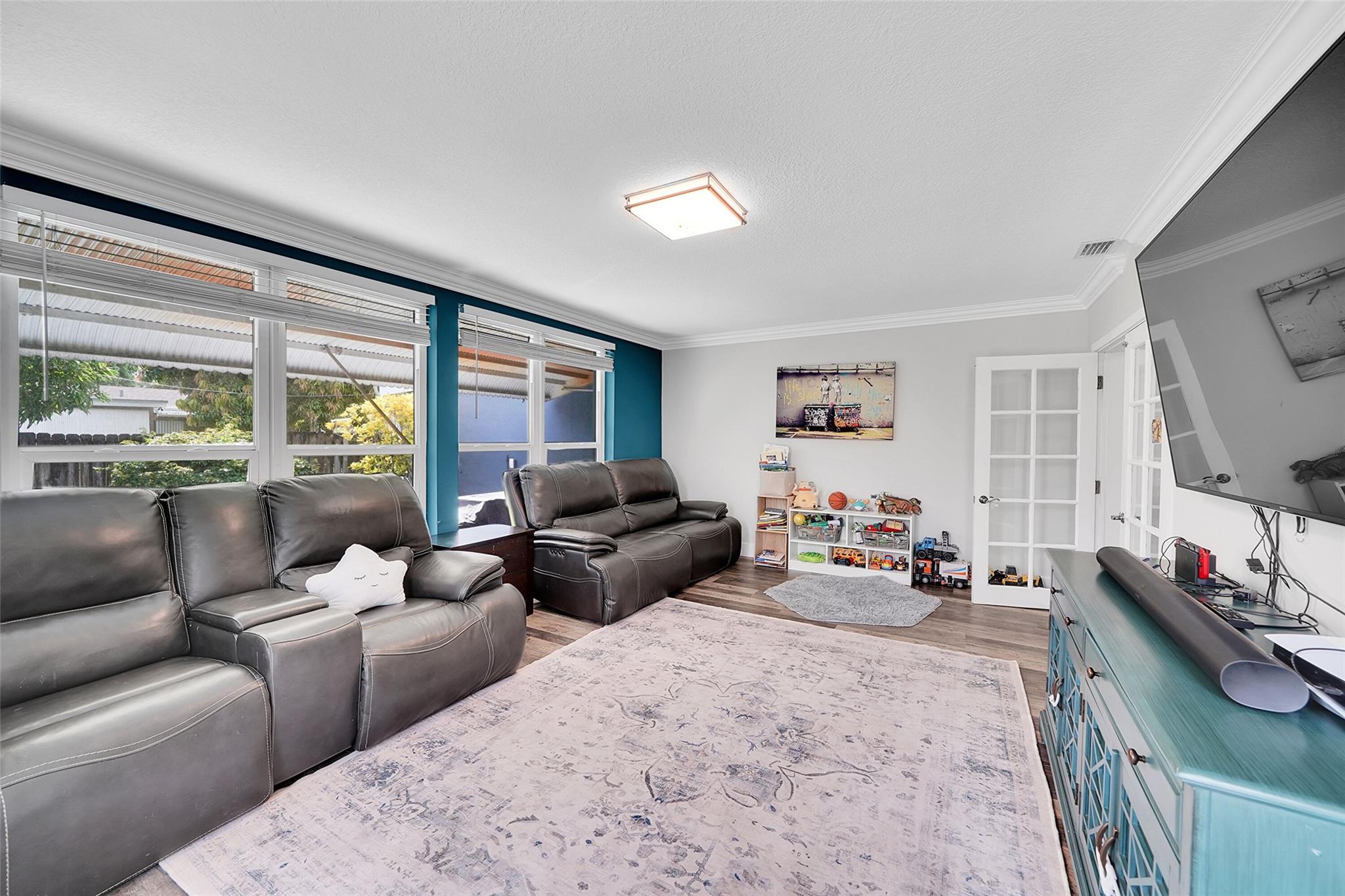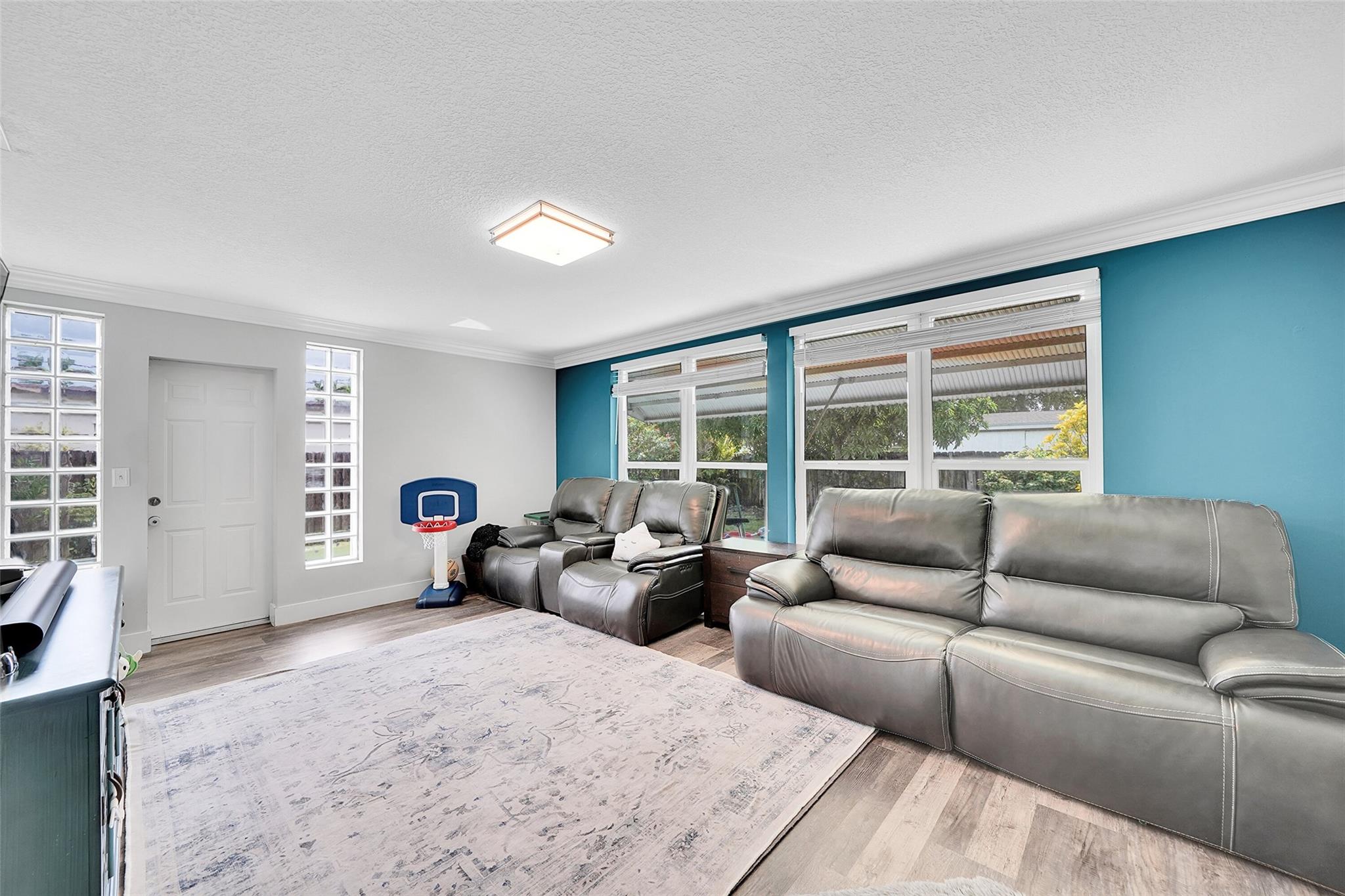 Discover this stunning Hollywood home with no HOA fees! Featuring four bedrooms, three bathrooms, plus an office, this residence offers a main house with three bedrooms and two bathrooms, alongside an office and a separate one-bedroom, one-bathroom efficiency with its own private entrance. Enjoy a host of upgrades including a remodeled kitchen, updated bathrooms, crown molding throughout and vinyl tile flooring throughout. The home boasts interior laundry, spacious living and family rooms, a newer roof, insulated attic, impact-resistant windows and doors, a tankless water heater, and a recent A/C system. French doors lead to a private family room, and the backyard features a large concrete patio ideal for gatherings.
