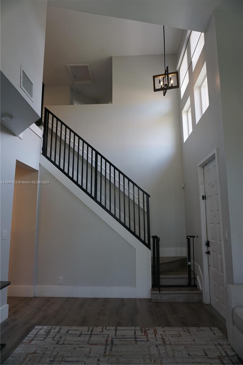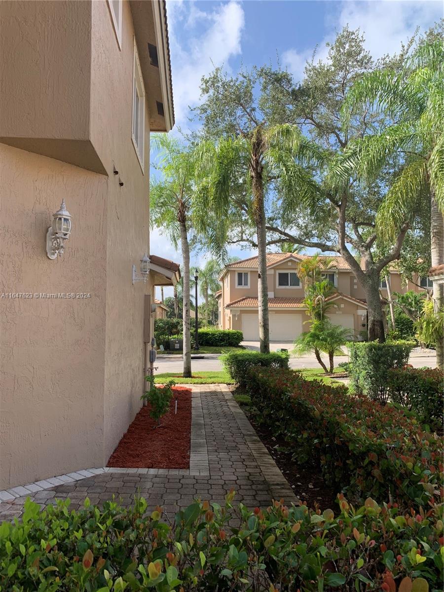 A two-story, 3-bedroom, 2.5-bathroom corner-unit townhouse situated in the desirable Courtyards at Grand Palms Golf & Country Club. This spacious home is filled with natural light and features tall ceilings, wood floors throughout, remodeled bathrooms, and a large two-car garage with an additional paved driveway accommodating two more cars. All bedrooms are located on the second floor. The communal open lawn area behind the property offers extra privacy. Roof replaced 2021 (date of last permit). The community includes a pool within the Courtyards subdivision and is just steps away from the golf course. The HOA covers 24-hour security, exterior painting, landscape and irrigation maintenance. Application fee is $100. Electrical Panel original and model: Square D. HVAC original 12/98.