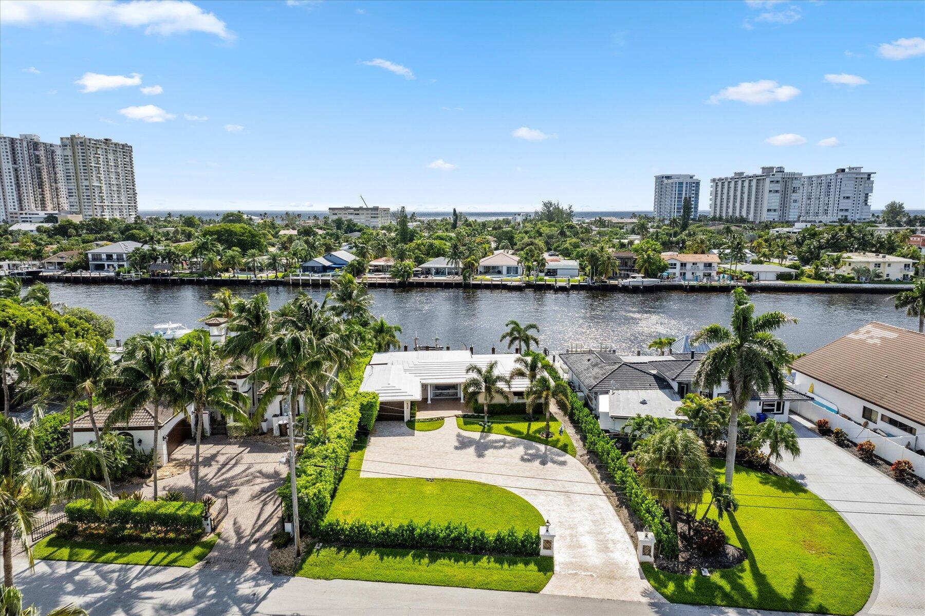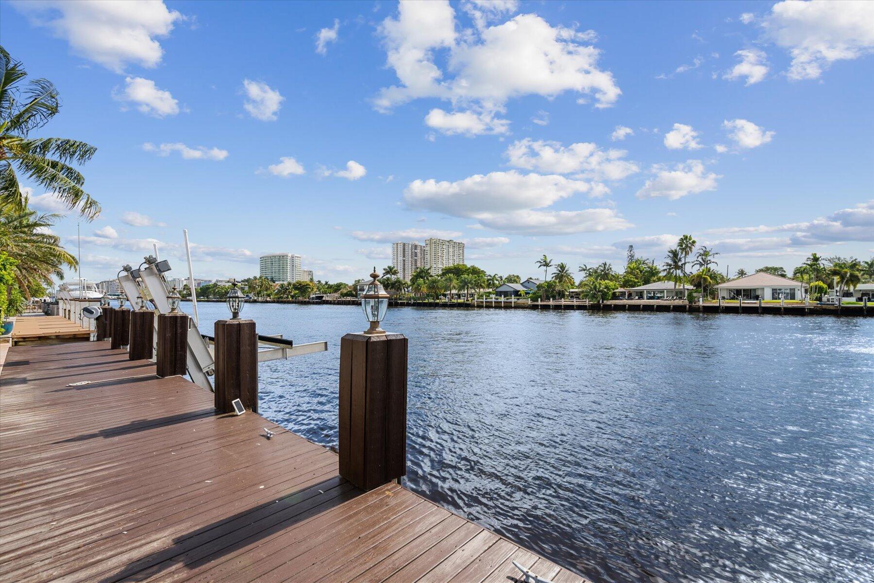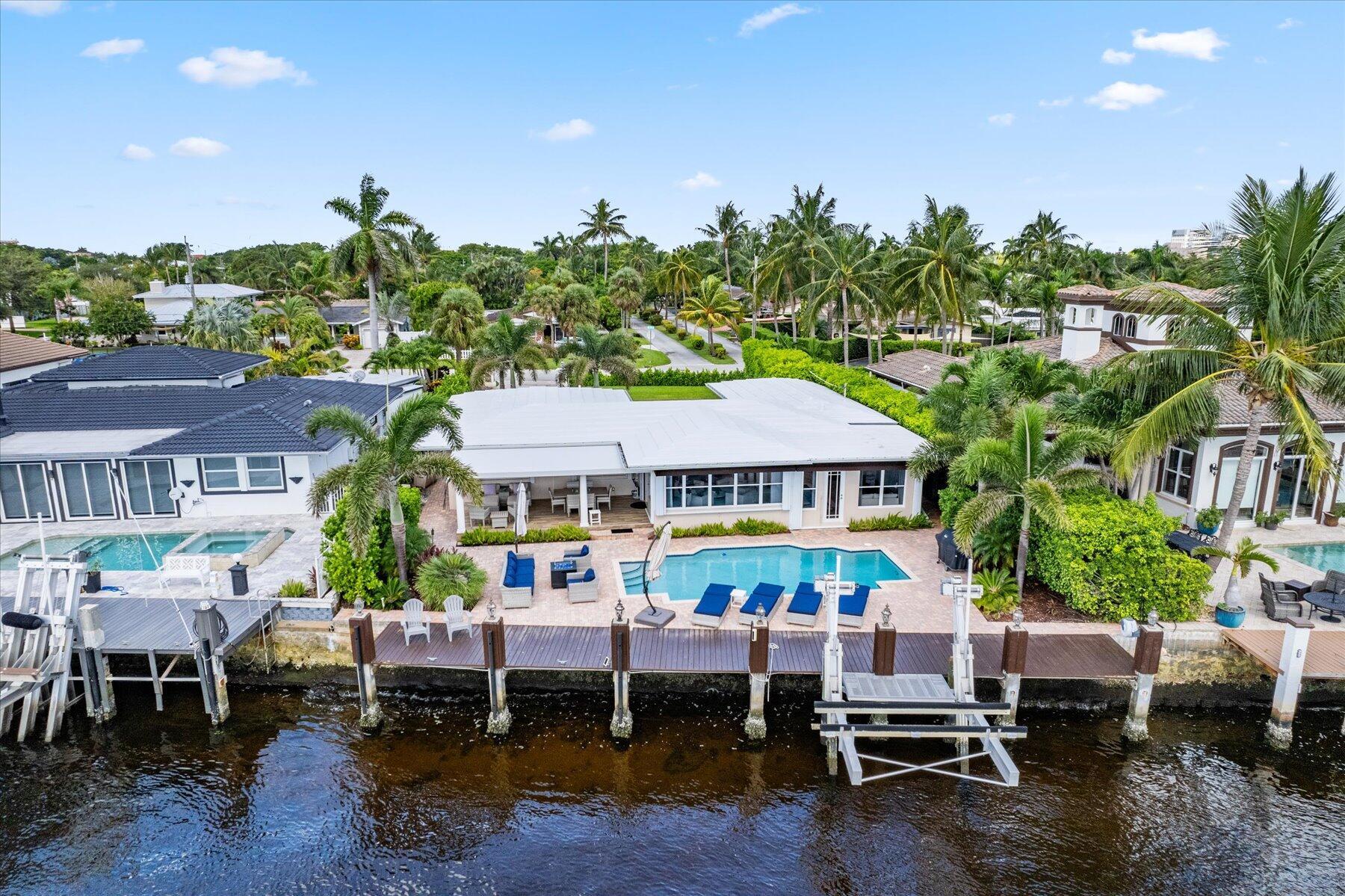 Discover the epitome of luxury living in this breathtaking Intracoastal home. Check off all your housing desires: 3 bed, 2 bath, 1 car garage, bonus den/office, pool and waterfront! This exquisite property offers the perfect blend of comfort, style and outdoor living with stunning water views. Enjoy 75 feet of waterfront with a private dock and a 25,000 lb boat lift. A sparkling pool with a heater and a large covered area provide the ultimate setting for entertaining and relaxing. The home boasts a massive paved driveway with plenty of space to park multiple vehicles or your boat trailer or RV. Property is located 3 miles to the Hillsboro Inlet giving easy access to the Atlantic Ocean with no fixed bridges. Dining, entertainment and beach close b