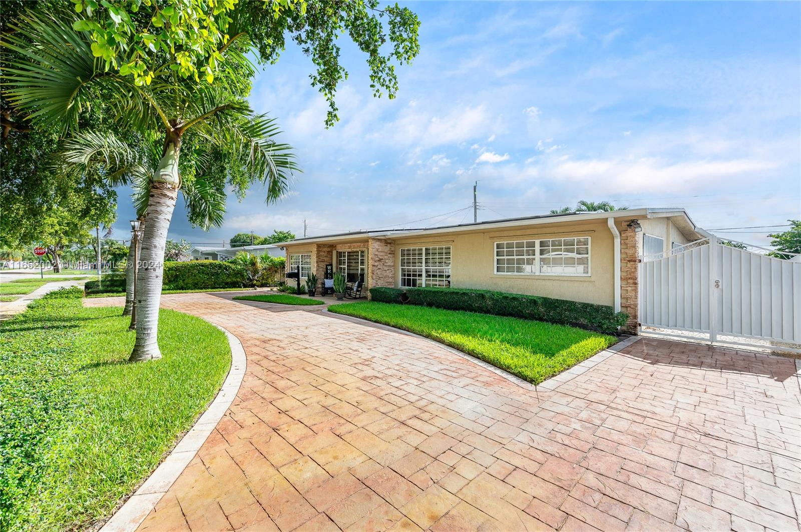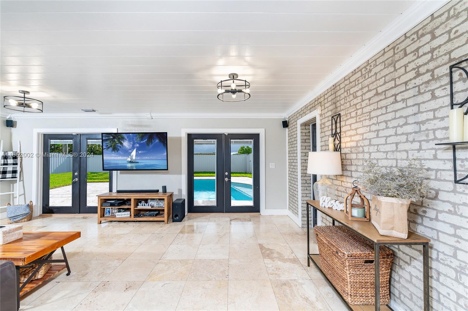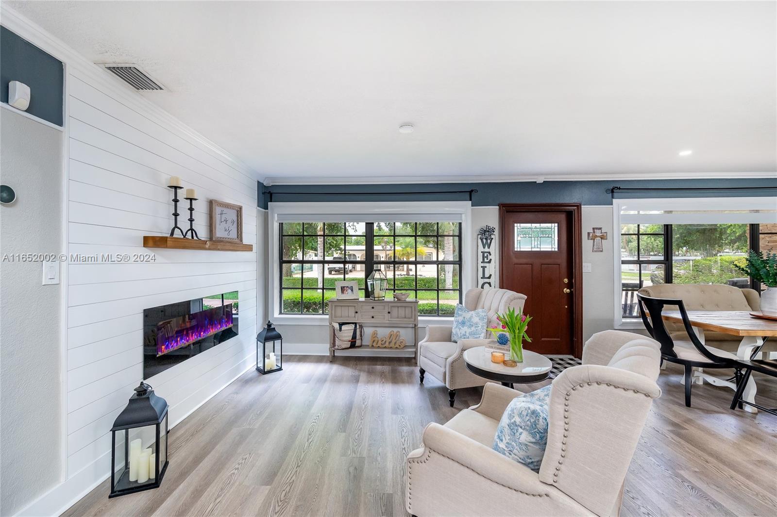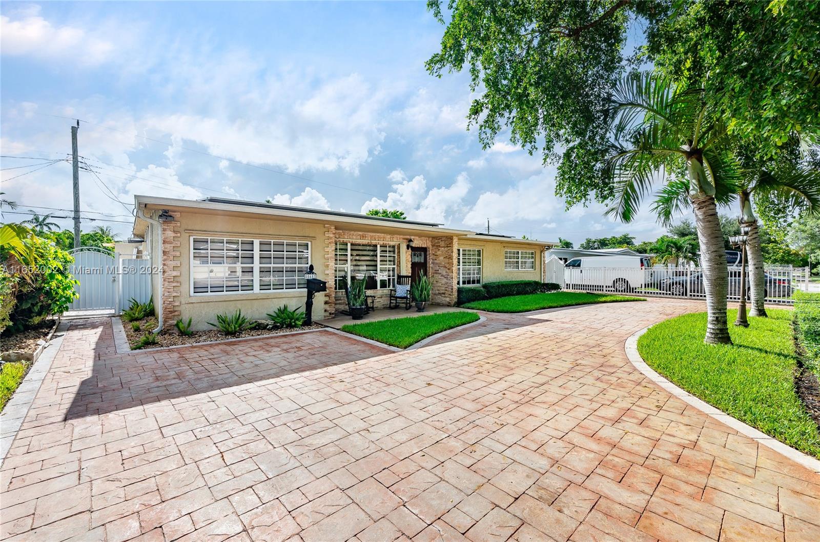 Discover this beautifully updated farmhouse-chic pool home in Hialeah's Palm Springs area, offering signficant savings thanks to its energy-efficient solar panels. The open-concept living space invites you to unwind by a sleek electric fireplace, perfect for cozy conversations. The kitchen boasts shaker wood cabinetry, quartz countertops, and stainless steel appliances, all centered around a spacious island. This well-designed floor plan offers two primary en-suite bedrooms and a family room with French doors opening to a travertine-covered terrace. Enjoy outdoor entertaining by the saline pool with its modern waterfall feature. The fenced backyard includes dual side gates for easy access. Conveniently located near Palm Springs Middle, SR826, major roads, hospitals, shopping, and dining.