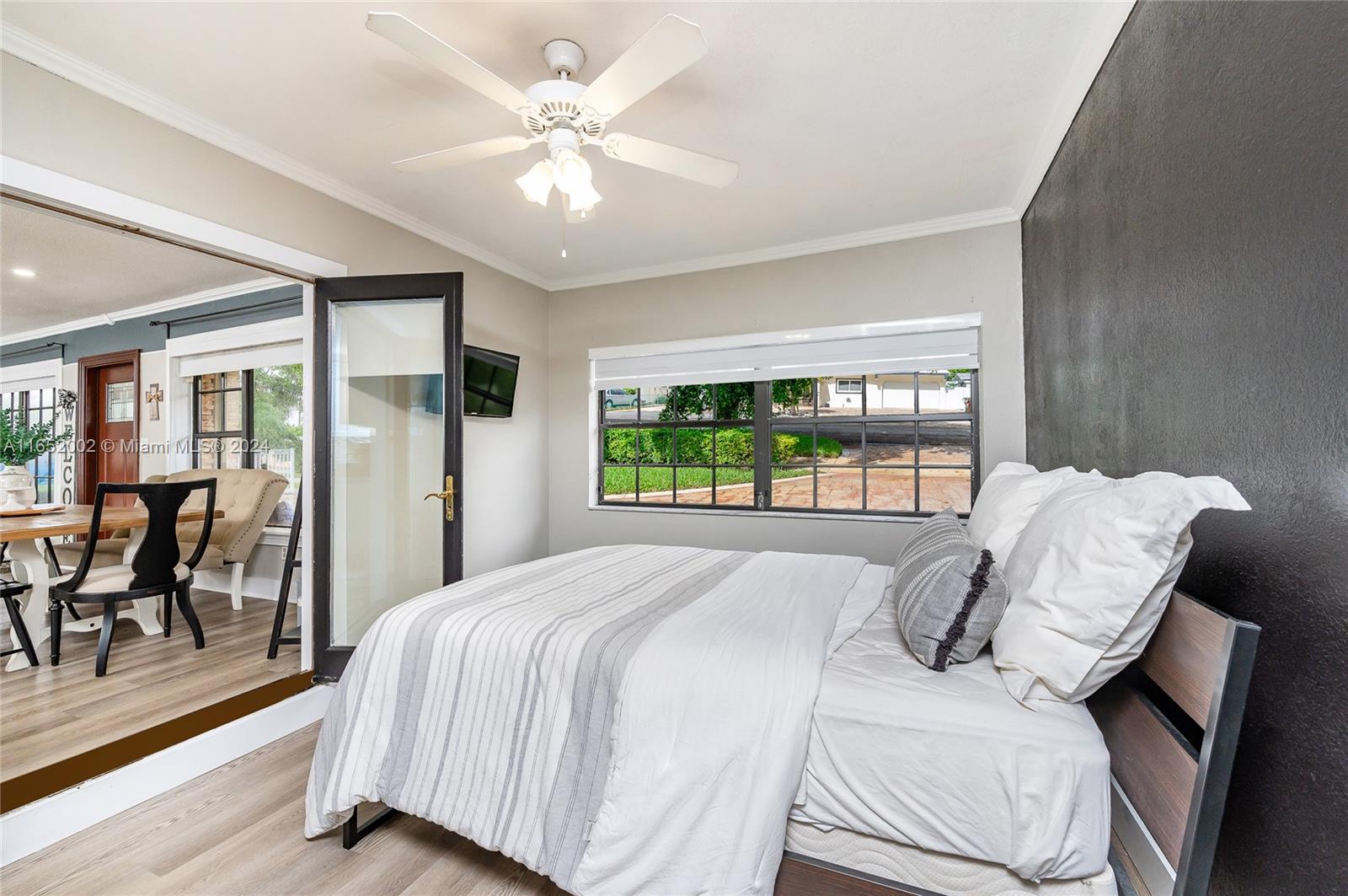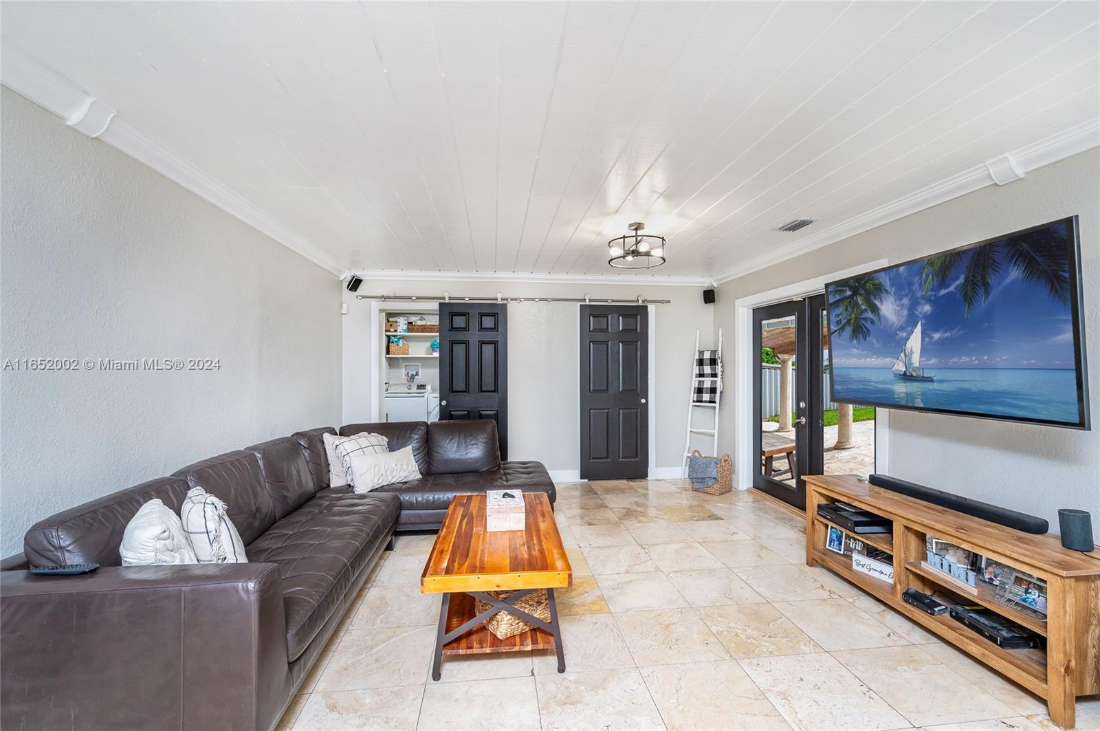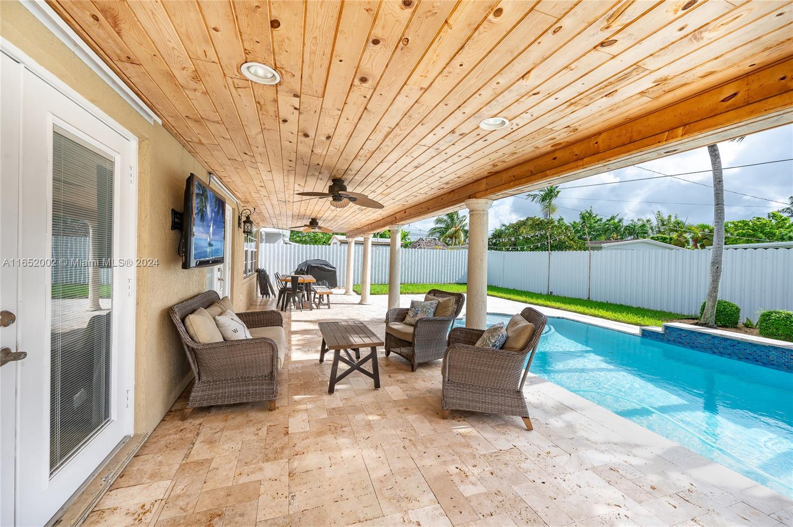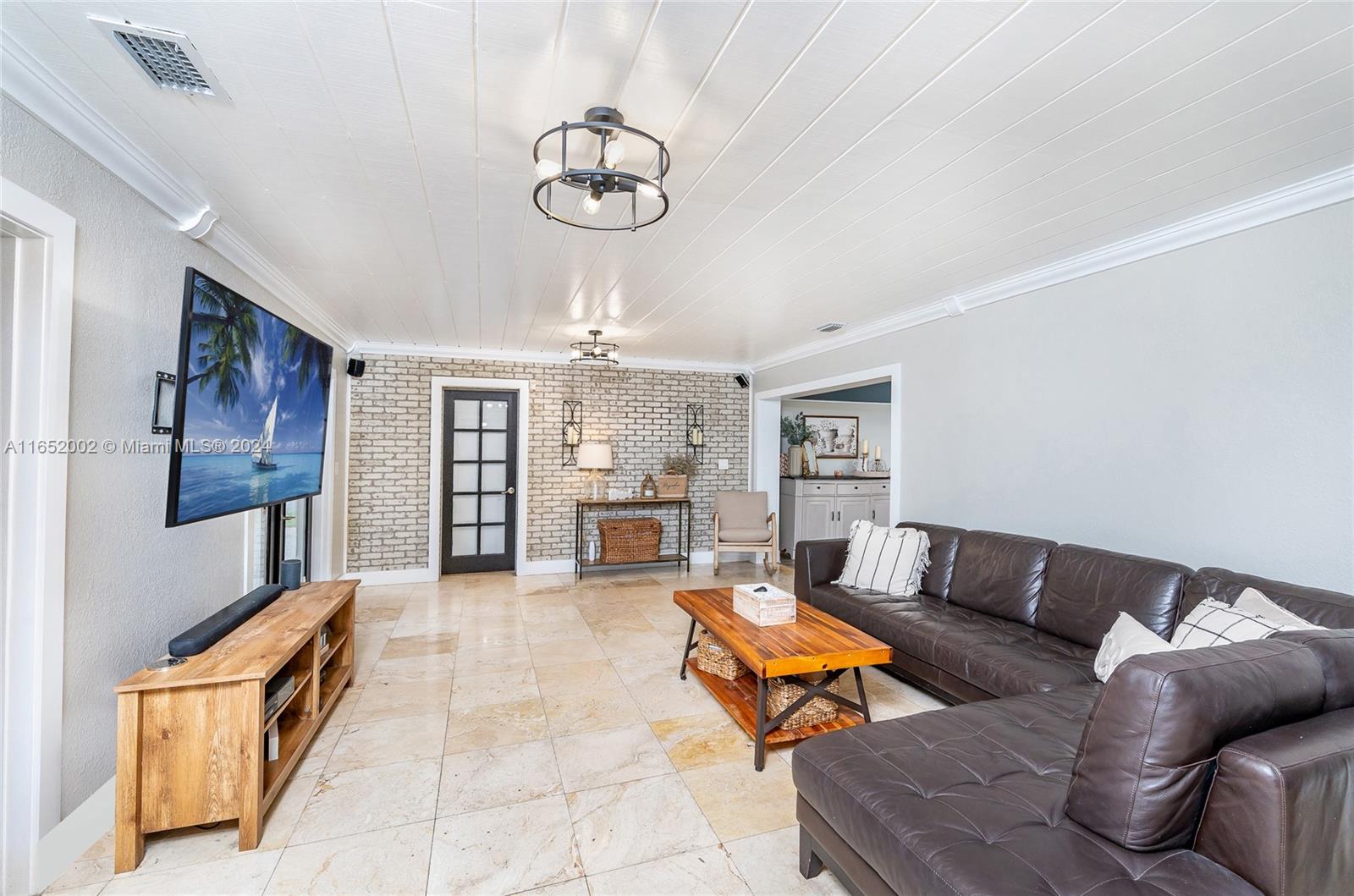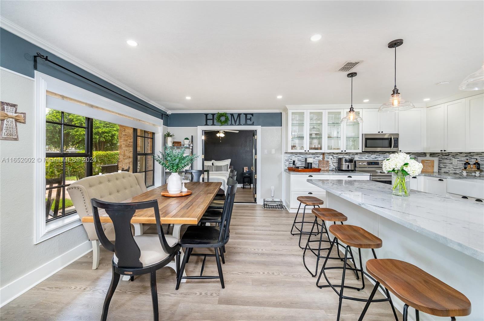 Discover this beautifully updated farmhouse-chic pool home in Hialeah's Palm Springs area, offering signficant savings thanks to its energy-efficient solar panels. The open-concept living space invites you to unwind by a sleek electric fireplace, perfect for cozy conversations. The kitchen boasts shaker wood cabinetry, quartz countertops, and stainless steel appliances, all centered around a spacious island. This well-designed floor plan offers two primary en-suite bedrooms and a family room with French doors opening to a travertine-covered terrace. Enjoy outdoor entertaining by the saline pool with its modern waterfall feature. The fenced backyard includes dual side gates for easy access. Conveniently located near Palm Springs Middle, SR826, major roads, hospitals, shopping, and dining.