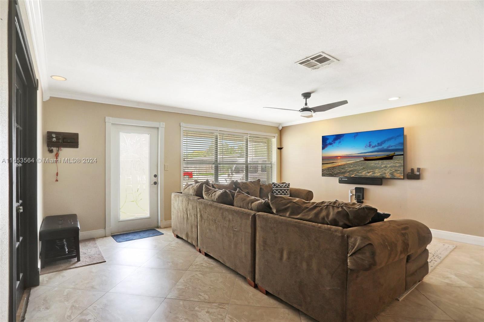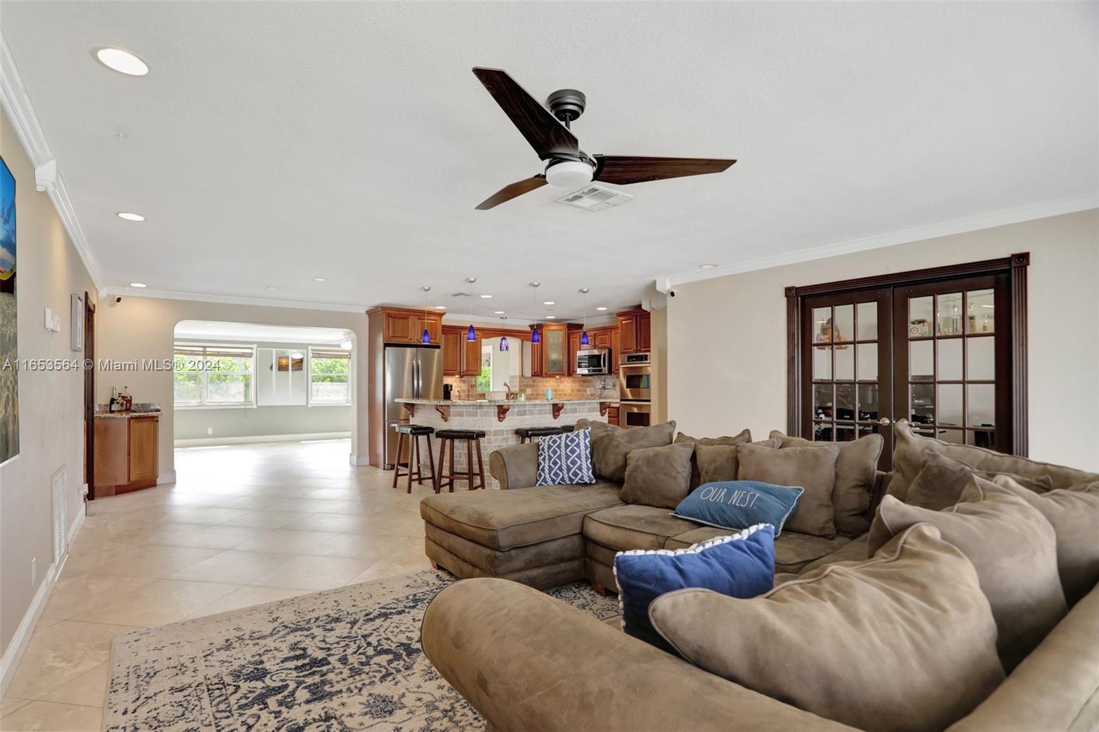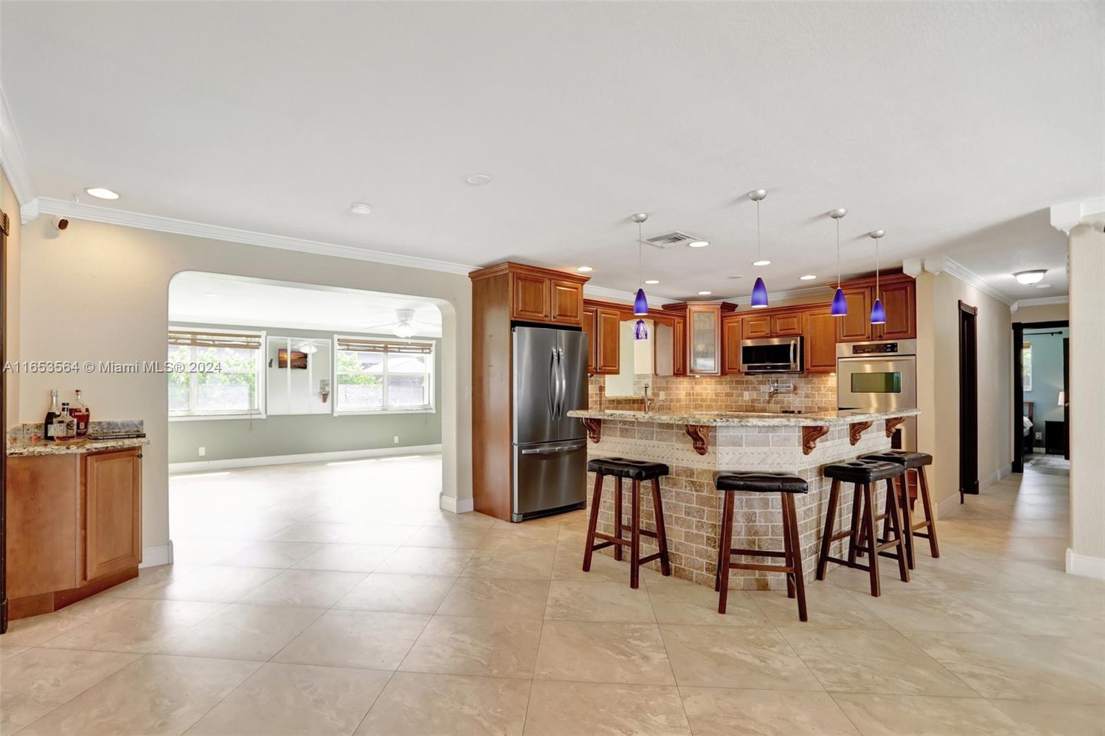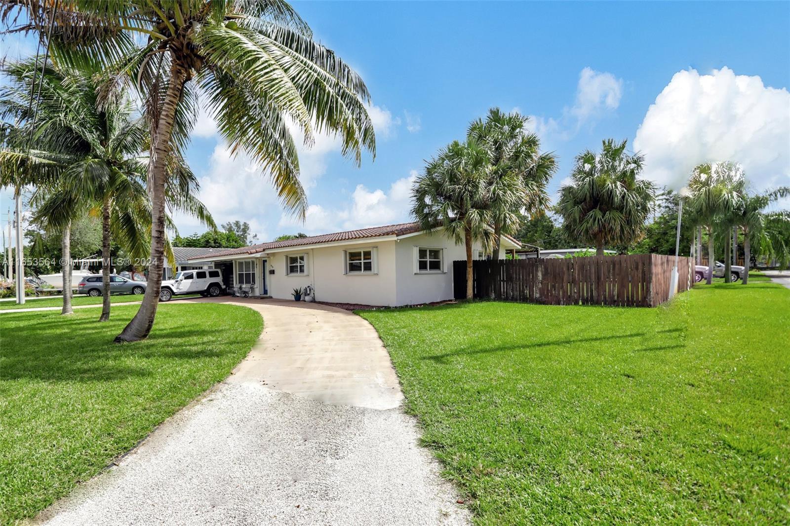 Welcome to this charming ranch-style 4-bed, 2-bath home on a 1/4-acre lot. Enjoy the open kitchen featuring stainless steel appliances, granite counters, wood cabinets, a large island with breakfast bar, and dual convection ovens. Elegant 24" Italian porcelain tile and crown molding throughout. Relax in the master bath's Jacuzzi tub or entertain in the spacious Florida room with a bar. Step outside to a 16'x32' covered patio, lush garden and a large backyard. Extras include a large laundry room, enclosed carport, hurricane impact doors, and accordion shutters. Water filtration system for the whole house installed. Roof 2020, water heater 2020. Quiet street with great neighbors - Bonus: big circular driveway, storage shed and big space for your boat!
