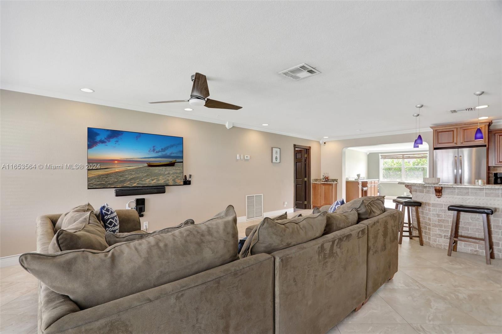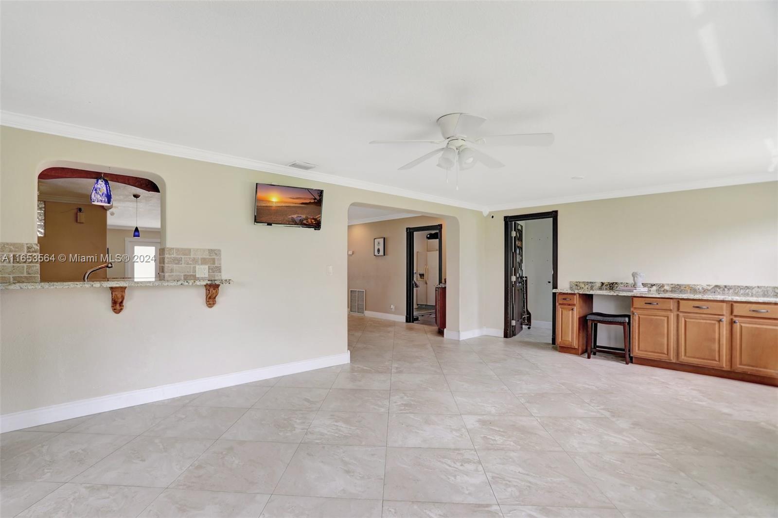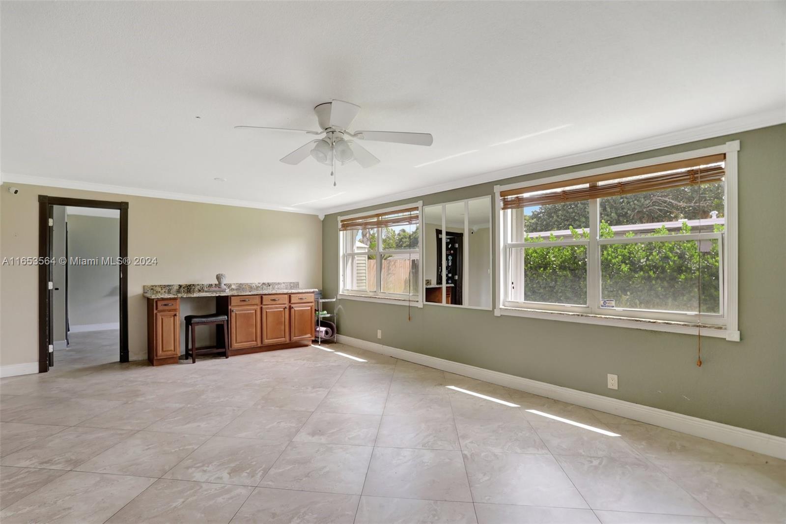 Welcome to this charming ranch-style 4-bed, 2-bath home on a 1/4-acre lot. Enjoy the open kitchen featuring stainless steel appliances, granite counters, wood cabinets, a large island with breakfast bar, and dual convection ovens. Elegant 24" Italian porcelain tile and crown molding throughout. Relax in the master bath's Jacuzzi tub or entertain in the spacious Florida room with a bar. Step outside to a 16'x32' covered patio, lush garden and a large backyard. Extras include a large laundry room, enclosed carport, hurricane impact doors, and accordion shutters. Water filtration system for the whole house installed. Roof 2020, water heater 2020. Quiet street with great neighbors - Bonus: big circular driveway, storage shed and big space for your boat!