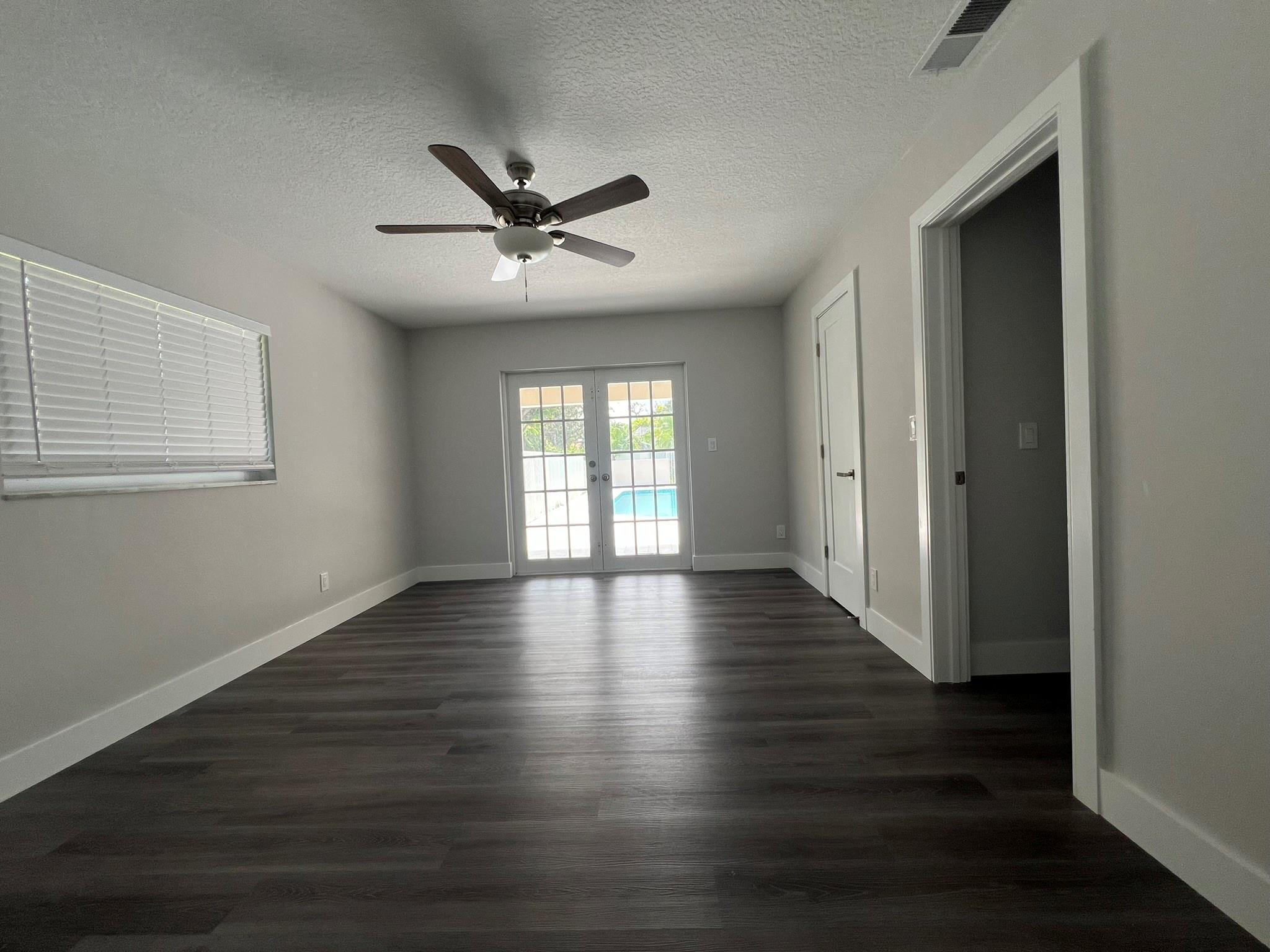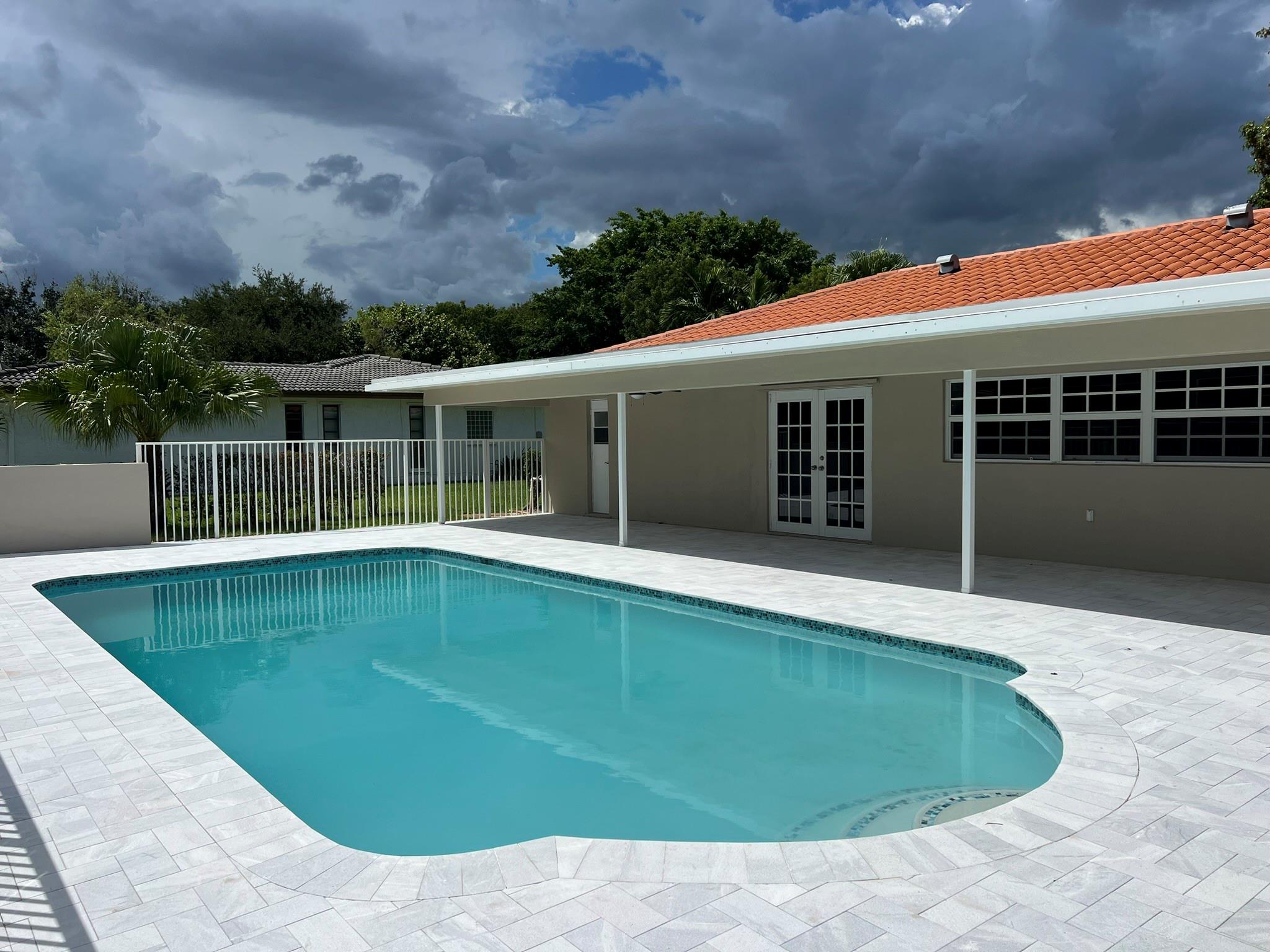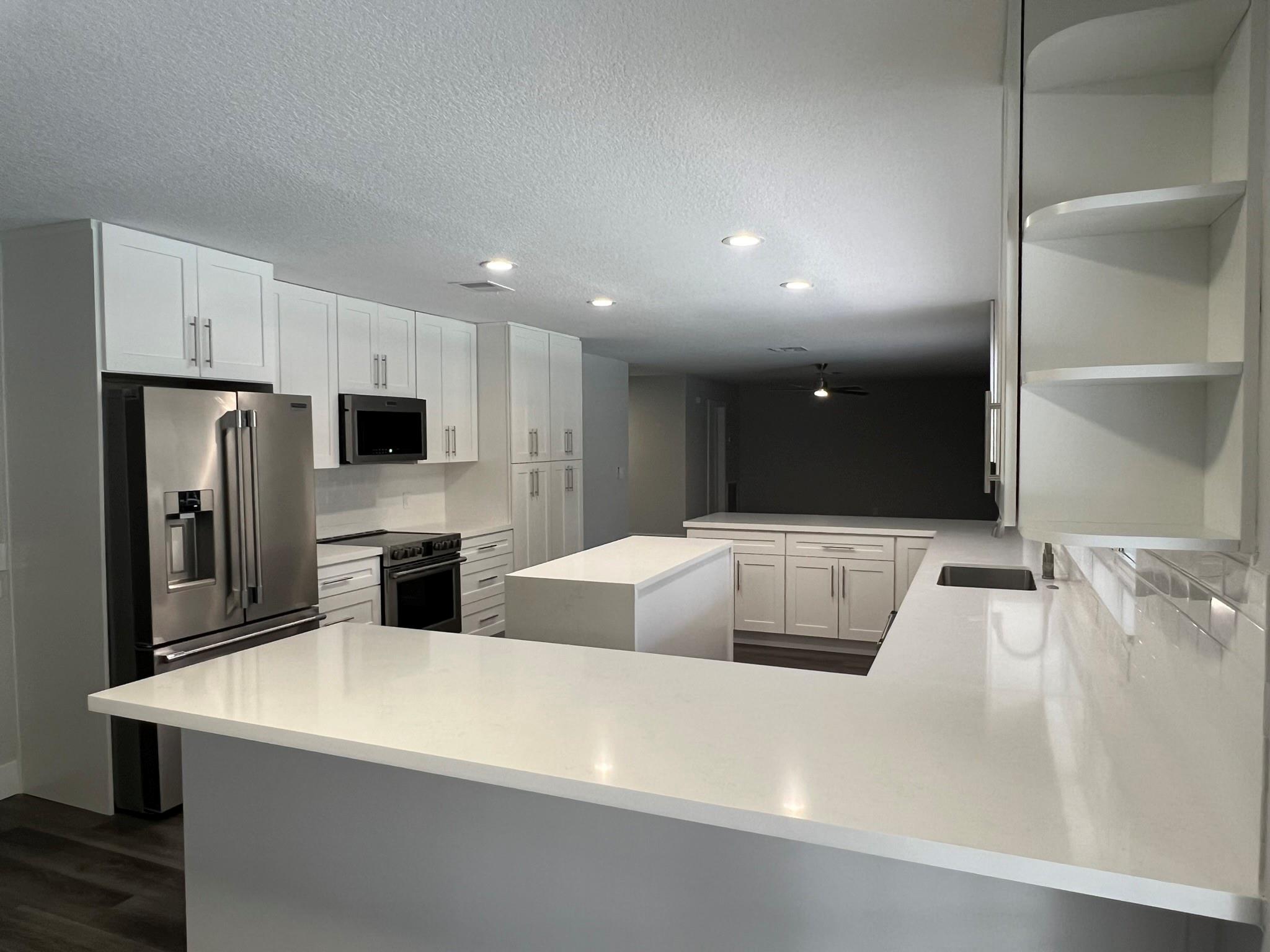 This stunning home features modern 42-inch white shaker cabinets, quartz countertops with a spacious island, and new stainless steel appliances. The updated bathrooms mirror the kitchen's style with shaker cabinets and quartz counters. The layout includes new vinyl wood flooring, 4 large bedrooms, and 3 bathrooms, with potential for two additional bedrooms—perfect for an executive lifestyle. Situated on an oversized lot, this property offers privacy and outdoor space. The split bedroom plan provides a peaceful retreat, while the family room is great for gatherings. The pool and open patio feature travertine tile, perfect for relaxation. A large interior laundry room adds convenience. The property also includes lush landscaping, impact windows, and a durable 15-year-new barrel-tiled roof.