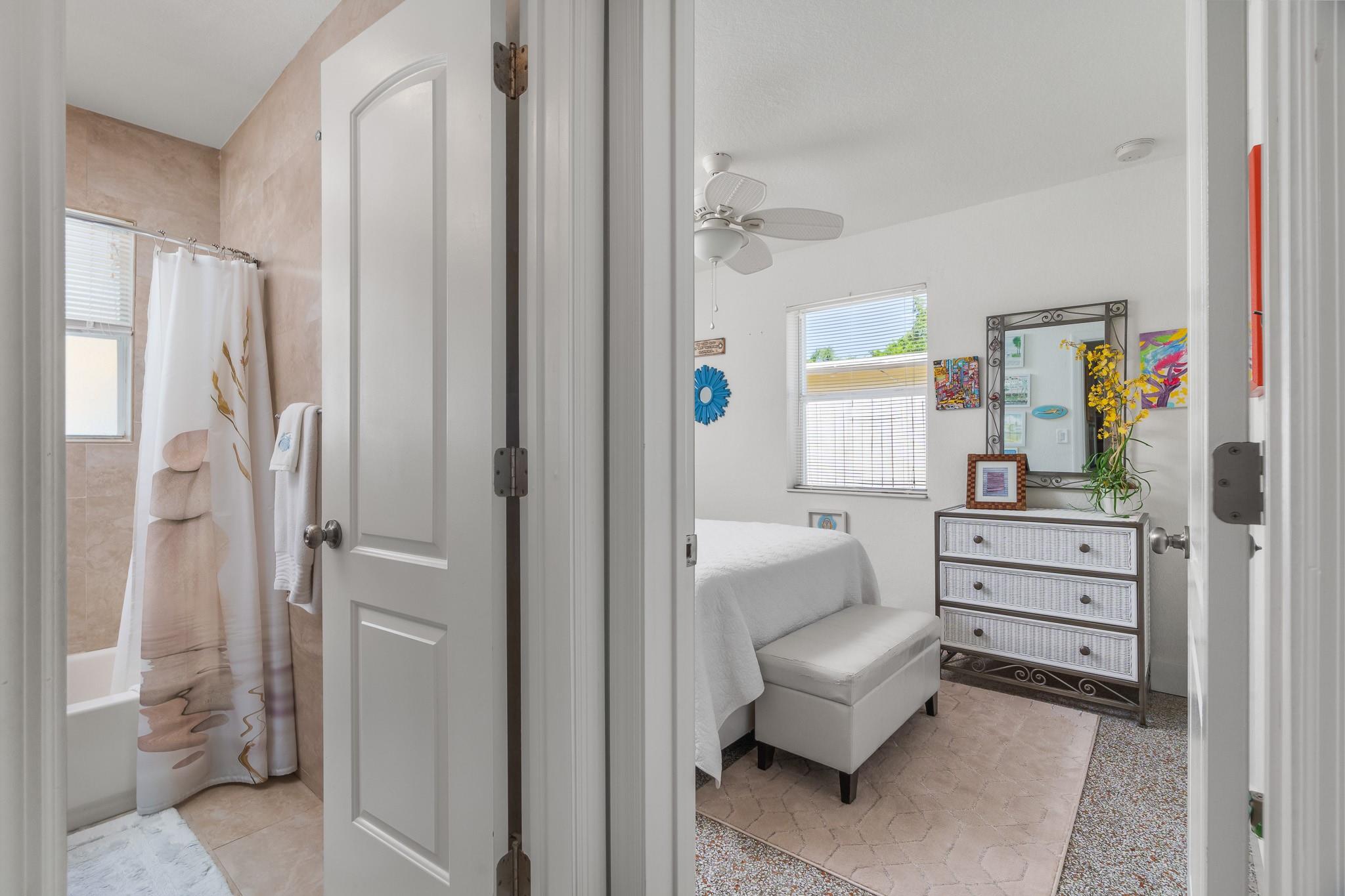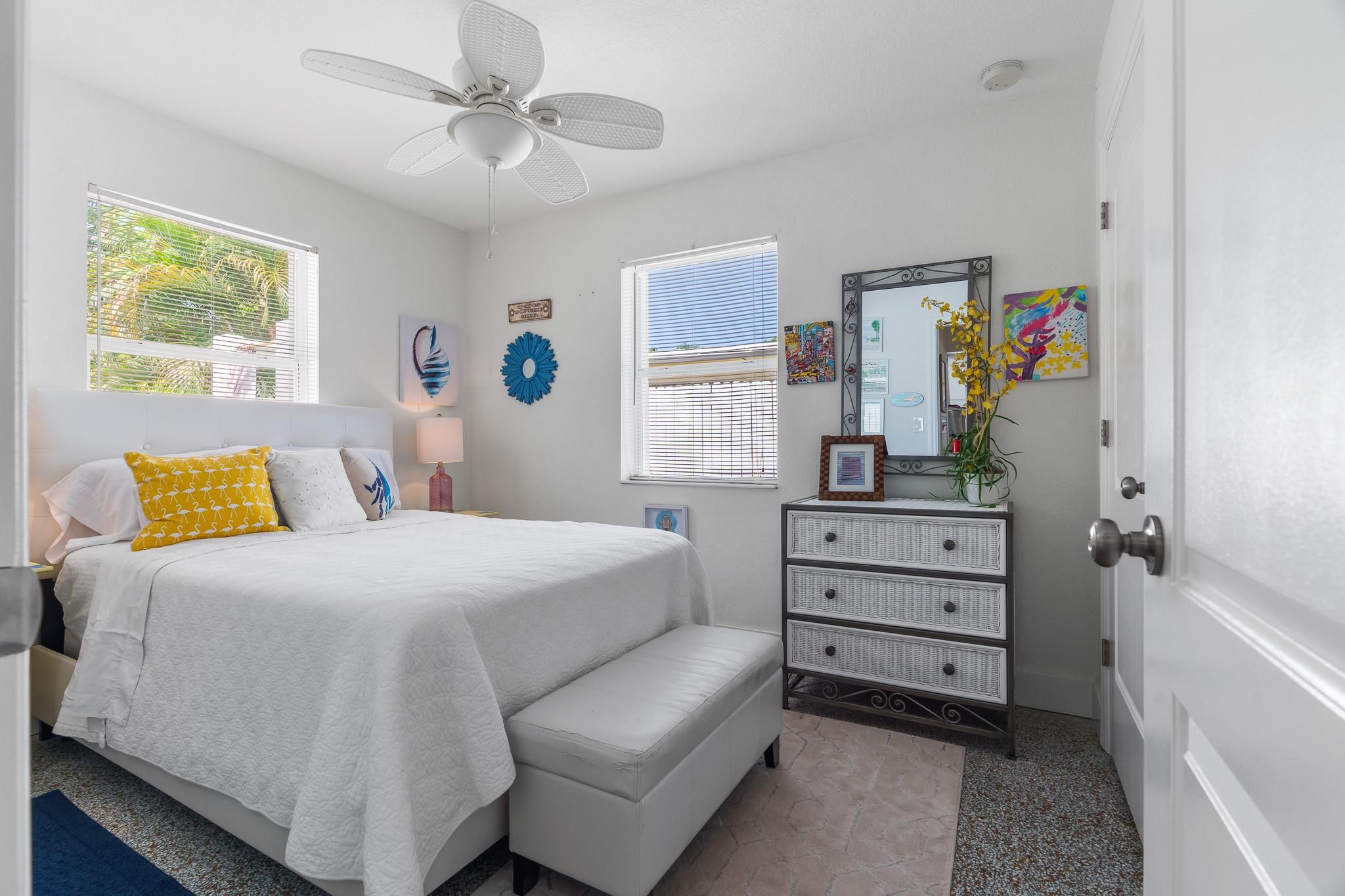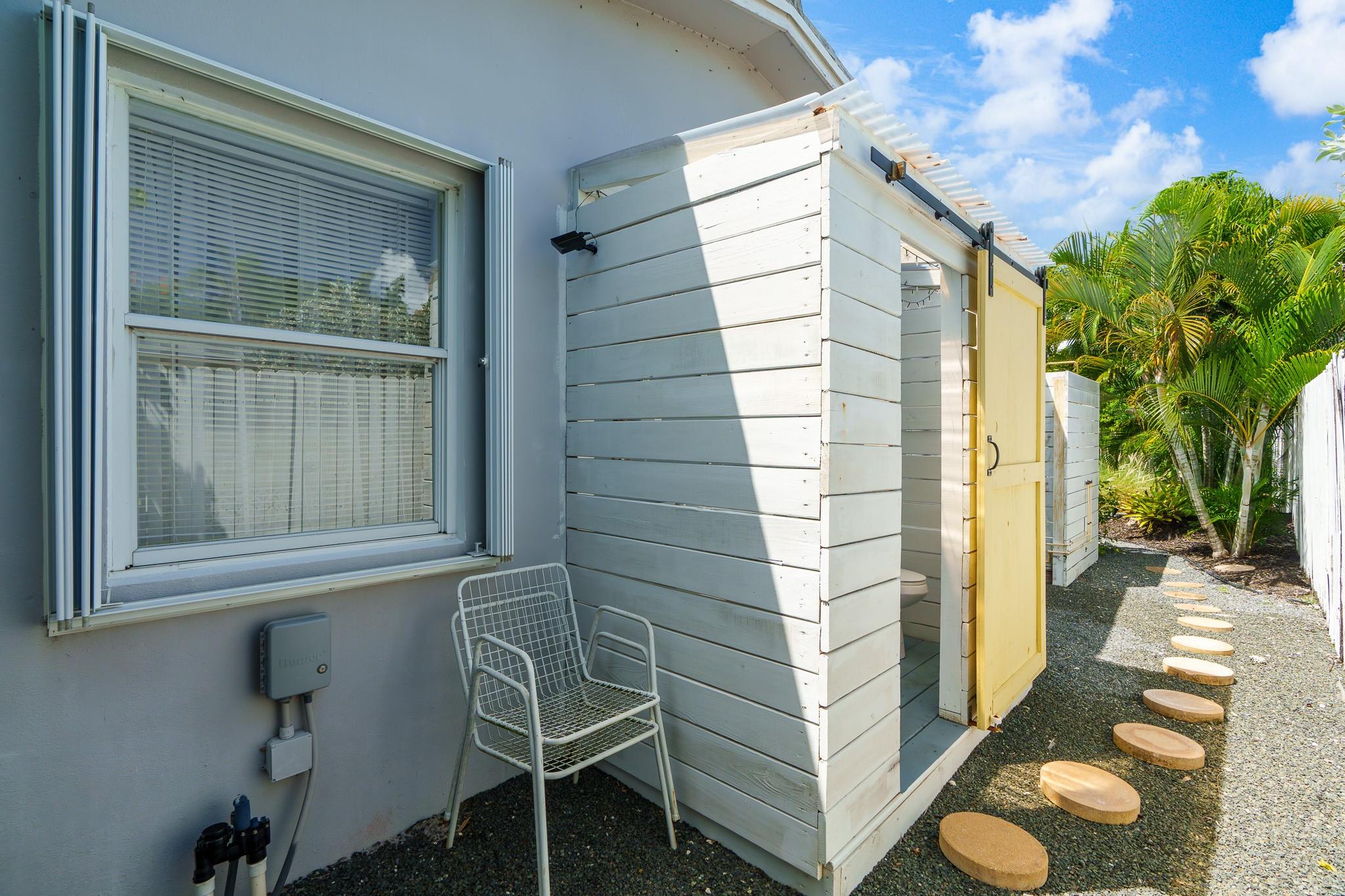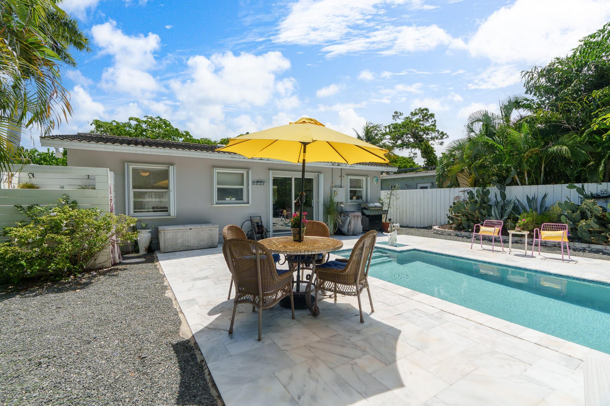 This beautifully renovated 2-bedroom, 1.5-bath single-family home blends modern living with sophisticated details throughout. The home boasts an abundance of windows (with accordion shutters) offering natural light and views of the tropical landscape. TERRAZZO flooring flows seamlessly throughout the home, creating a smooth transition between rooms. The sliders open to a stunning SALTWATER POOL with an expansive MARBLE tile pool deck, perfect for outdoor relaxation. Additional highlights include a brand NEW AC (2024) and a sleek slate barrel ROOF installed in 2016. Updated ELECTRICAL panels, underground wiring, and a whole-house GENERATOR provide peace of mind, while the interior laundry and TANKLESS water heater add convenience to this tropical oasis.