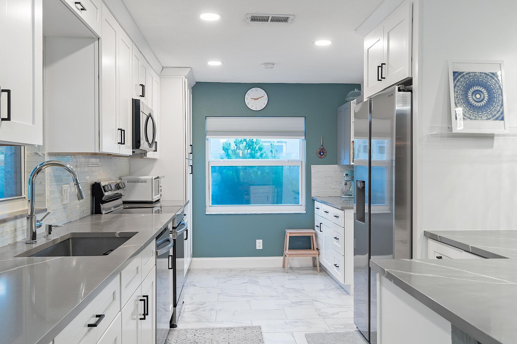 WOW! This amazing, rarely available and totally renovated 3 bed, 2 bath pool home located in the Sandalfoot Cove neighborhood of Boca Raton, NO ASSOC! A-rated schools! Completely redone inside and out. New tile flooring, quartz countertops, new stainless-steel appliances, new washer & dryer, new water heater and impact windows throughout the house bring a modern look to a classic structure. The outside and driveway were recently painted and lush landscaping adding a nice flare. 2019 roof. The open-format living and kitchen space allow for plenty of natural light, with direct access to the recently resurfaced pool and lanai out back. Along with a one-car garage and spacious back yard, no detail was spared in updating this property as a contemporary gem. At this price, it will sell FAST!