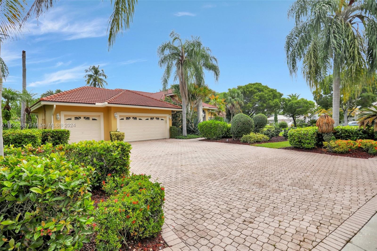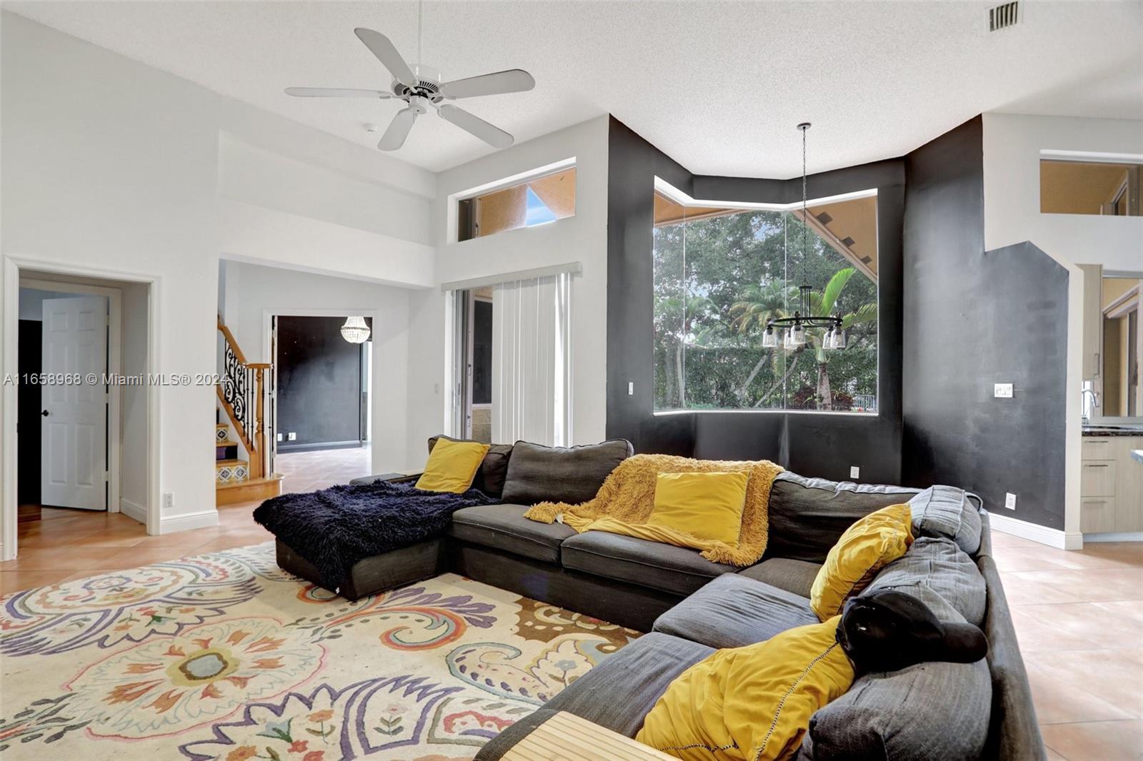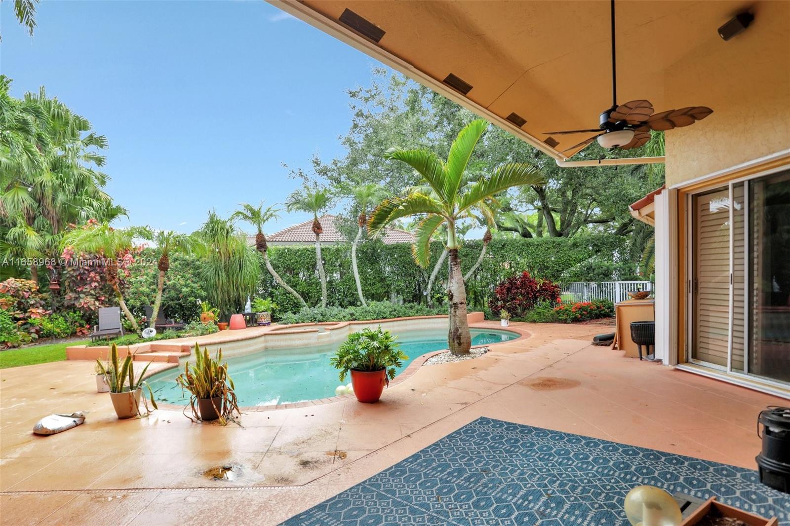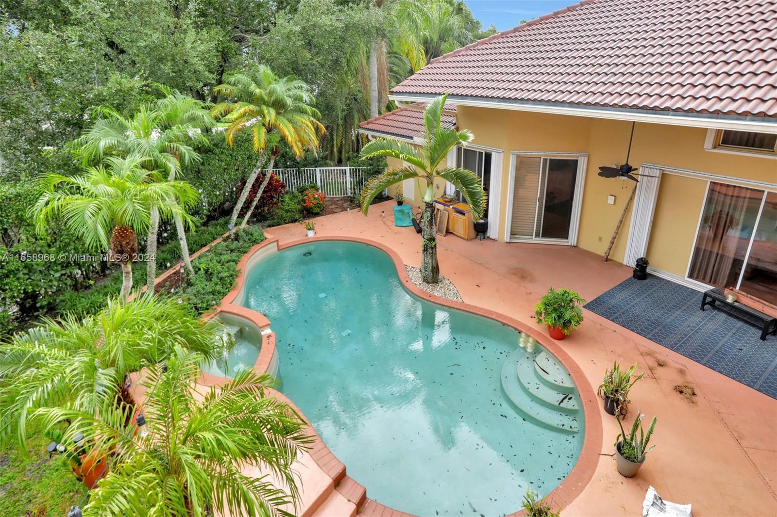 This expansive 7-bedroom, 5.5-bath estate is located in the prestigious, guard-gated community of Eagle Trace. Set on a generous pie-shaped lot spanning over a third of an acre, the home boasts lush, upgraded landscaping, a paver driveway, hurricane shutters, and a secluded backyard featuring a heated pool, spa, and an oversized pool deck. Inside, you'll find a large and open Kitchen, soaring volume ceilings, and a master suite with separate "his and her" bathrooms and walk-in closets. Upstairs, there's a private bedroom suite with a full bath and balcony overlooking the pool. The garage includes an air-conditioned office (non-permitted), along with a Tesla charger and extra refrigerator, both of which stay with the home. EASY TO SHOW.