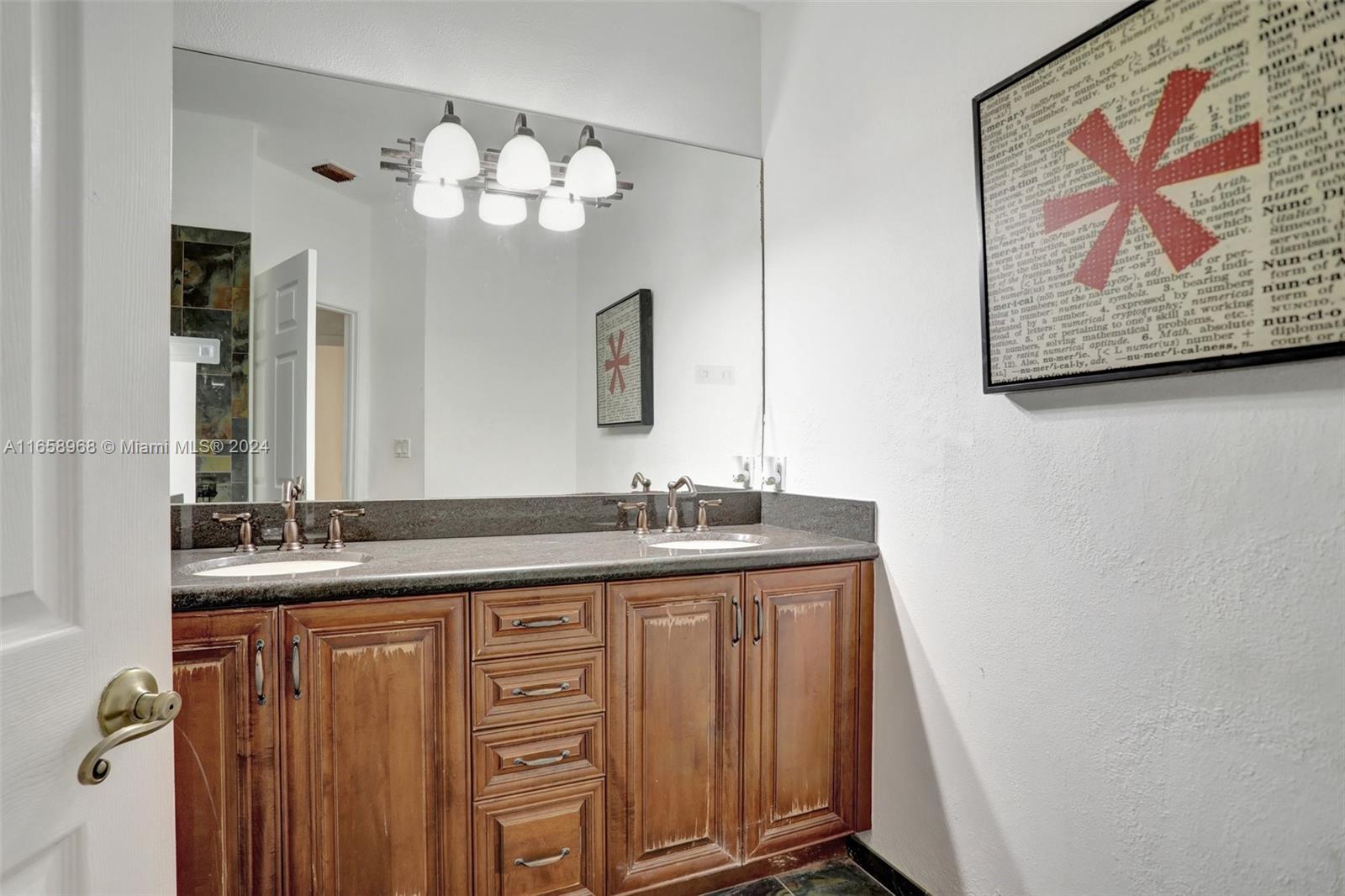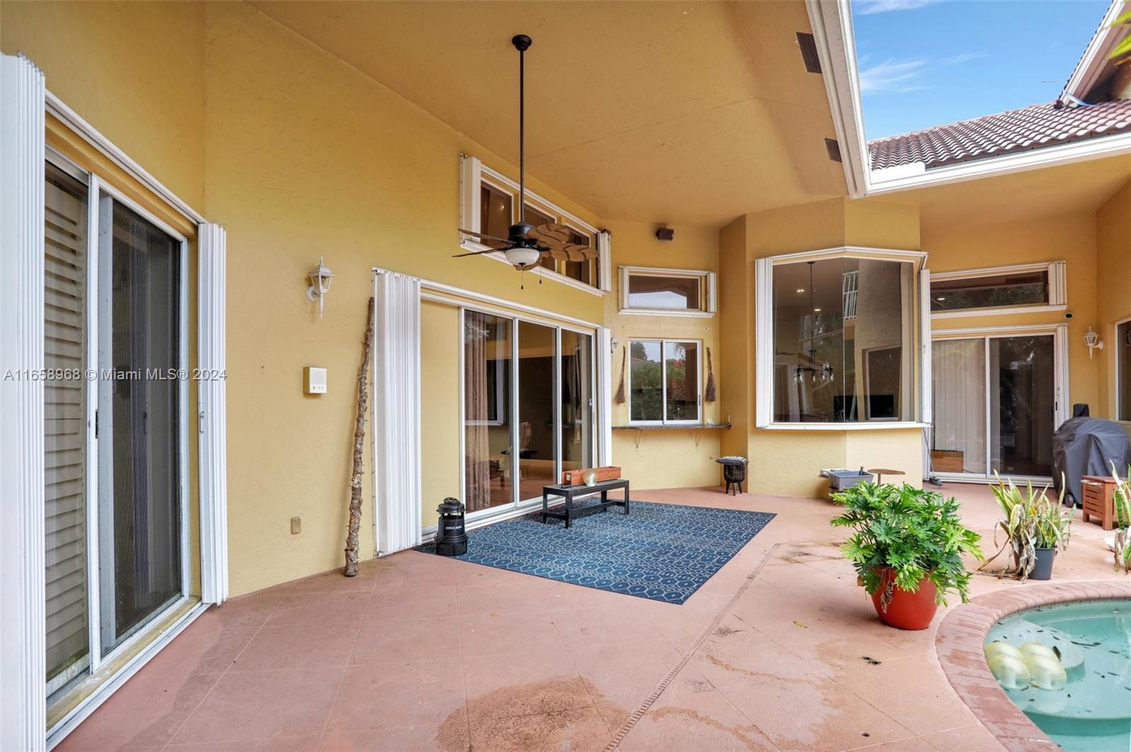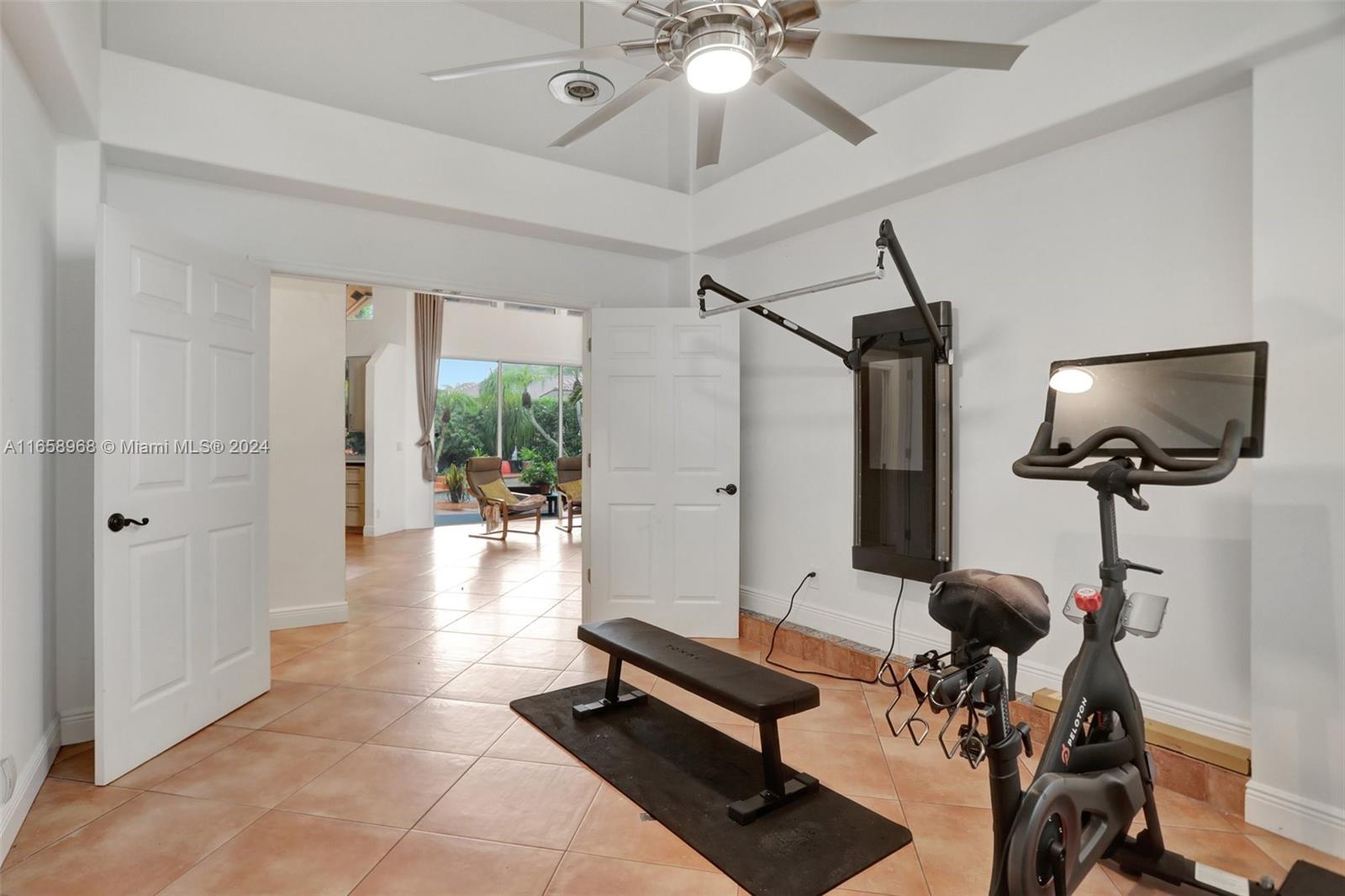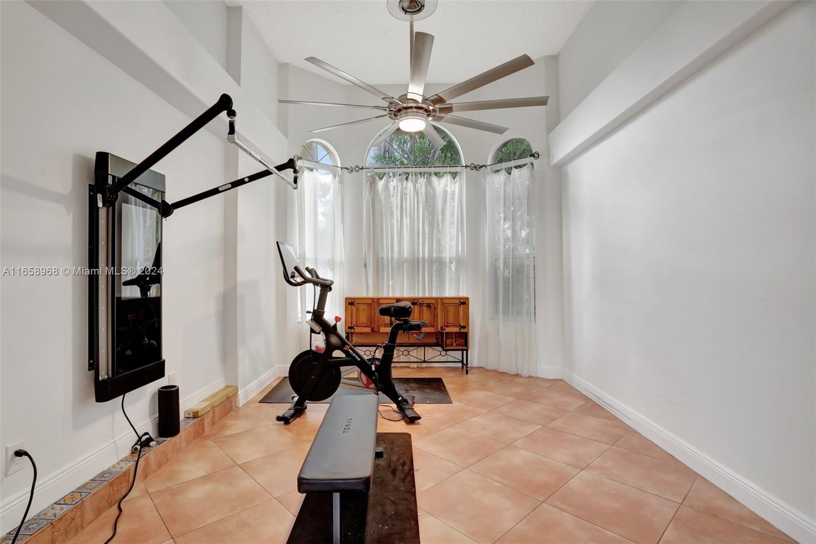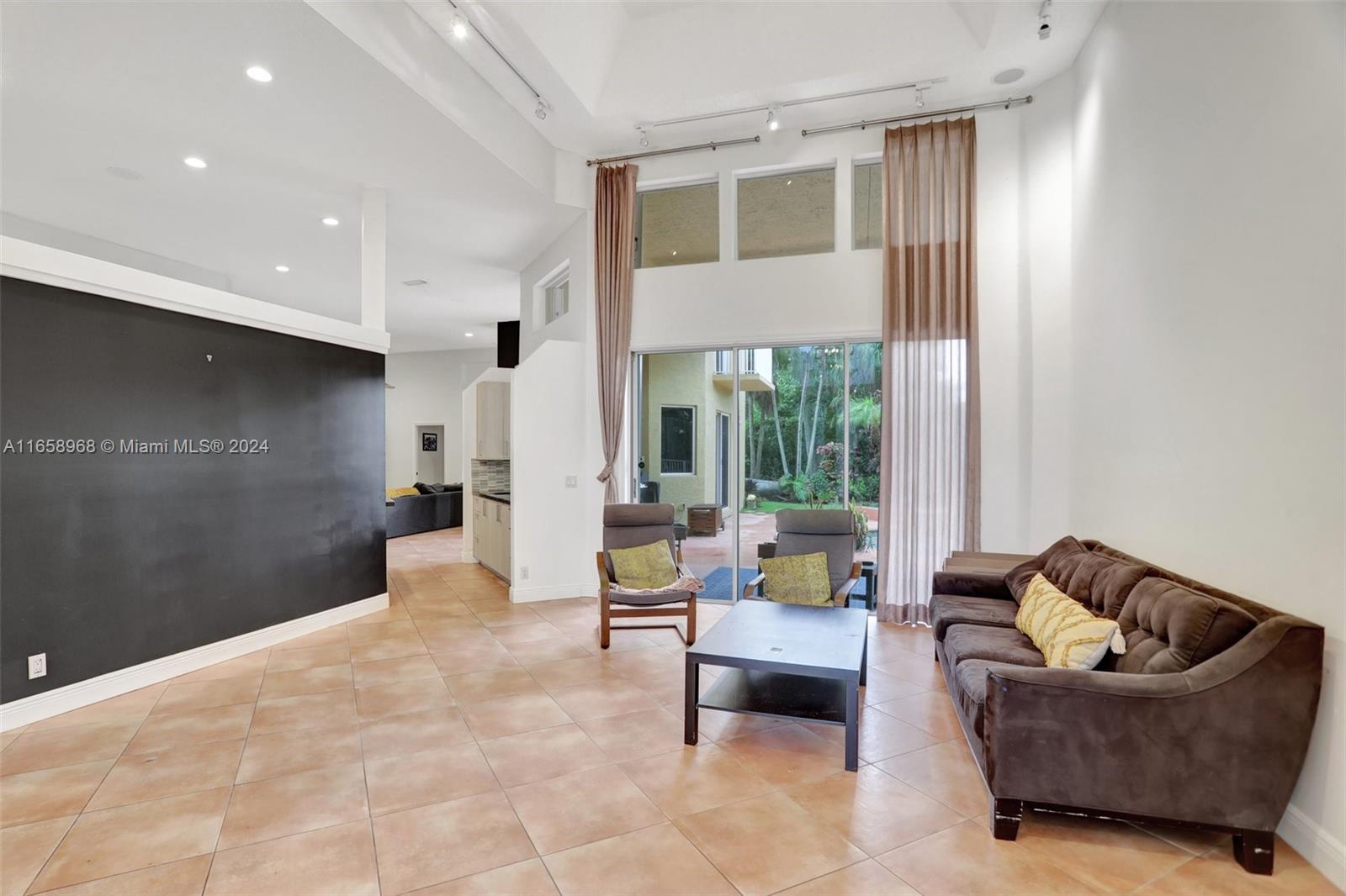 This expansive 7-bedroom, 5.5-bath estate is located in the prestigious, guard-gated community of Eagle Trace. Set on a generous pie-shaped lot spanning over a third of an acre, the home boasts lush, upgraded landscaping, a paver driveway, hurricane shutters, and a secluded backyard featuring a heated pool, spa, and an oversized pool deck. Inside, you'll find a large and open Kitchen, soaring volume ceilings, and a master suite with separate "his and her" bathrooms and walk-in closets. Upstairs, there's a private bedroom suite with a full bath and balcony overlooking the pool. The garage includes an air-conditioned office (non-permitted), along with a Tesla charger and extra refrigerator, both of which stay with the home. EASY TO SHOW.