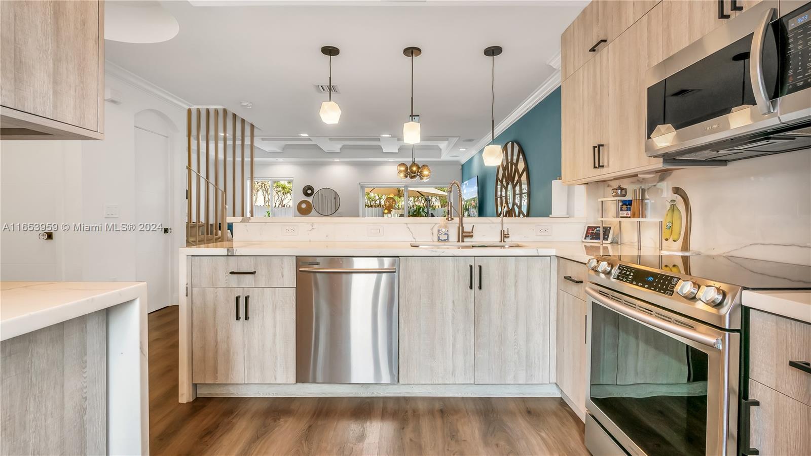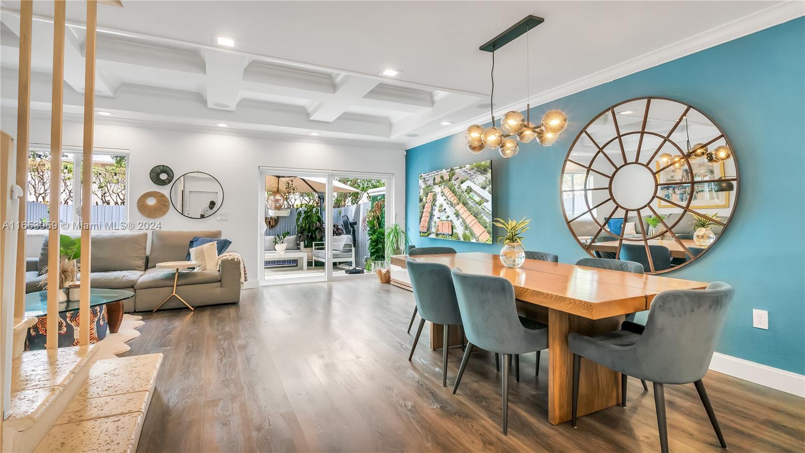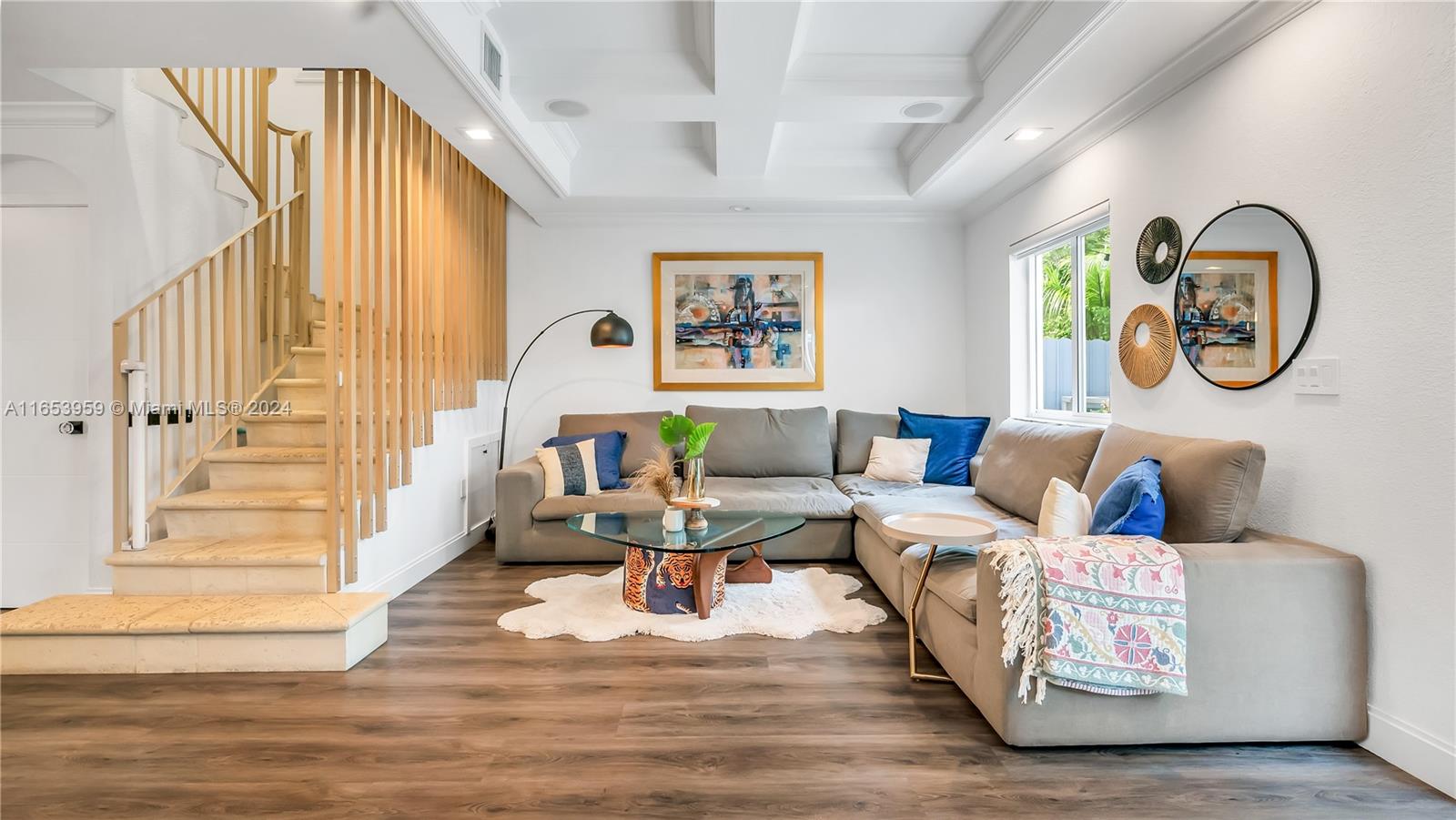 Stunning 3-bedroom, two full bathrooms, and half bath downstairs, with two assigned parking spaces, all impact windows, and sliding doors. Perfect for both comfortable living and entertaining with high ceilings. An open-concept design that seamlessly connects the living room, dining area, kitchen, stainless appliances, and marble countertops. Luxurious three bedrooms, with a master suite with a private bath with a huge master closet, two full bathrooms, and one half bath downstairs, with contemporary fixtures and an outdoor oasis patio. The private backyard offers the perfect relaxation space and outdoor gatherings. A gated community is located close to Whole Foods, Ross, Aldi, Michaels, etc., within walking distance to shops, dining, entertainment, and a tennis center.