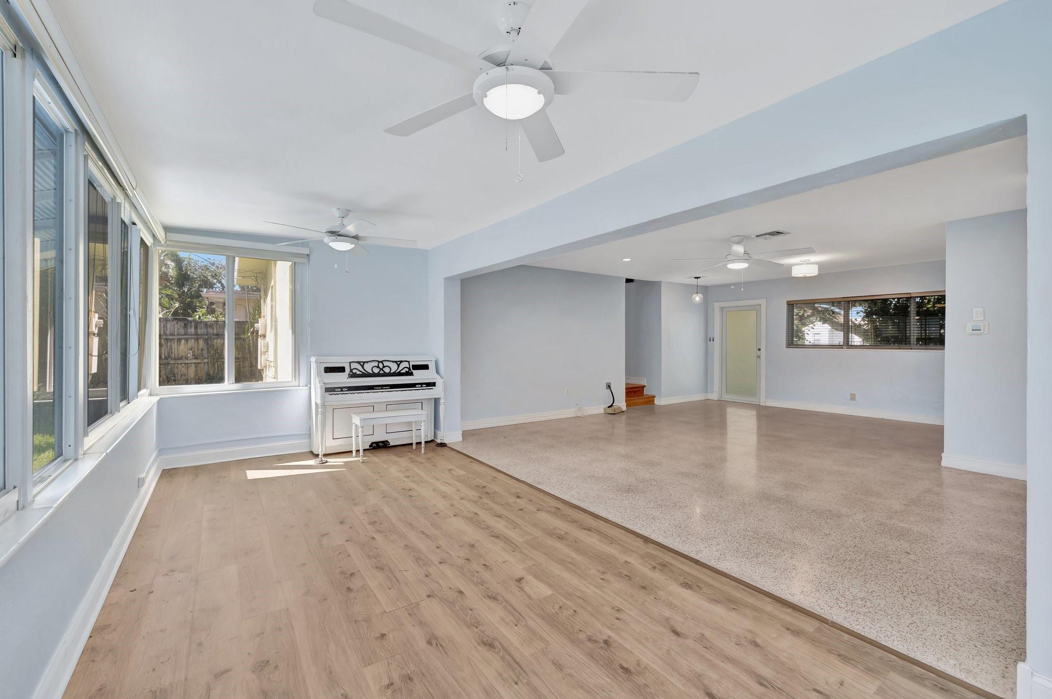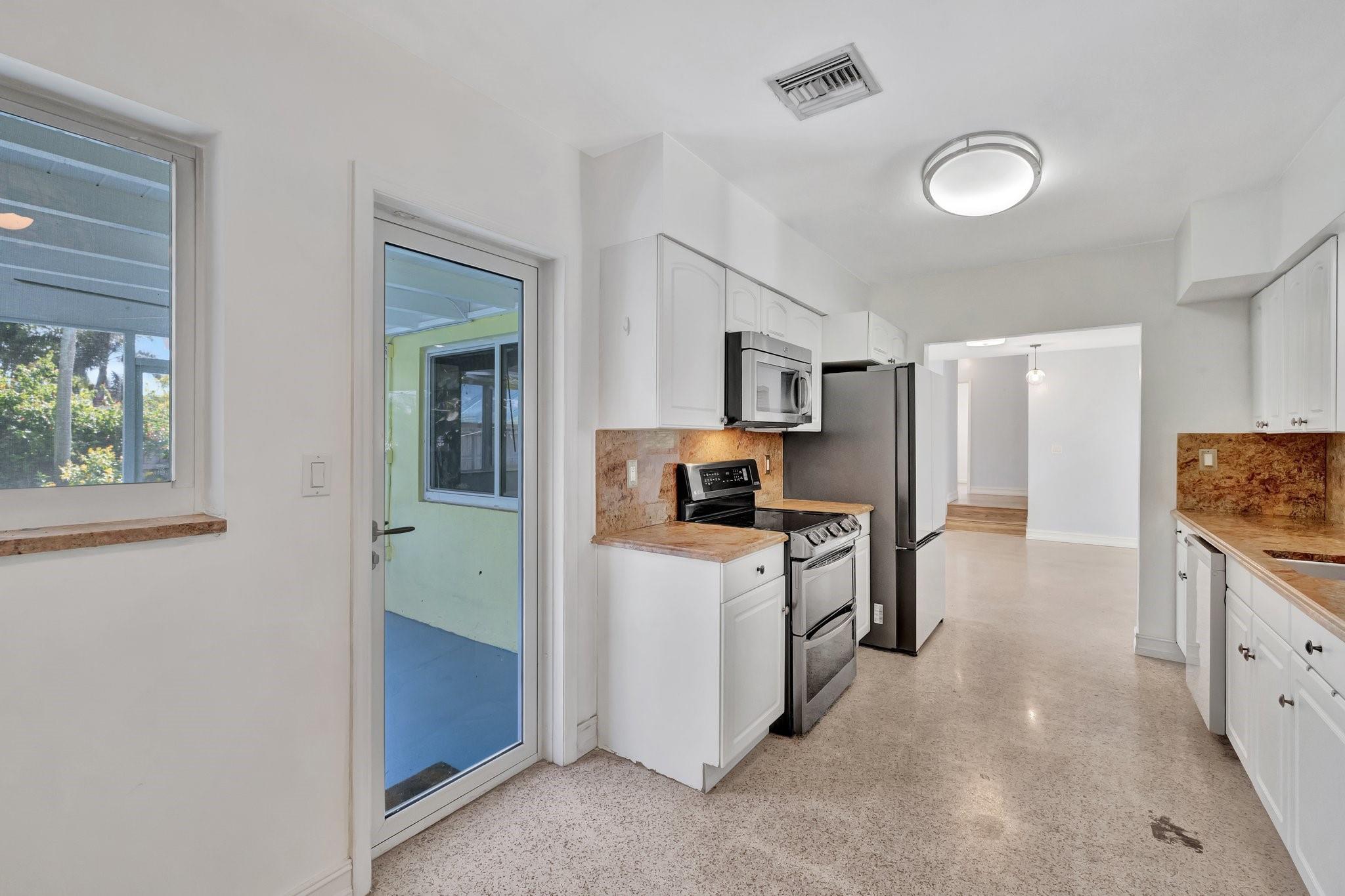 This home has the perfect blend of value and convenience on the east side of I-95. The property is double gated with both the back yard & front yard being fully gated. Circular drive & carport offer ease when pulling out of the driveway and plenty of parking space. Impact windows throughout for a quiet interior. Fresh paint on the exterior & a new raised floor in the sunroom to level the living space to match. Terrazzo and Wood floors have been refinished. New gutters & 2, 50 gallon rain barrels with down spouts help to efficiently manage and re-use rain water. Appliances are new and storage space is abundant. Screened back porch & lush tropical landscape for enjoyment of the outdoors await. Indoor Laundry room. Walk-in closet in primary suite. Spacious kitchen.