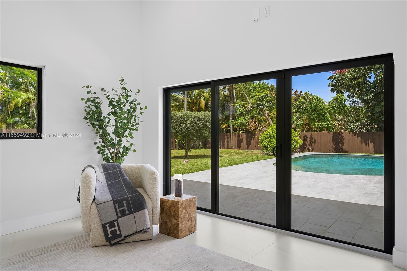 Ultra-modern, fully renovated home offers 5 bed and 5 bath, 3,300 SF liveable with 12ft high ceilings. The open layout creates a bright, airy feel, seamlessly connecting the living room, dining area, and gourmet kitchen, featuring top-tier appliances, MiaCucina Italian cabinets kosher kitchen double sink. Primary bedroom opens directly to the splendid backyard, where you'll find a large pool perfect for lounging and entertaining. The luxurious en-suite bath offers a double sink, soaking tub, and walk-in shower, while the ultra luxury and spacious walk-in closet provides ample storage. Four additional bedrooms feature en-suite bathrooms, and a convenient cabana bath is ideal for poolside days. This home exudes modern elegance and thoughtful design, ideal for hosting and outdoor enjoyment.