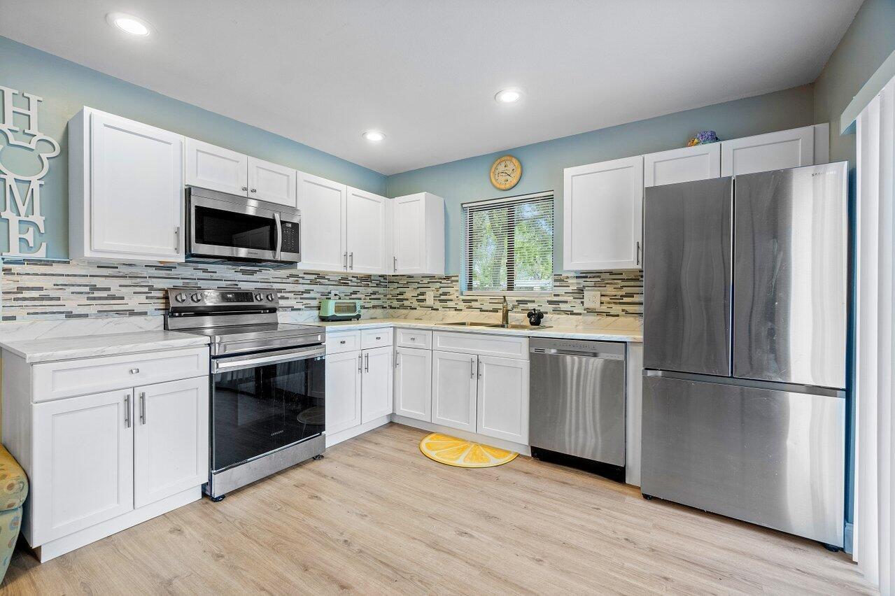 Picture yourself in this charming two-story townhouse, in a very central location. Close to shopping and restaurants, minutes from the highways I95 and FL Turnpike and a short drive to the lively downtown area filled with restaurants and shopping and entertainment and the beautiful intercoastal. Close to Palm Beach International Airport for convenience. Tastefully updated 2 bdrm 1 1/2 bath with a newly updated kitchen, and new laminate floors throughout the home. Laundry shoot from the linen closet in the bathroom. Spacious closets, and balconies in each bedroom, overlooking your private, fenced-in patio. Bright and light townhome.