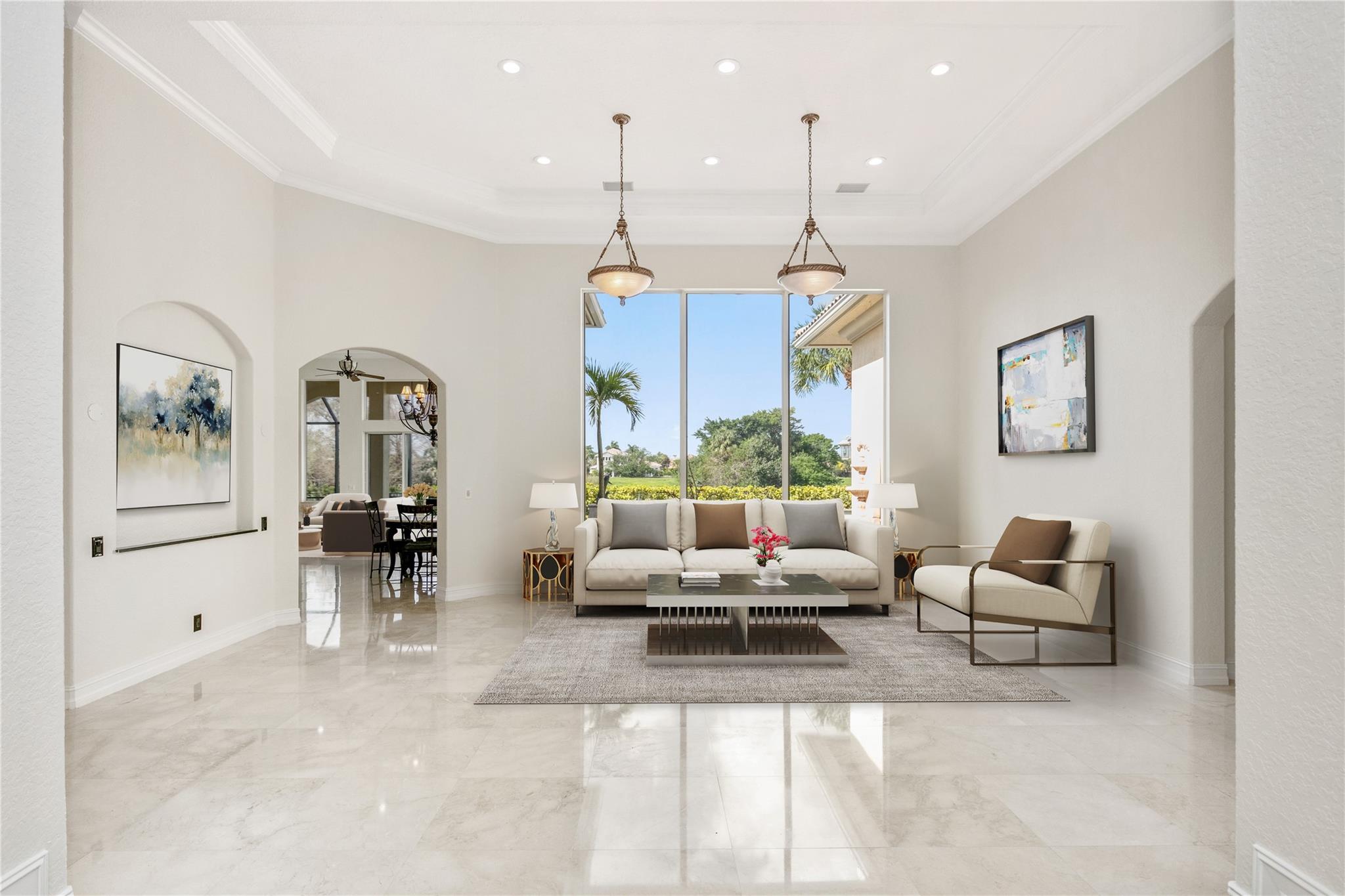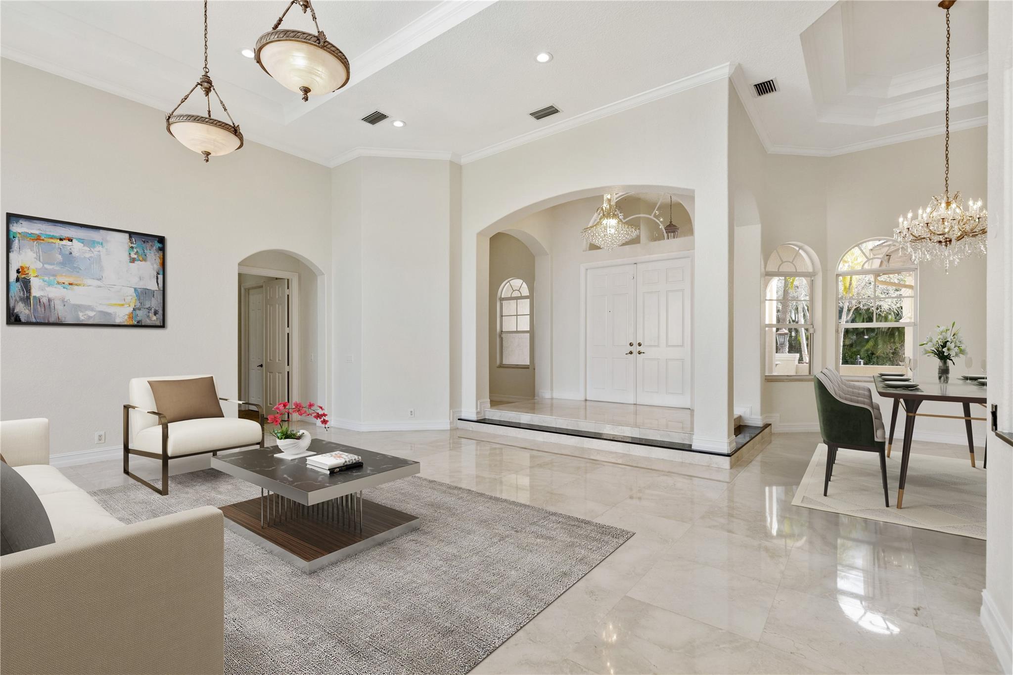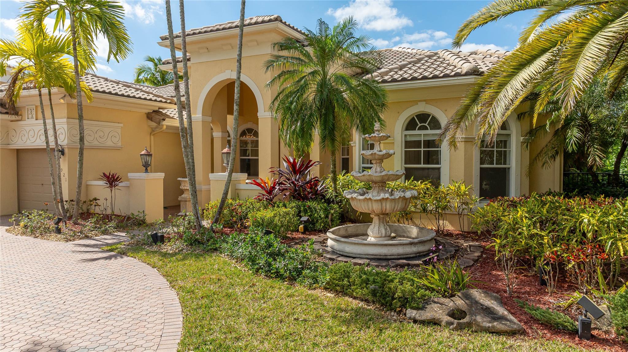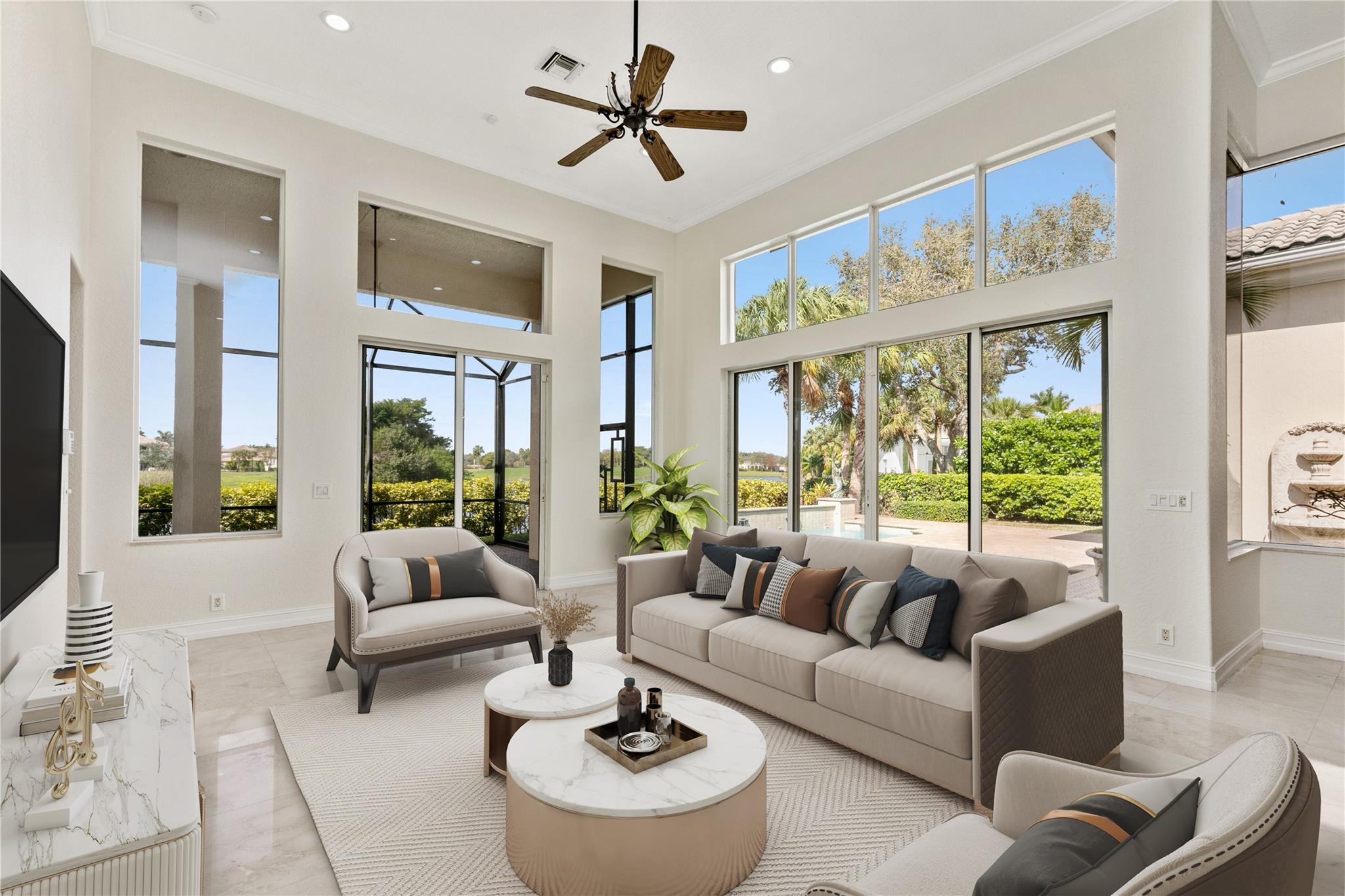 If a spacious private lot is what you're in search for, this waterfront property w/ no rear neighbors is a must-see! The nearly 100-foot-wide lot offers both privacy & stunning vistas. Inside, you're greeted by 14-foot volume ceilings & newly polished marble floors that enhance the open & airy layout. Large picture windows flood the home w/ natural light & the exceptional floor plan includes a generously sized living room, formal dining room & family room—all w/ panoramic views of the pool & water. Additional features include a circular driveway, crown molding, freshly painted interior, a large screened-in patio, & an open pool overlooking the water. Located in the amenity-rich Heron Bay community, residents have access to tennis, pickleball, fitness center, resort-style pools & more.