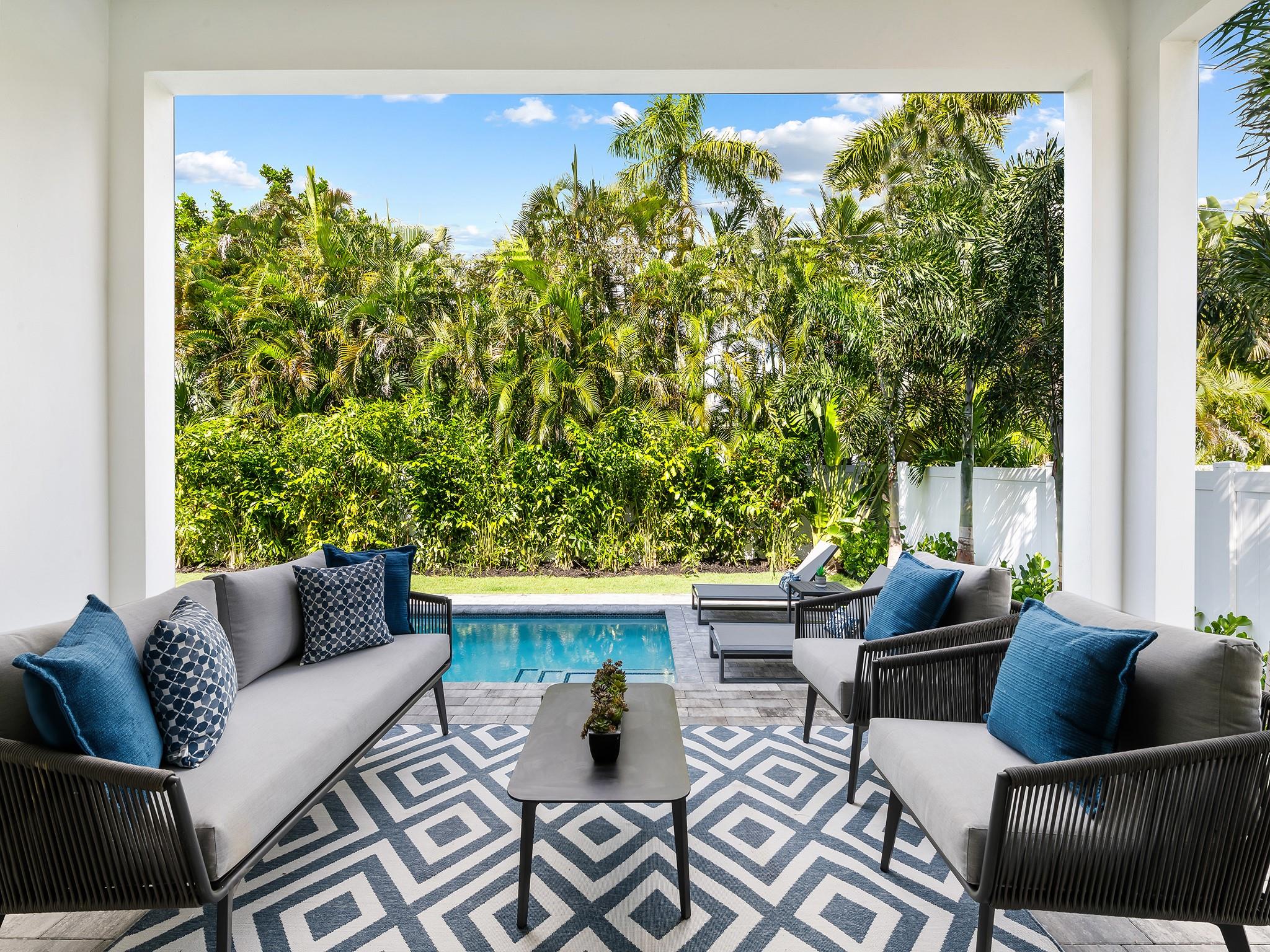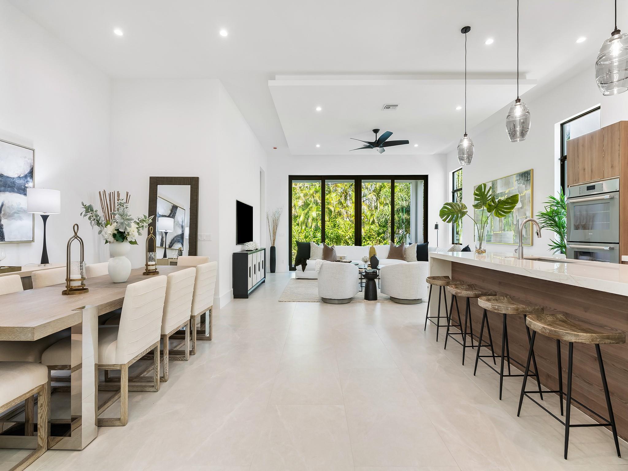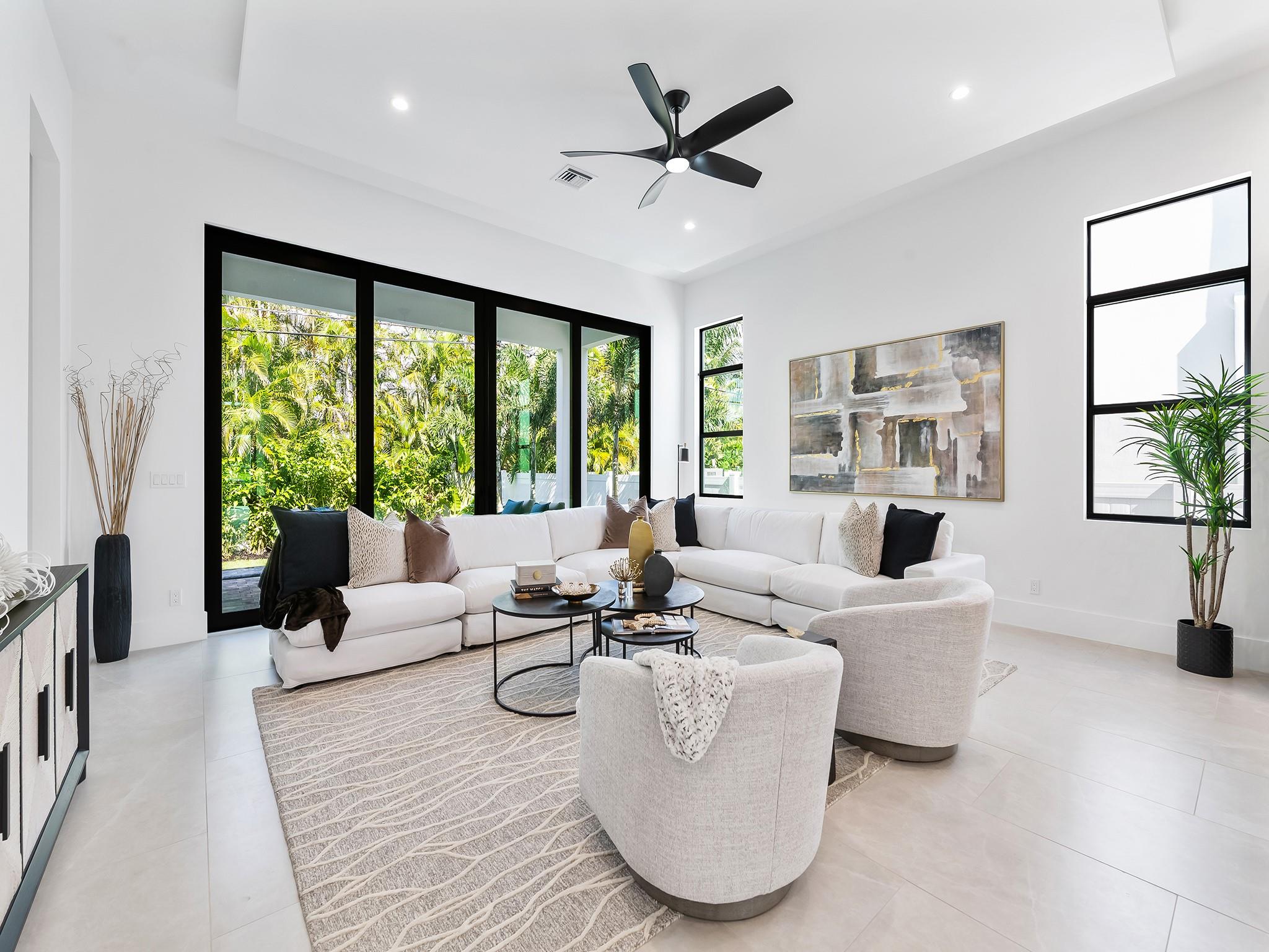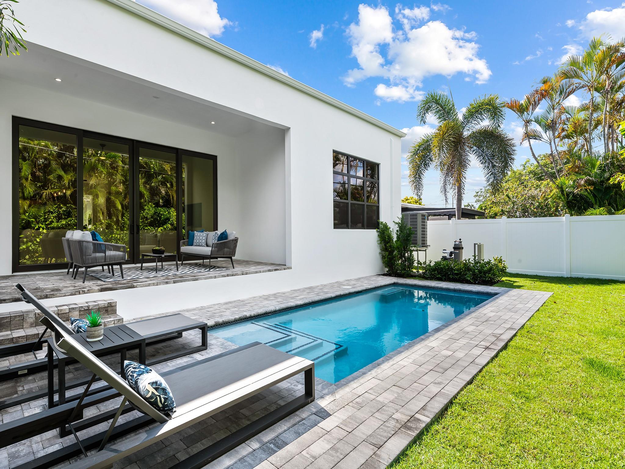 ** NEW CONSTRUCTION NOW READY FOR OCCUPANCY ** Contemporary architecture in E. Fort Lauderdale. Every element of this 1 story home has been designed to cultivate today's lifestyle with modern luxuries & open concept living areas. The moment you enter the 15 ft foyer your eye is drawn to a wall of sliding glass doors that opens onto a lrg covered lanai, pool, patio area & tropical backyard. 12 ft ceilings enhance the luminous flr plan & spacious living areas. The gourmet kitchen features upgraded appliances, a large center island for entertaining & pantry. The primary suite boasts 2 walk-in closets & lavish bathrm. 2 additional ensuite bedrooms, optional home office or 4th bedroom, 1/2 bathroom & laundry rm complete the floor plan. Sq. ft. from developer
