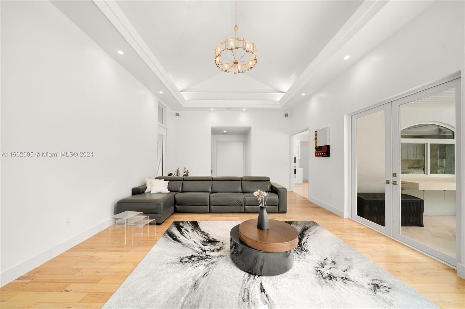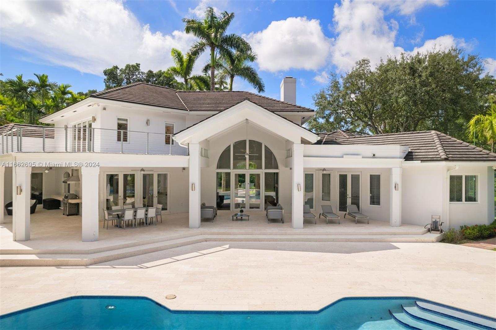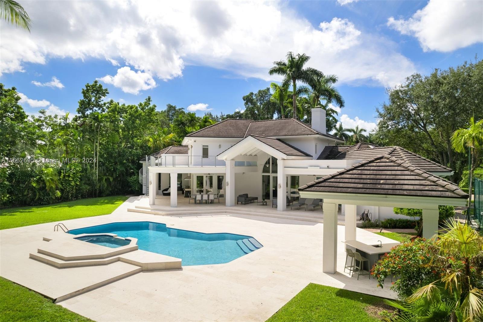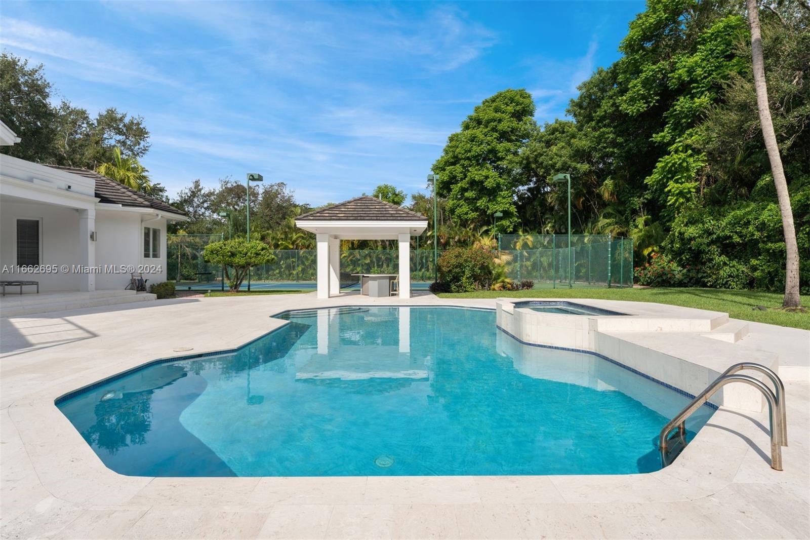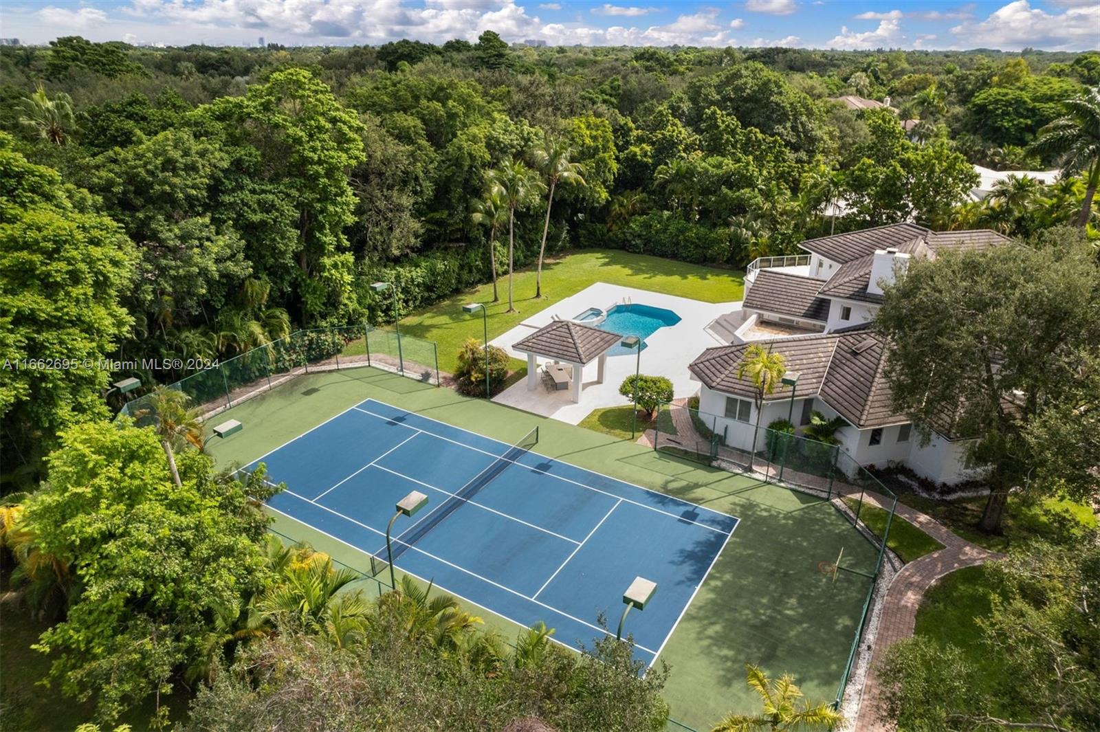 Spacious 9,018 SF, 6-BD, 5.5-BA contemporary residence on a sprawling acre-plus lot in coveted North Pinecrest area. The carefully curated layout offers modern elegance, volume ceilings, and natural light through oversized windows. The expansive eat-in kitchen has custom cabinetry, large center island, premium appliances, and pantry. The backyard features a spacious covered terrace, sparkling saltwater pool with waterfall jacuzzi, wet bar, and newly resurfaced lighted tennis court, in lush manicured grounds with mature trees providing optimal privacy. Additional features include impact windows and doors, smart home system, new staircase, fireplace, ample parking, and insulated 2-car garage with epoxy flooring and AC.