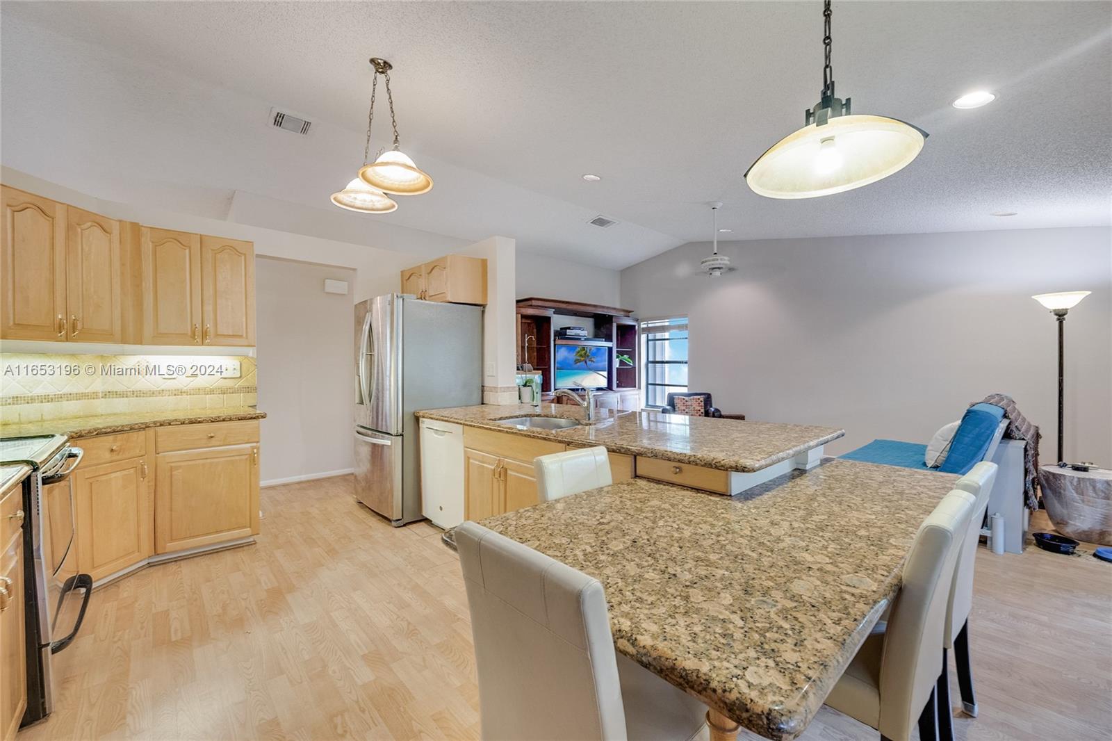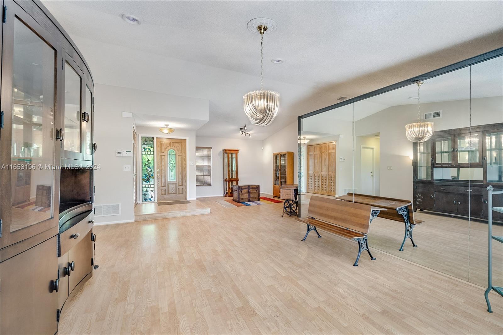 Beautiful ranch-style home, located in the highly desirable neighborhood of Shenandoah. Featuring 4 spacious bedrooms & 2 bathrooms, the split bedroom floor plan provides privacy, while the master bedroom boasts an en-suite bath. The open-concept kitchen includes an eat-in area & flows seamlessly into the living spaces, which include a formal dining room, living room, and family room, all filled with abundant natural light and volume ceilings. Outside, enjoy the tropical landscaping, fenced-in yard, & the screened-in patio. The front porch adds charm & the garage comes complete w/ a workshop & storage. Have peace of mind with hurricane accordion shutters and back up generator. Minutes away from A-rated schools, parks & highways, home offers convenience & an ideal setting for family living.