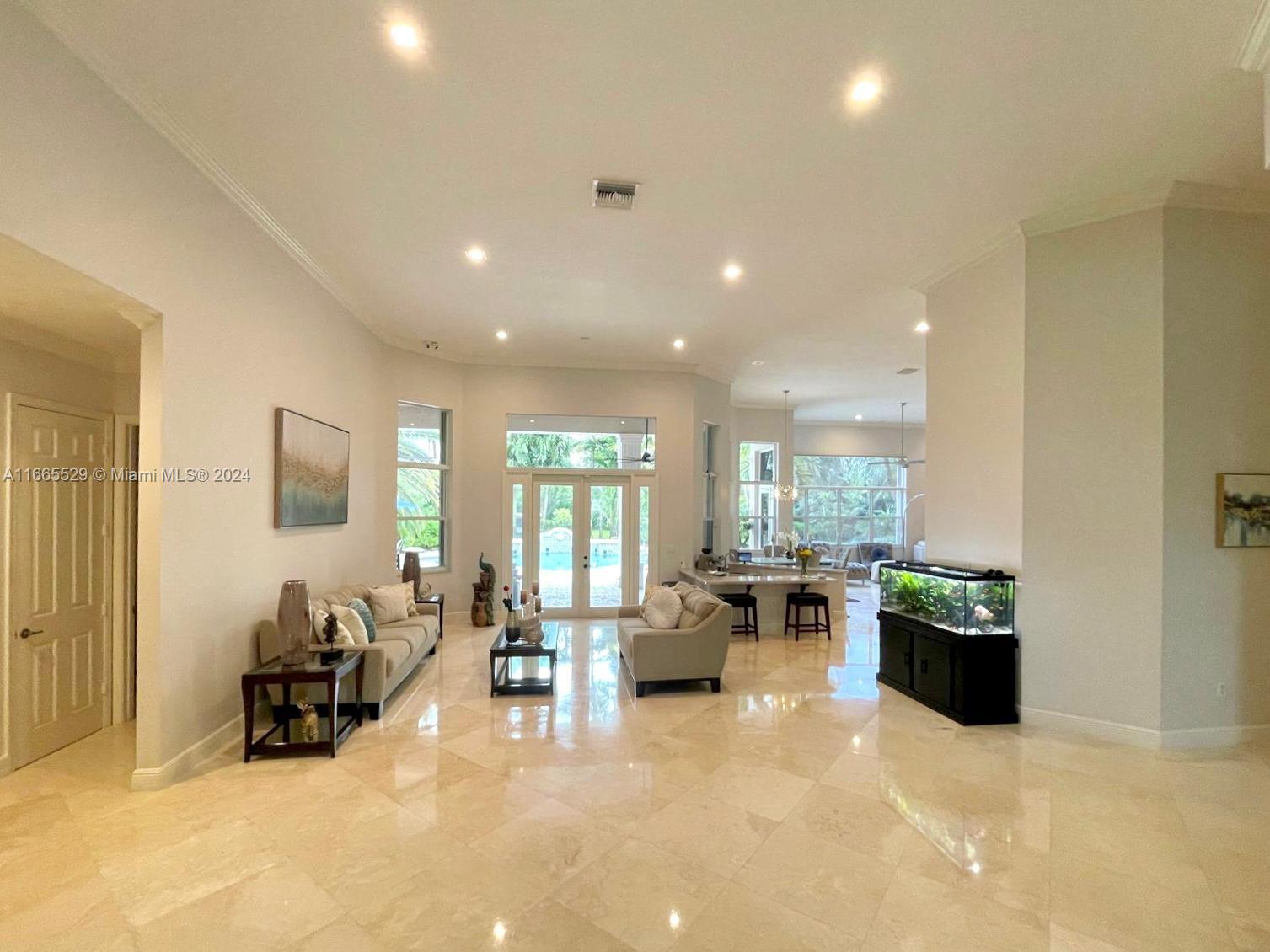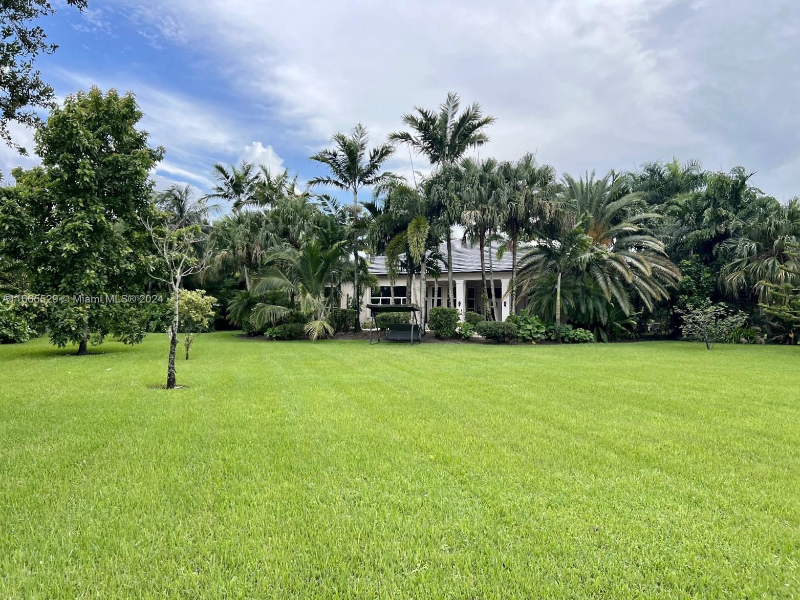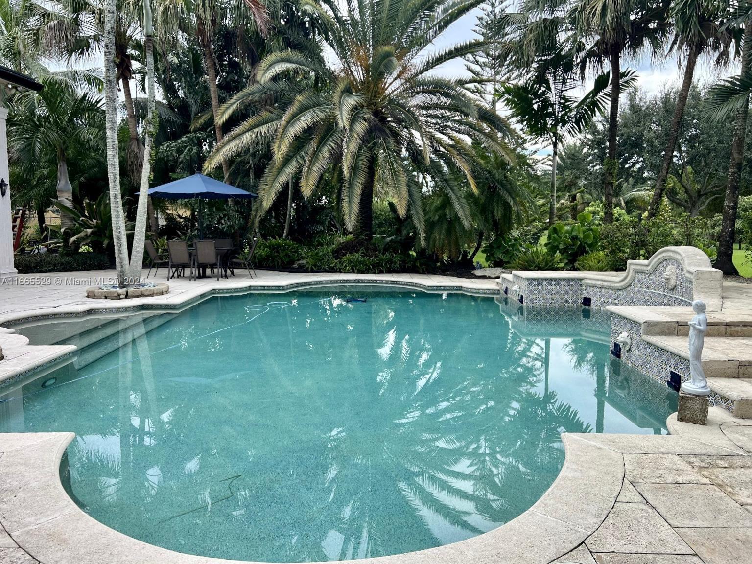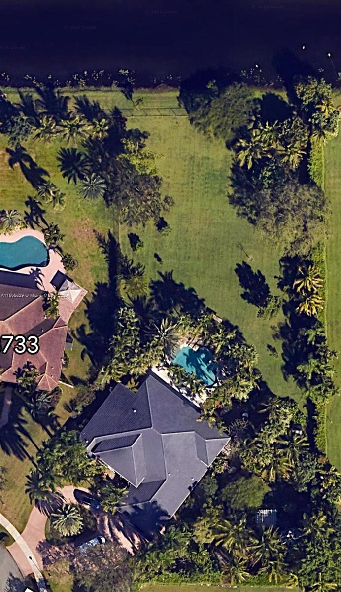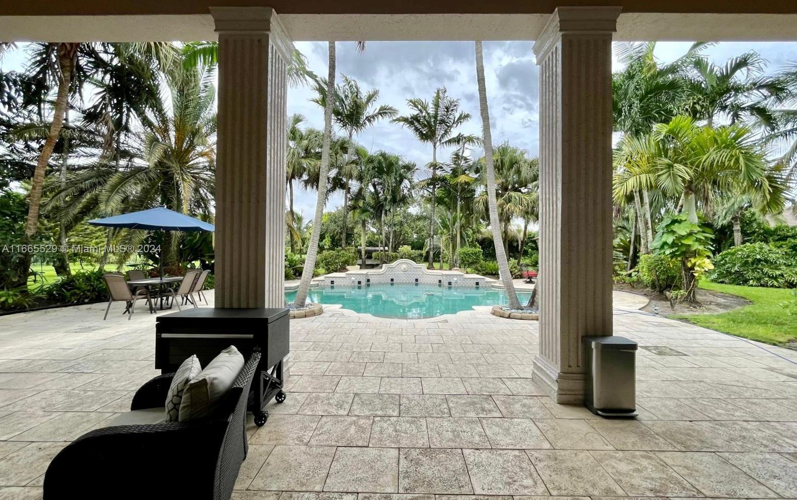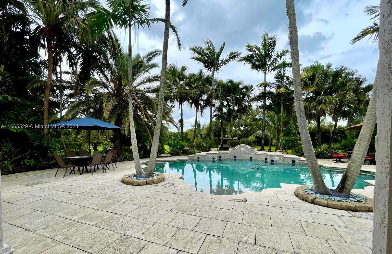 This amazing home is located on 1 1/2 acre water lot with palms & fruit trees. It has a circular paved driveway, with 3 car garage, split floor plan & 15ft high ceilings. The best fixtures are the new kitchen, designed by Mia Cucina & Wolf appliances; roof from 2024, new main electrical panel from 2023, 3 AC from 2023, impact windows & shutter combination & the last generation Tesla charger located in the garage. One of the garages has been converted into a Gym with a Sauna! The entrance leads to the main space, to the left, office & the master bedroom with a modern bathtub & huge walk-in shower. to the right, 3 bedrooms with baths, laundry, gym & garage. The backyard has a lot of potential, enough space for a mini golf and tennis court.