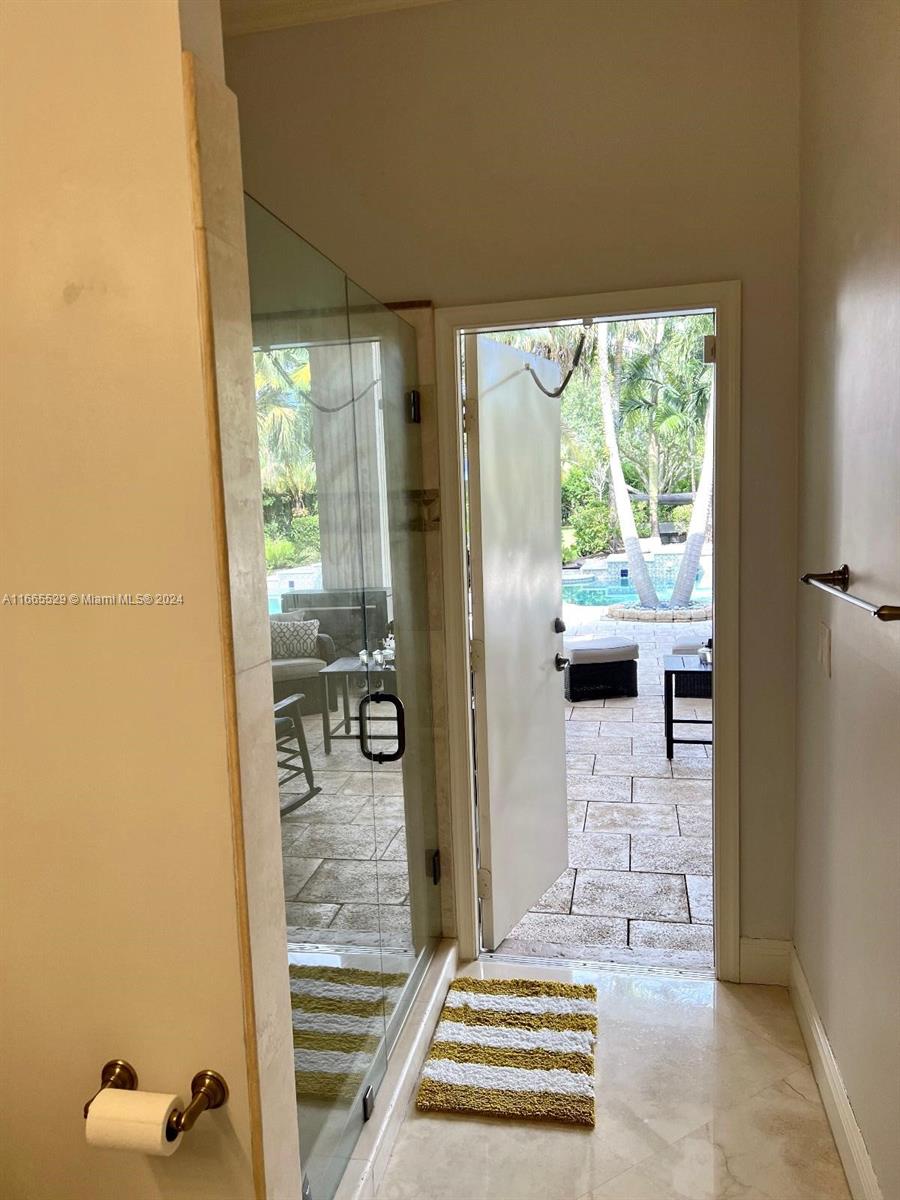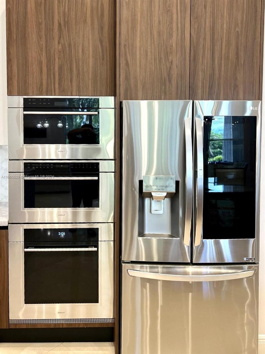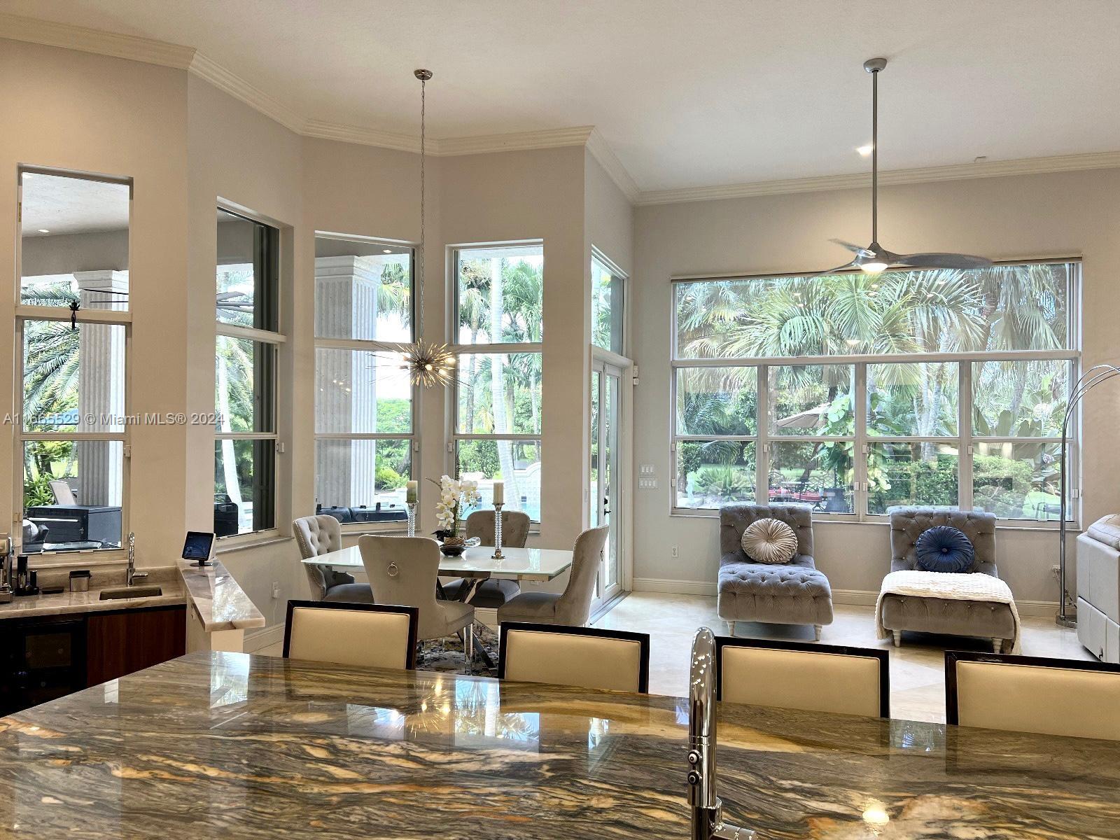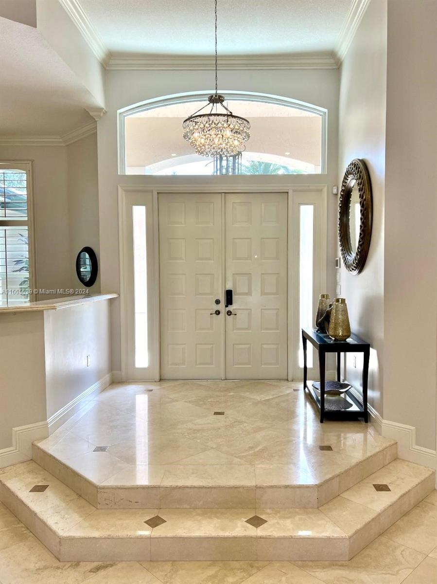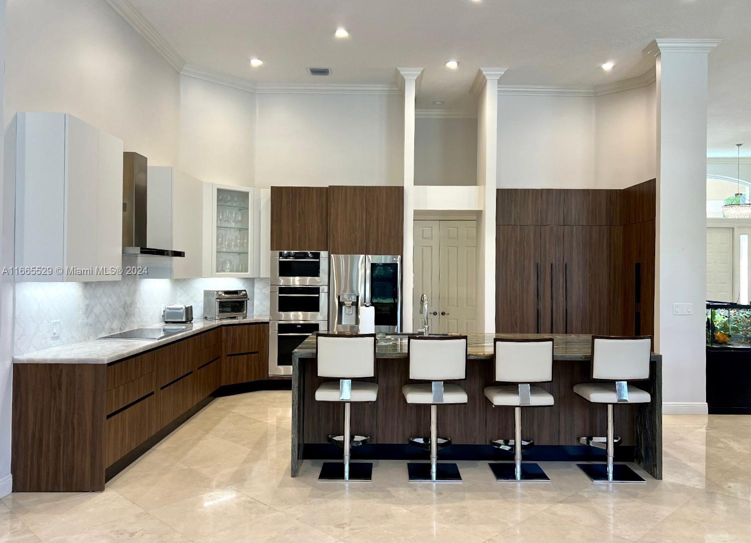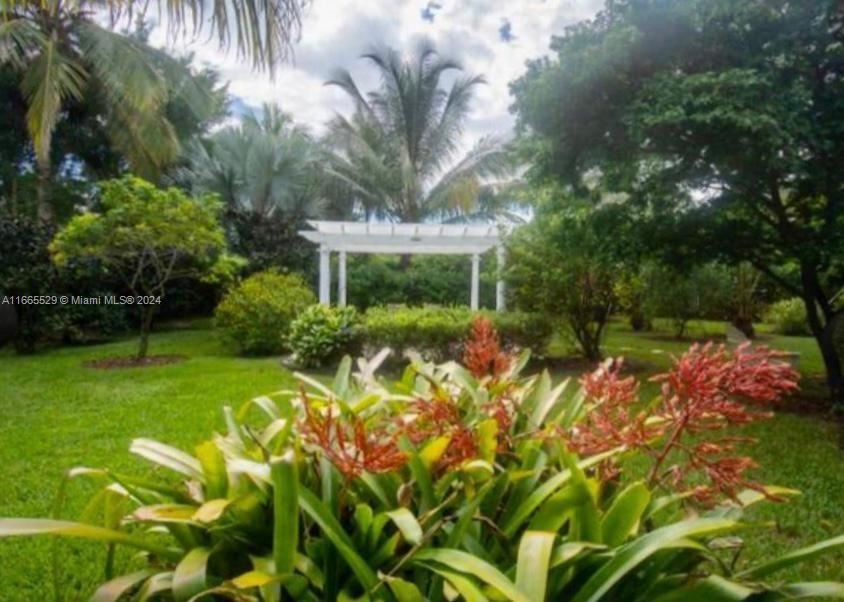 This amazing home is located on 1 1/2 acre water lot with palms & fruit trees. It has a circular paved driveway, with 3 car garage, split floor plan & 15ft high ceilings. The best fixtures are the new kitchen, designed by Mia Cucina & Wolf appliances; roof from 2024, new main electrical panel from 2023, 3 AC from 2023, impact windows & shutter combination & the last generation Tesla charger located in the garage. One of the garages has been converted into a Gym with a Sauna! The entrance leads to the main space, to the left, office & the master bedroom with a modern bathtub & huge walk-in shower. to the right, 3 bedrooms with baths, laundry, gym & garage. The backyard has a lot of potential, enough space for a mini golf and tennis court.
