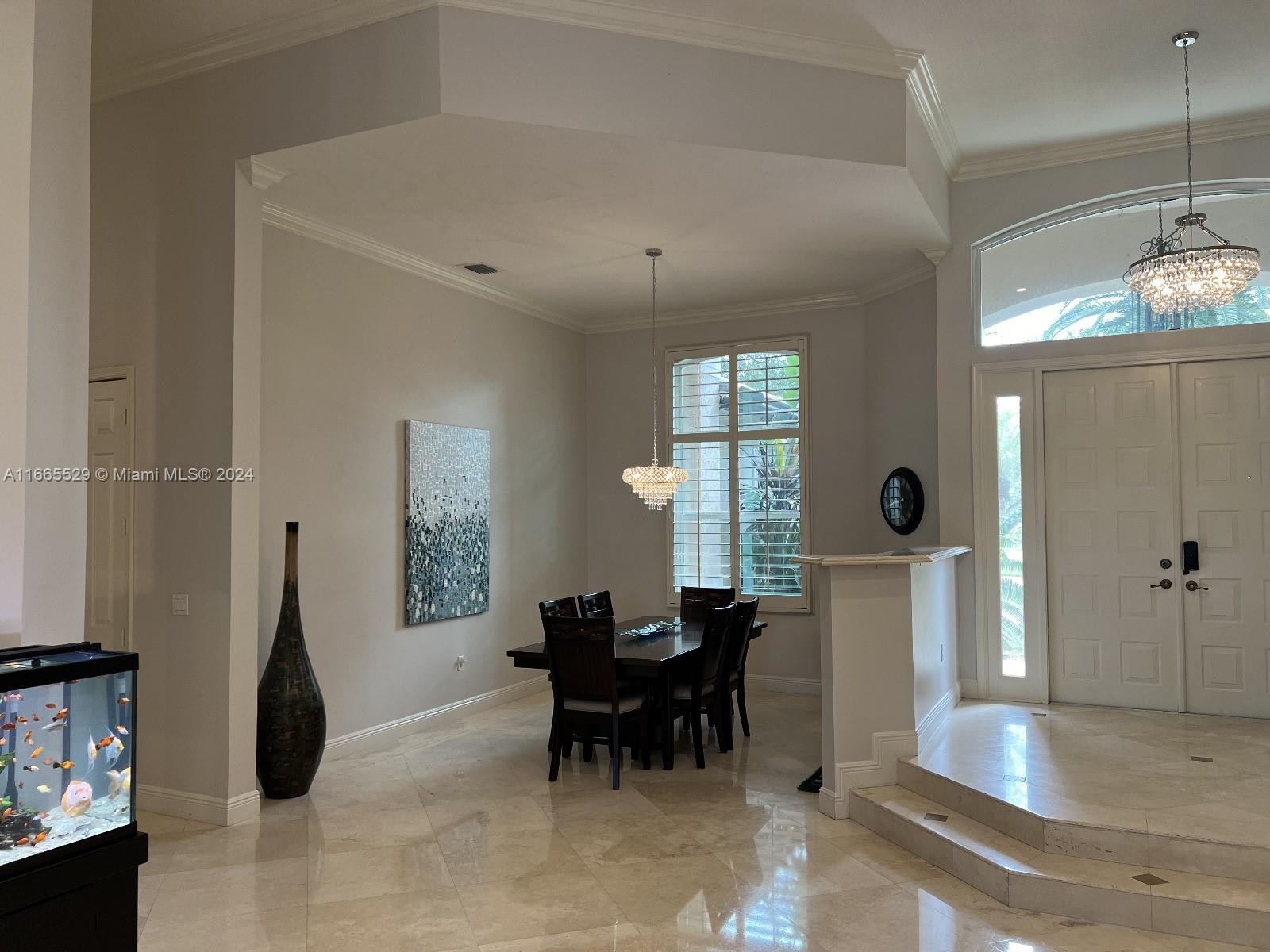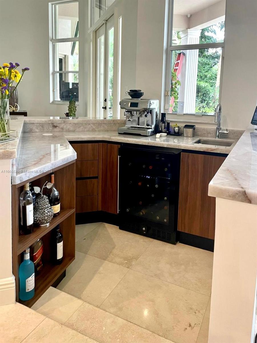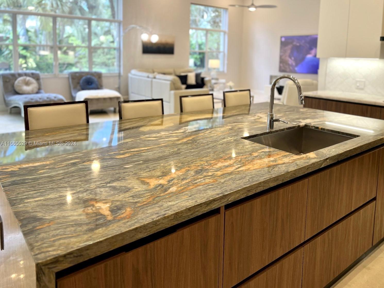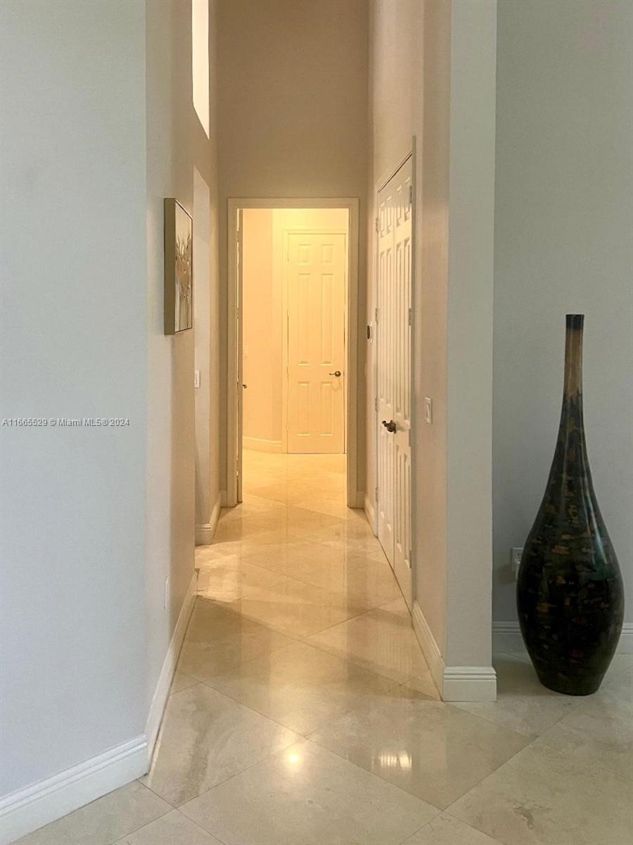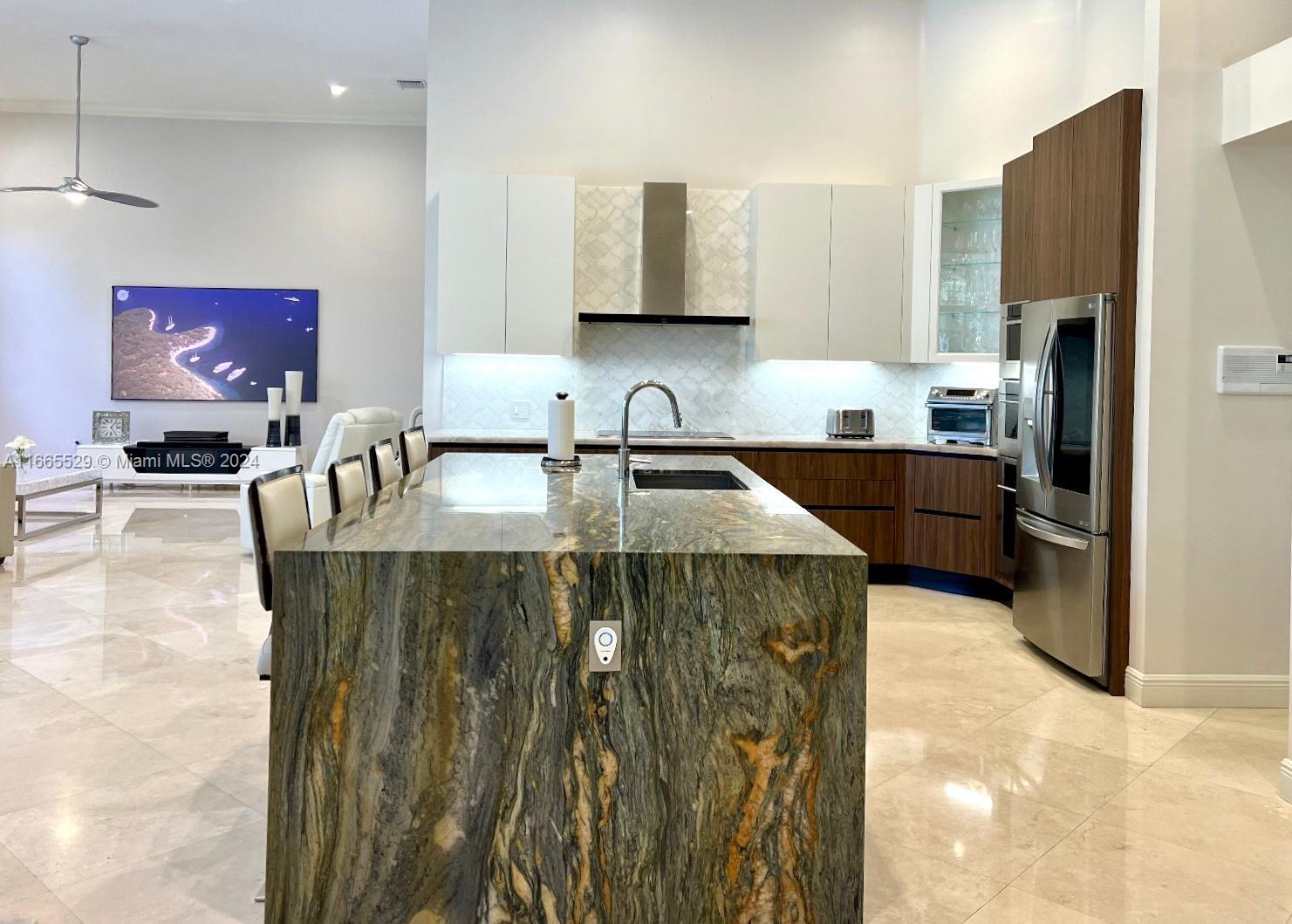 This amazing home is located on 1 1/2 acre water lot with palms & fruit trees. It has a circular paved driveway, with 3 car garage, split floor plan & 15ft high ceilings. The best fixtures are the new kitchen, designed by Mia Cucina & Wolf appliances; roof from 2024, new main electrical panel from 2023, 3 AC from 2023, impact windows & shutter combination & the last generation Tesla charger located in the garage. One of the garages has been converted into a Gym with a Sauna! The entrance leads to the main space, to the left, office & the master bedroom with a modern bathtub & huge walk-in shower. to the right, 3 bedrooms with baths, laundry, gym & garage. The backyard has a lot of potential, enough space for a mini golf and tennis court.