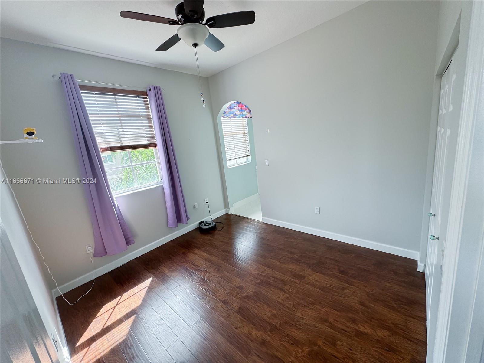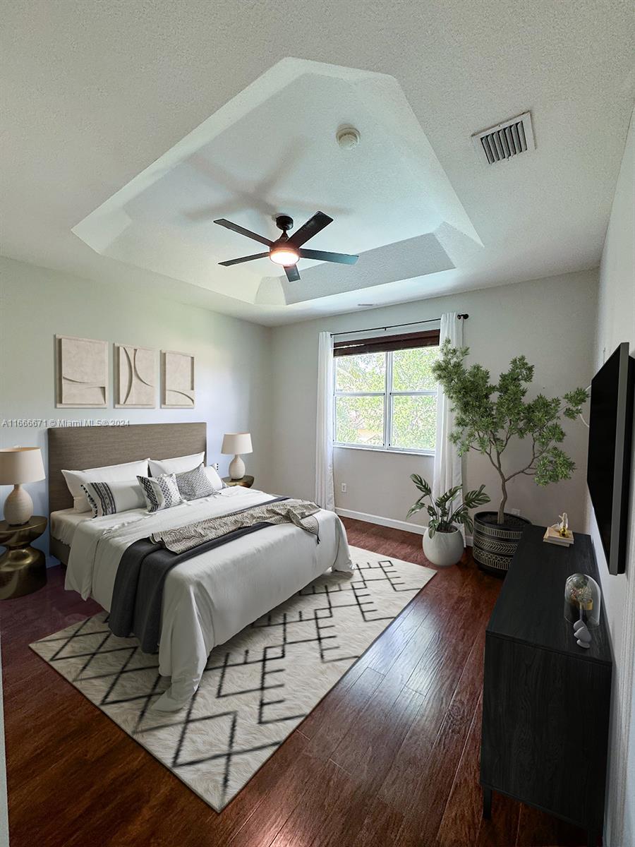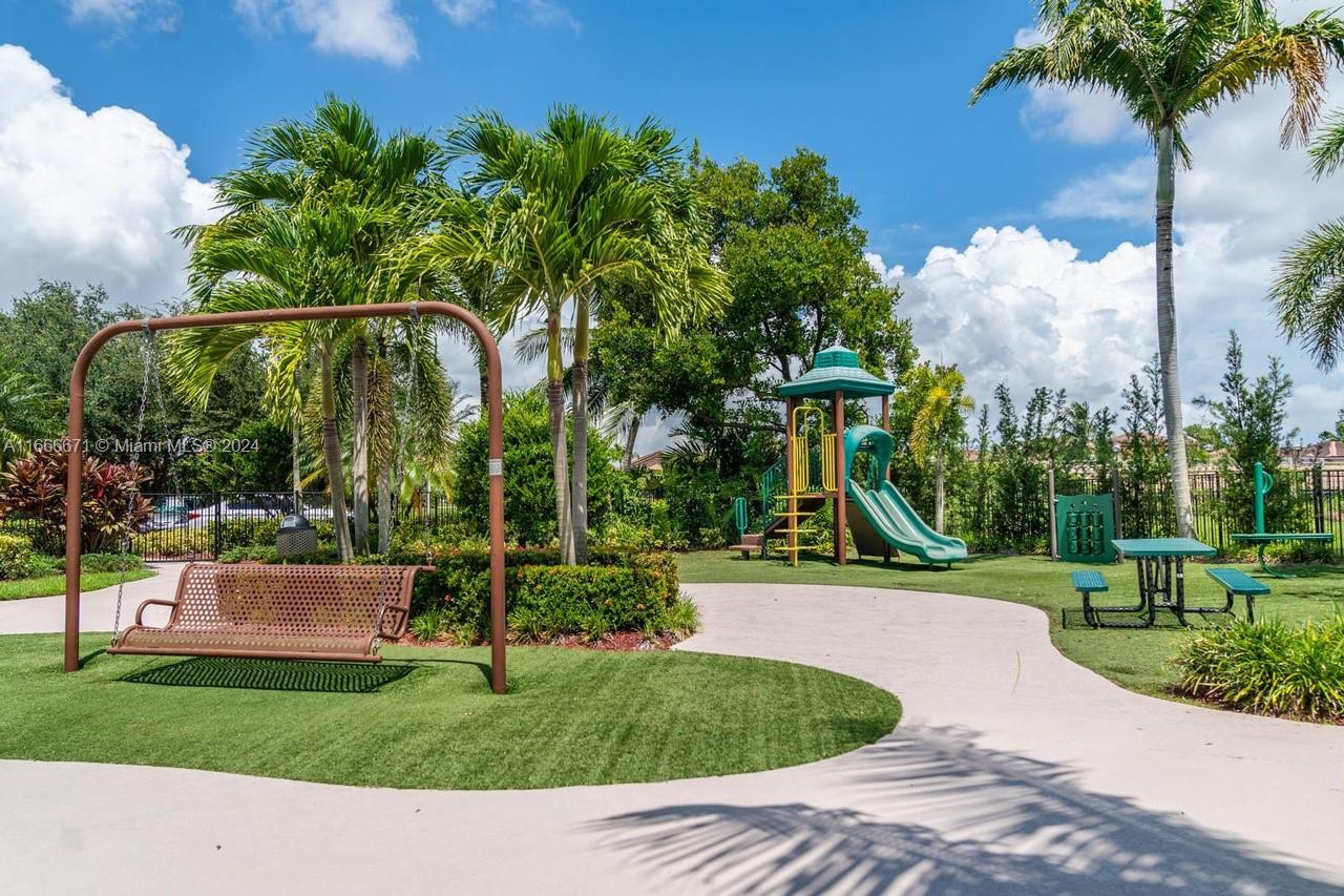 This 4-bedroom, 3-bathroom home boasts 2,347 sq. ft. in a double-gated community. Remodeled kitchen with stainless steel appliances and quartz counter tops. Family room and living room share a grand space while dining room is conveniently close to kitchen. High ceiling, 2 car garage, large private fenced backyard with plenty of room for entertaining. New full AC system. The tropical backyard includes an avocado tree, mango tree, mulberry bush, and a cozy fire pit. HOA fee is only $130 a month and includes lawn maintenance, clubhouse use, gym, pools, bbq area, playground for kids, and a secured gate. The perfect house for a family!! Built-in baby gate at the top of stairs and a jack and jill bathroom separates two rooms. One bedroom and full bathroom downstairs.